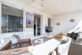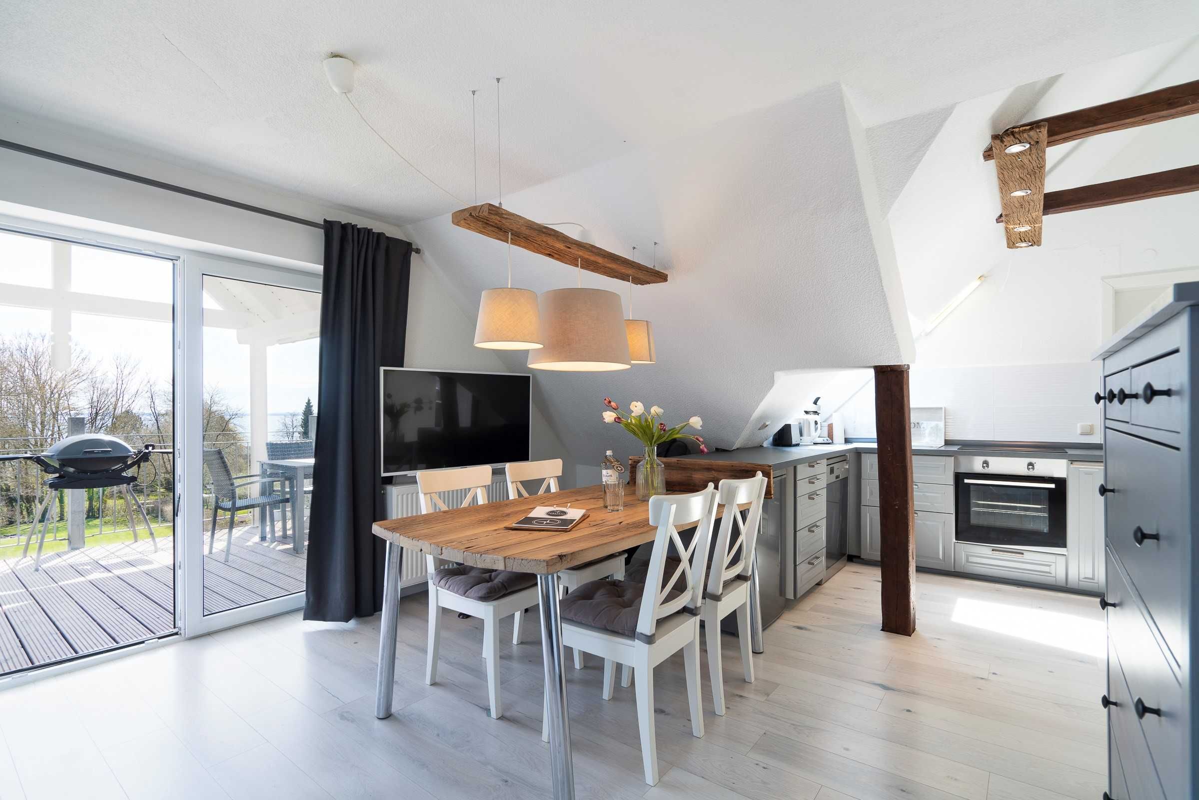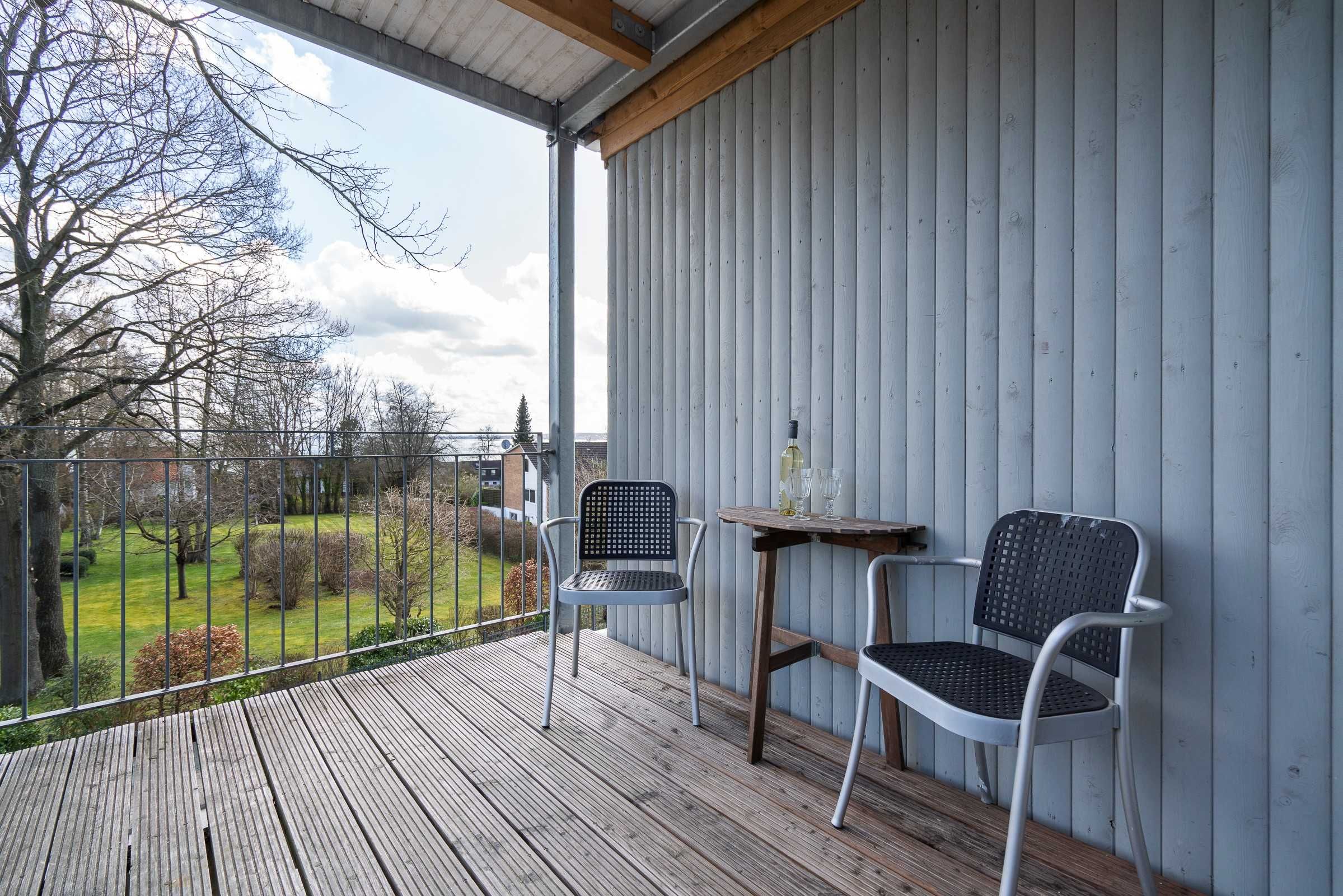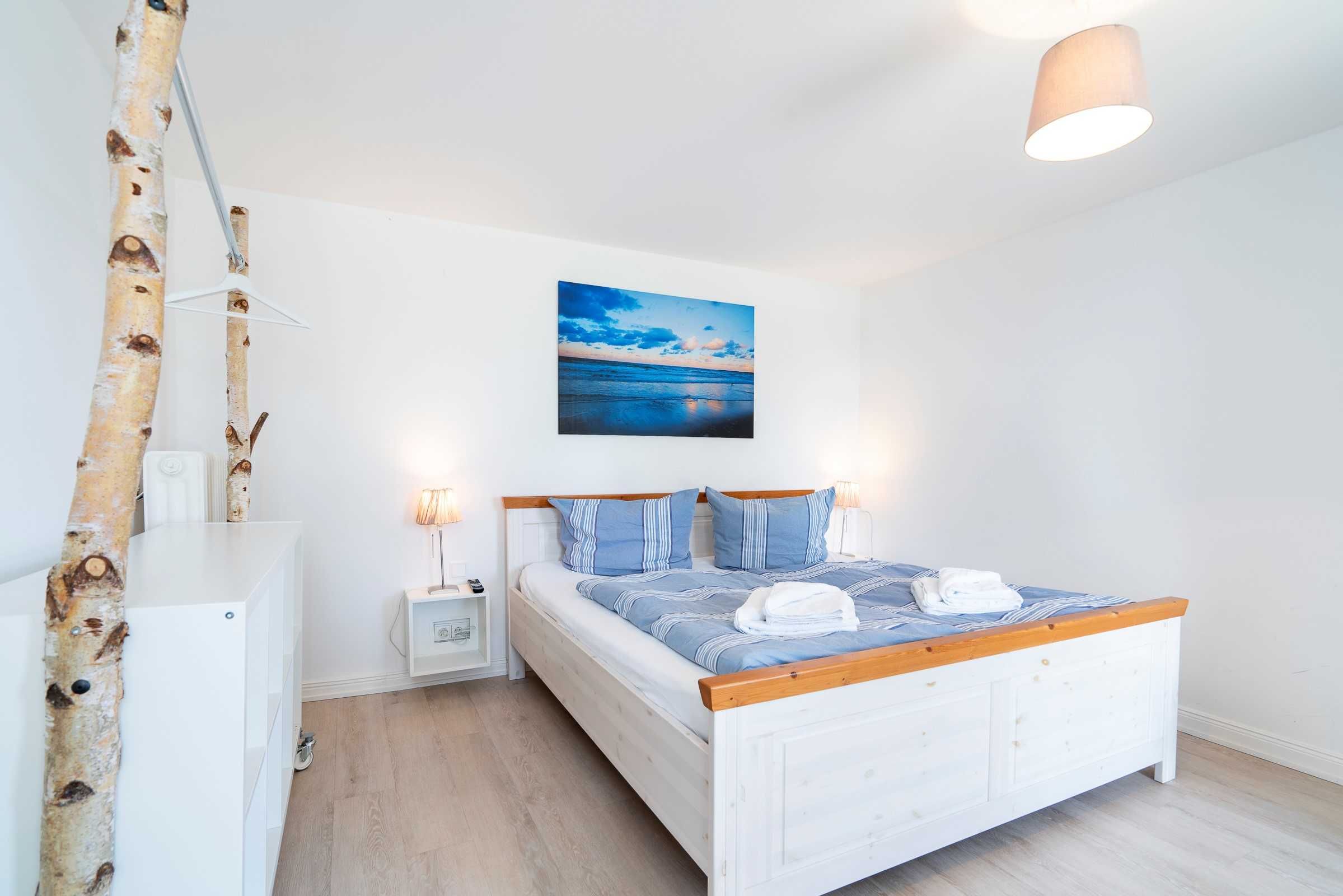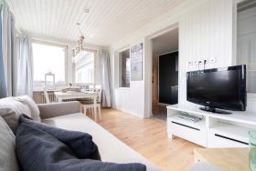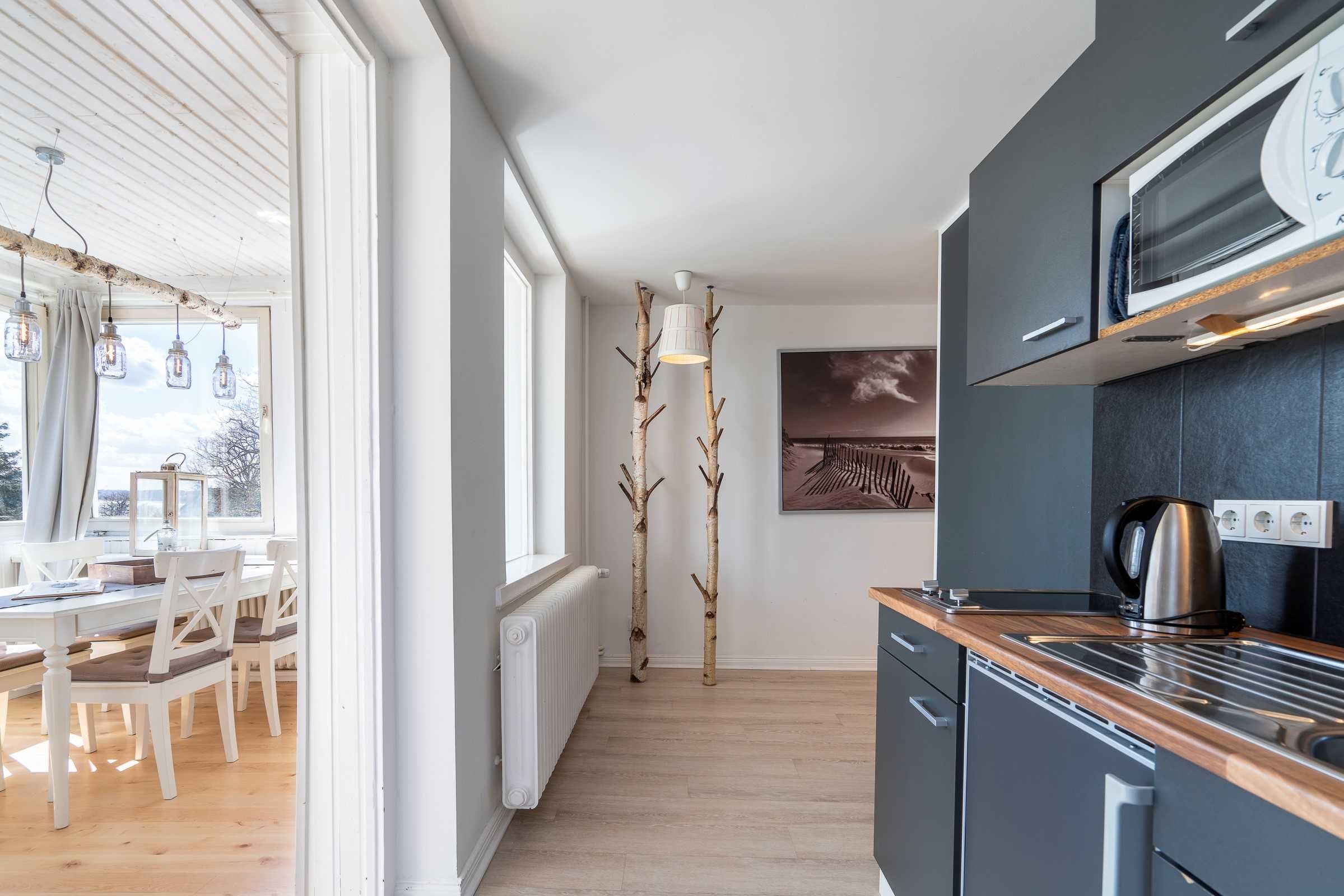 Unsere Ferienwohnung Captain bietet alles, was man für einen Strandurlaub brauchst. Die 3-Zimmer-Ferienwohnung wurde im Frühjahr 2022 renoviert und neu eingerichtet. Die Wohnung besteht aus einem hellen Logia-Wohnzimmer mit großem Fenster zum Wasser und Balkon, einem Schlafzimmer, einer Küche im Flur und einem Bad mit Walk-In-Dusche. Die Veranda bzw. Logia ist großflächig verglast und herrlich hell. Dort steht der Esstisch mit vier Stühlen und einem Umklappsofa (140 x 200cm). Im Schlafzimmer gibt es ein 180 cm Doppelbett. Vom Wohnzimmer geht Richtung Meer ein Balkon mit Tisch und Stühlen ab.