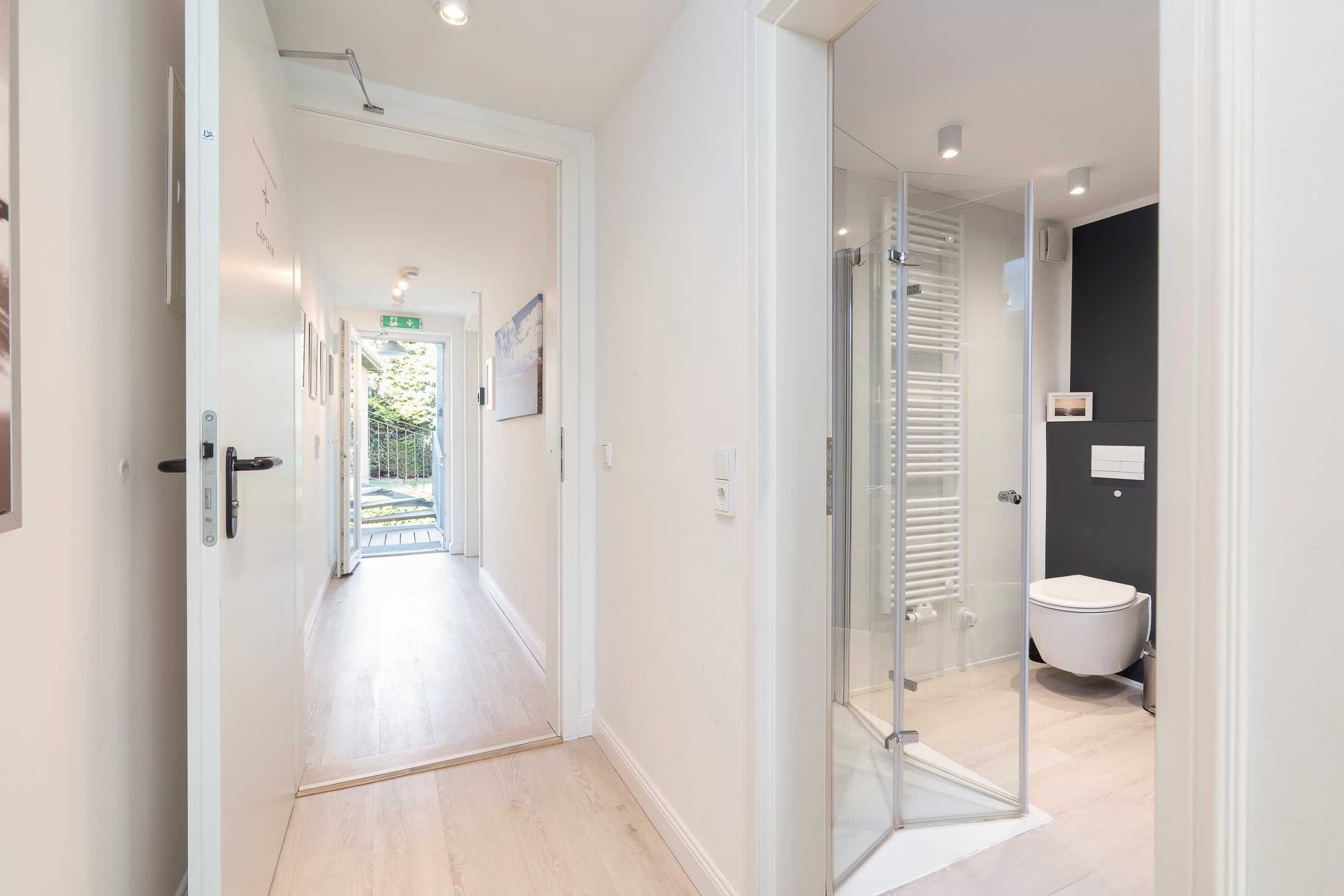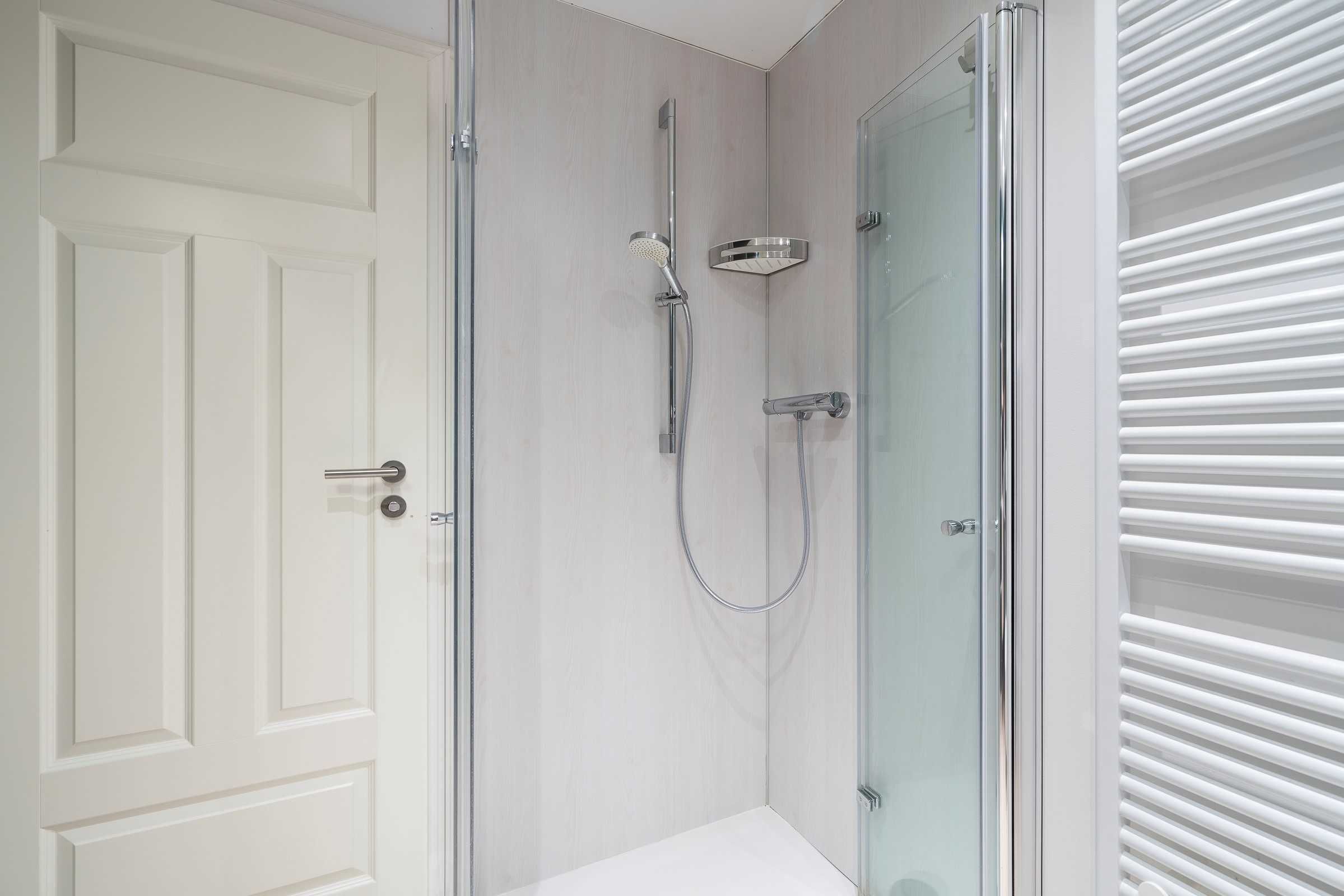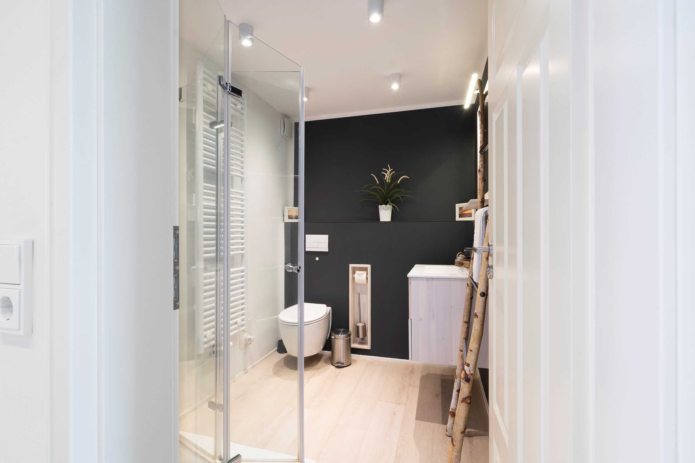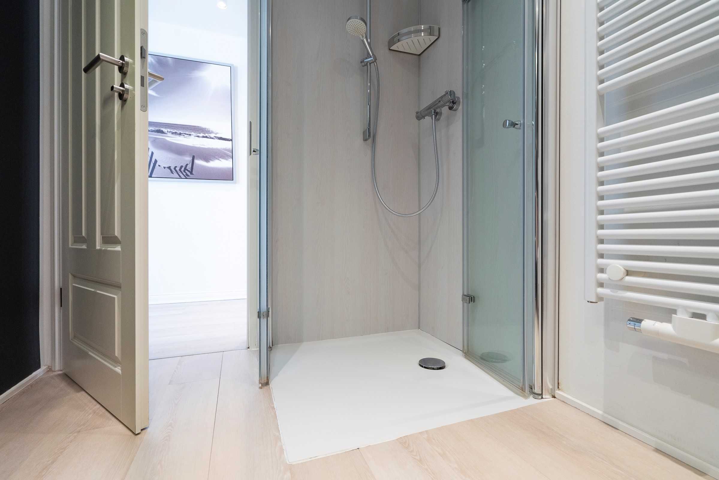 Das Bad hat eine Fußbodenheizung, einen großen Handtuch-Heizkörper, einen Porzellanwaschtisch mit Steckdose und Föhn und eine große bodengleiche Ganzglasduschkabine. Der Boden ist mit grauem Feinsteinzeug gefliest und die Wände sind hell geputzt.