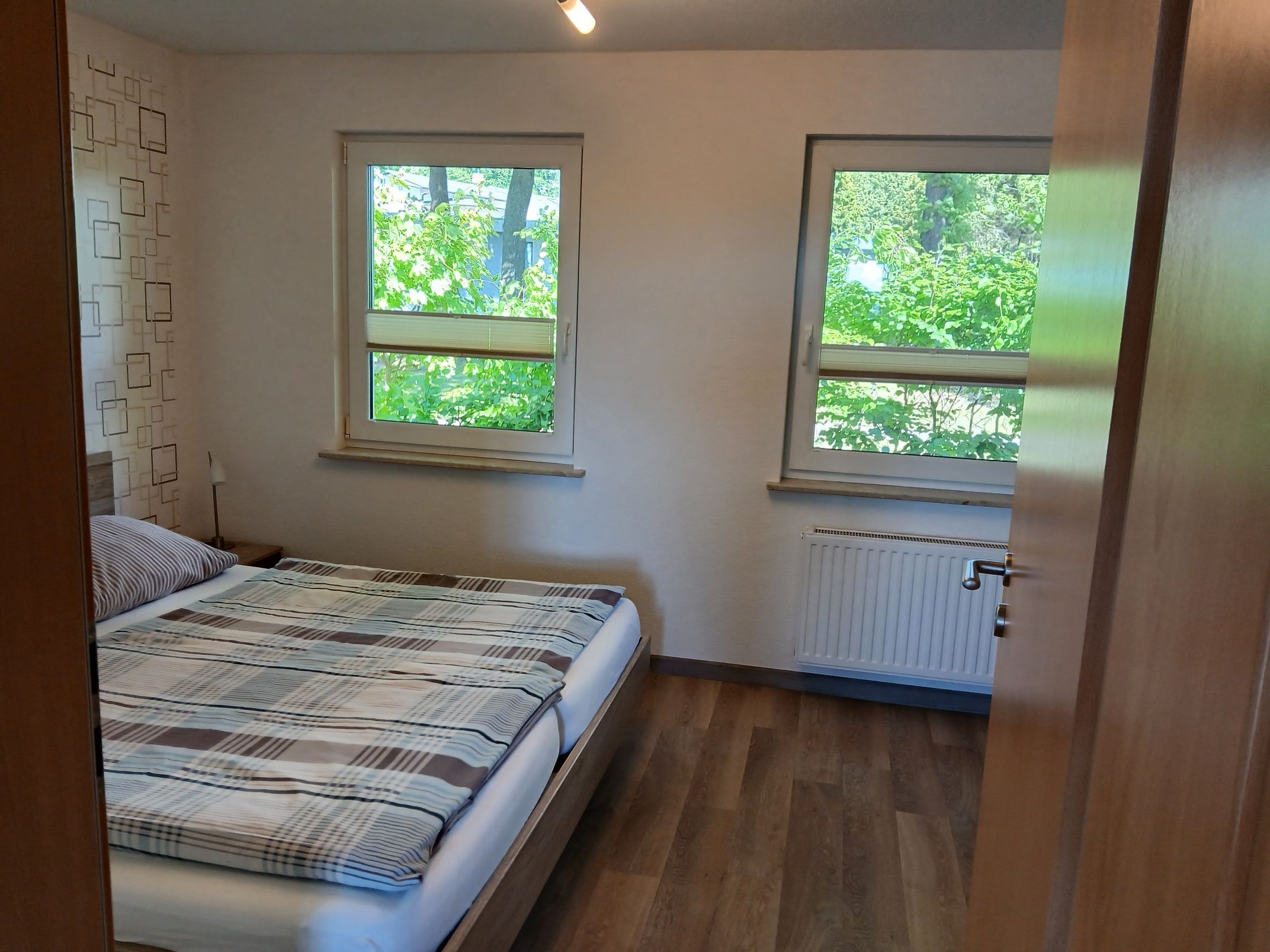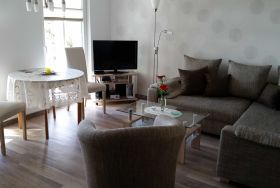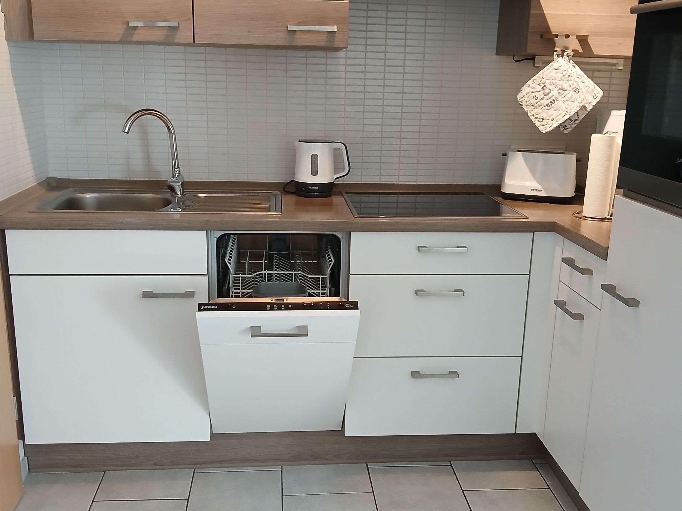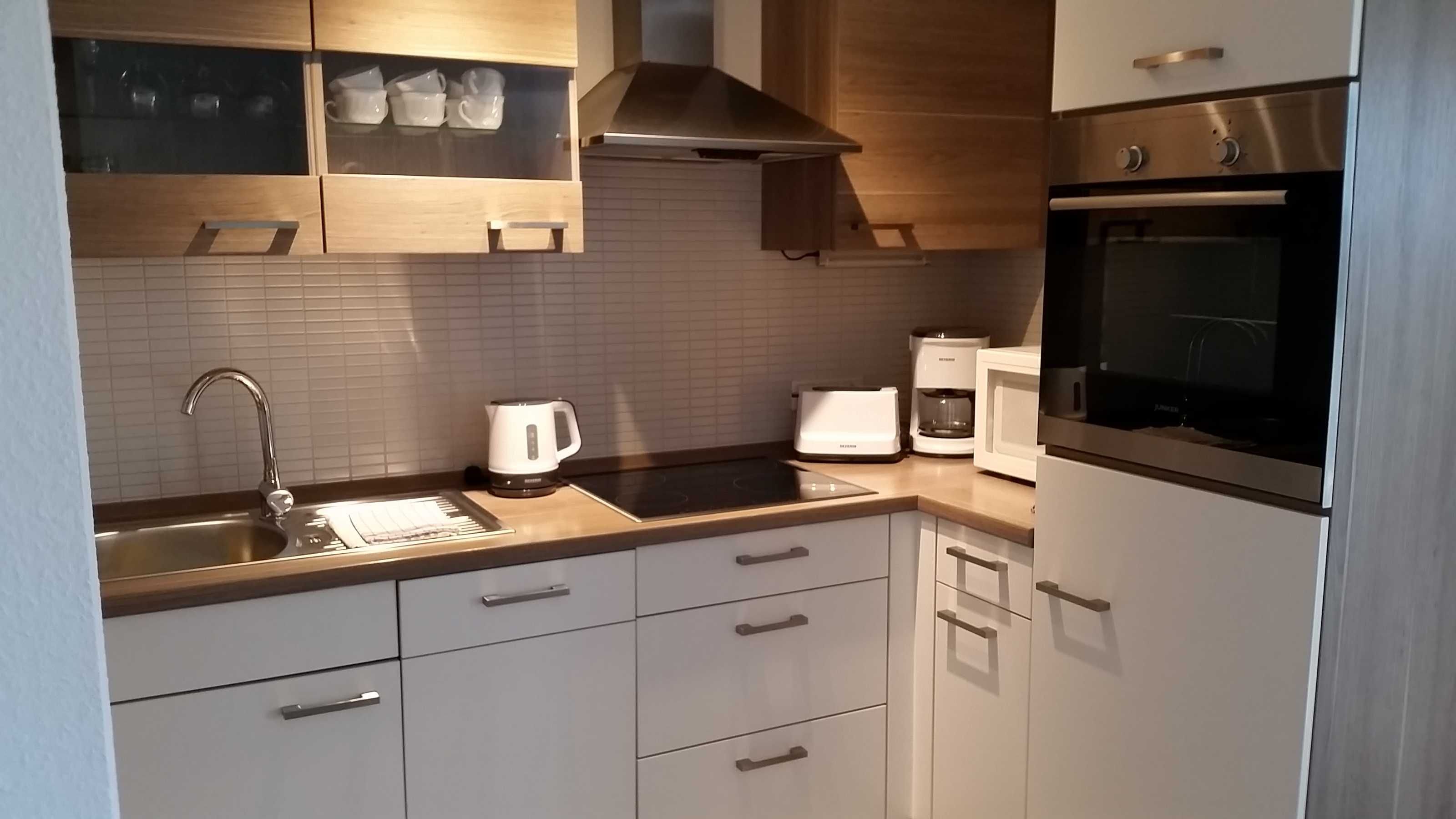 Die moderne, gepflegte NICHTRAUCHER-Ferienwohnung (45 qm) im 1. Obergeschoss mit Balkon verfügt über einen Wohnraum mit offener Küche (Backofen, Cerankochfeld, Geschirrspüler, Mikrowelle,Kaffeemaschine, Toaster, Kühlschrank mit Gefrierfach, etc.), einen Schlafraum (Doppelbett, Kommode und Kleiderschrank) sowie ein Bad mit Fenster und Dusche /WC. Erstausstattung Bettwäsche inklusive. Handtücher sind bitte mitzubringen oder mietbar für 8,-€ p.Person (Erstausstattung). PKW Stellplatz kostenlos