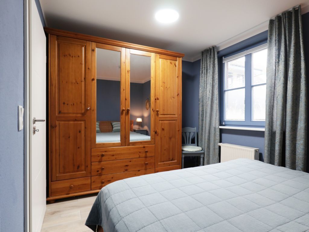 Die Wohlfühlwohnung besitzt ein separates, ausgesprochen behaglich möbliertes Schlafzimmer mit Doppelbett und Kleiderschrank. Freude bereitet ist das großzügige, ebenerdige Tageslicht Duschbad mit Waschtisch, Bidet und WC.