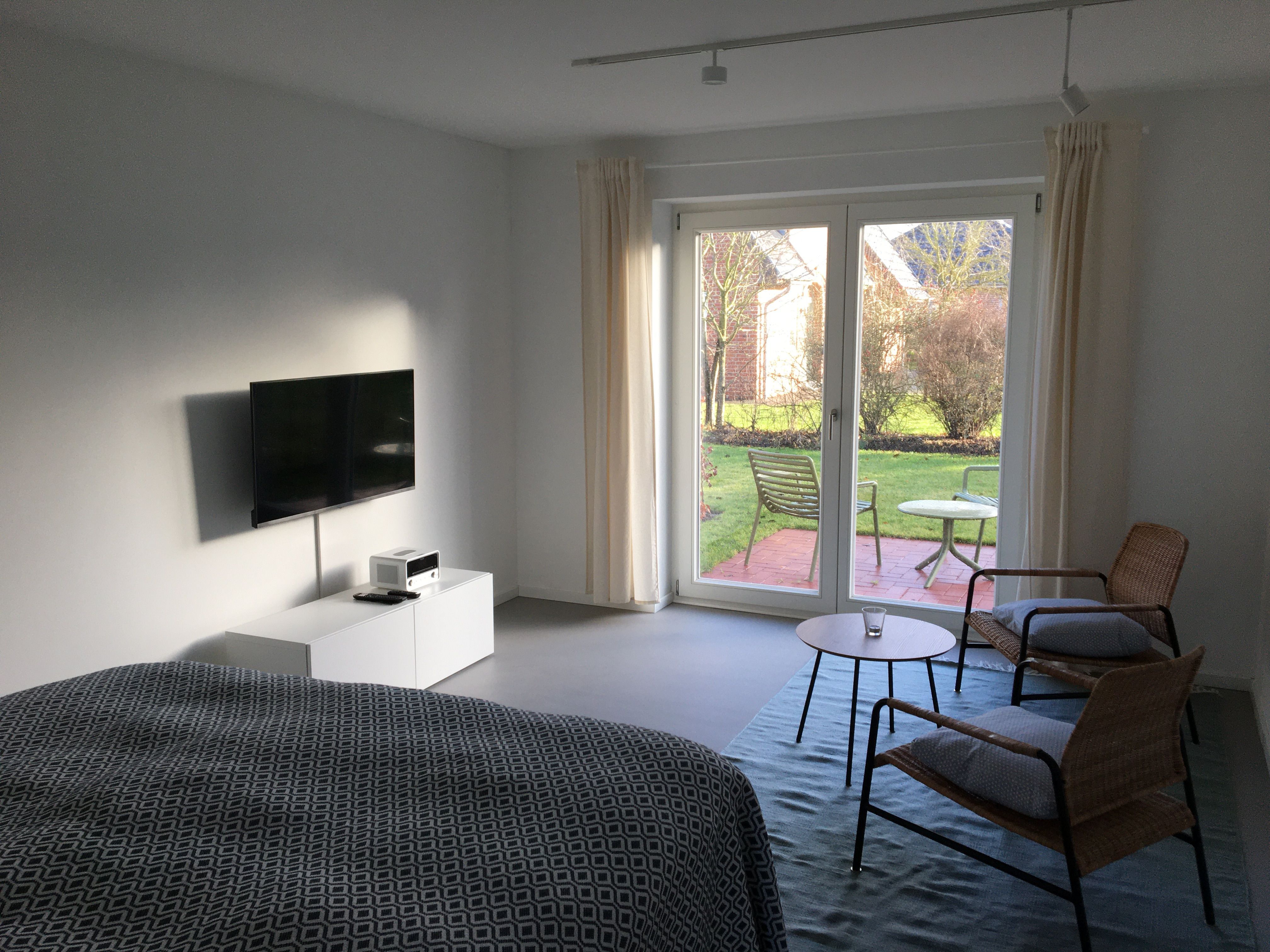 Die Inneneinrichtung ist minimalistisch und gleichzeitig elegant und lässig. Die Größe und Ausstattung aller Apartments ist identisch und nur in Details voneinander abweichend. Auch wenn es sich bei der Unterkunft um eine Pension handelt können meine Gäste doch auch weitestgehend Ihre Unabhängigkeit genießen, denn alle Apartments haben einen eigenen Eingang und eine eigene Terrasse.