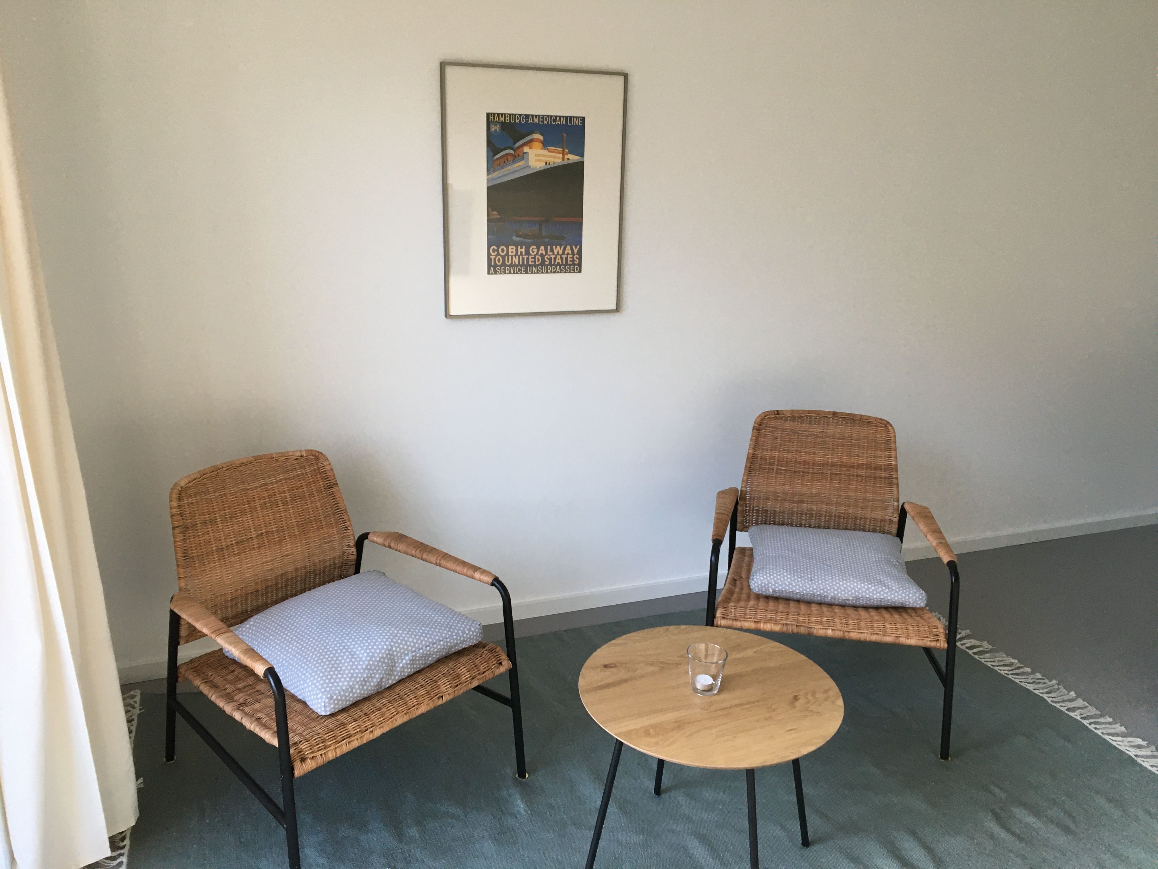 Der Wohnbereich des Apartments ist mit maßangefertigten Einbauschränken und einem Queensize Doppelbett (Breite 1,60 m) vom Tischler ausgestattet. Das Queensize Bett hat zwei Lattenroste mit jeweils verstellbaren Kopf.-und Fußteil, sowie zwei hochwertigen Matratzen von Schlaraffia. Zum Wohnbereich gehören außerdem zwei bequeme Couchsessel, nebst Couchtisch, sowie eine Kommode, die weiteren Stauraum bietet.