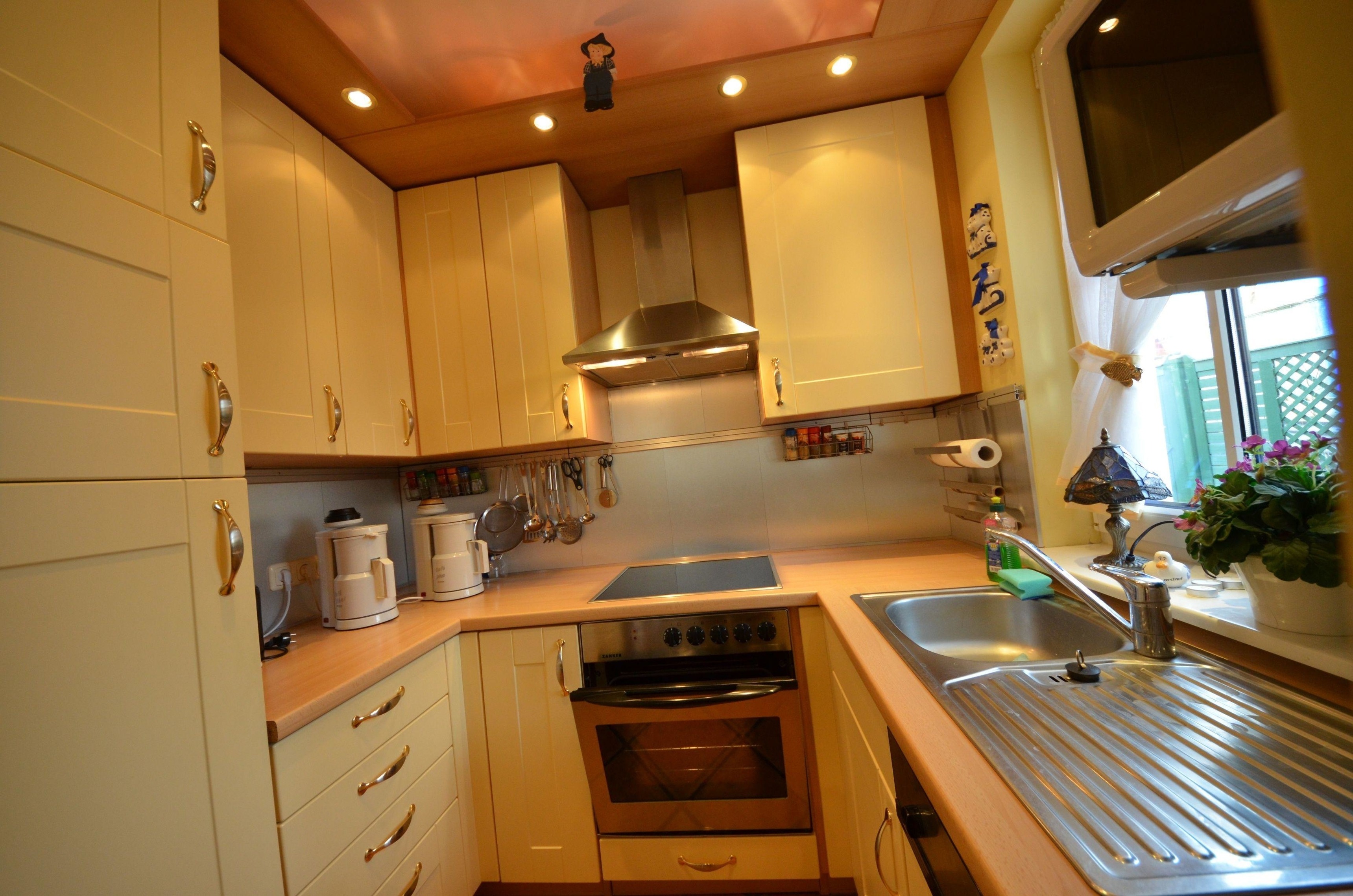 Fußbodenheizung, moderne Einbauküche in arktisgelb, Geschirrspüler, Mikrowelle, Herd mit Ceran - Kochfeld Turmhaube und Backofen, Kühlschrank mit Gefrierteil,