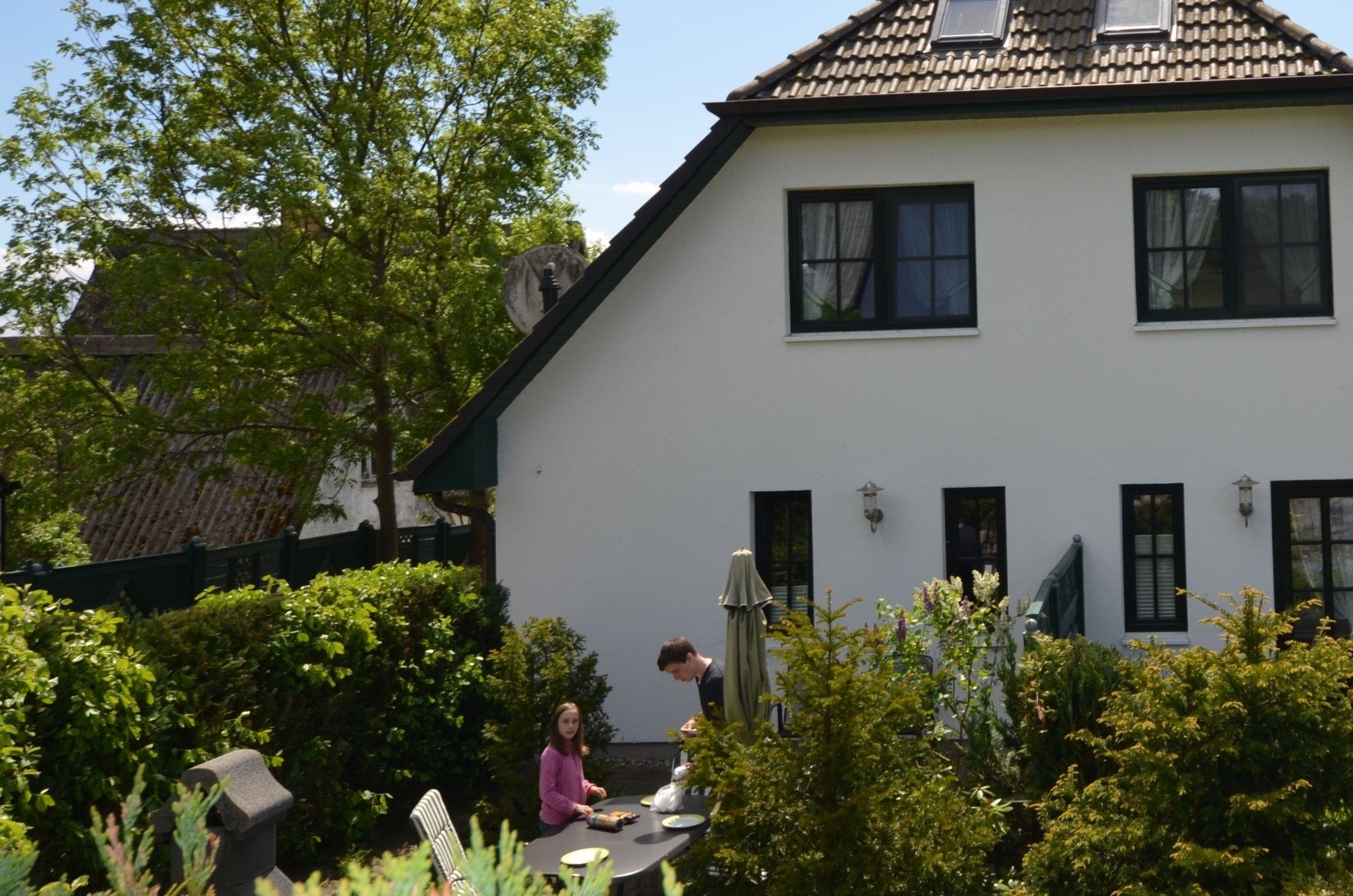 Das Haus hat einen eigenen separaten Eingang. Neben der Eingangstür befindet sich ein kleiner Garten mit Terrasse Gartenmöbeln und Strandkorb sowie ein Gartengrill.