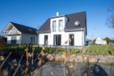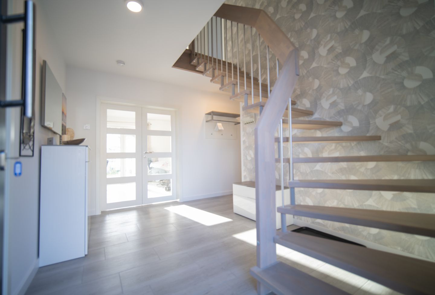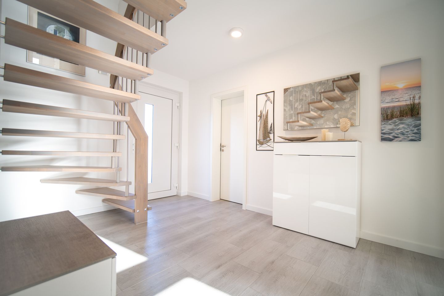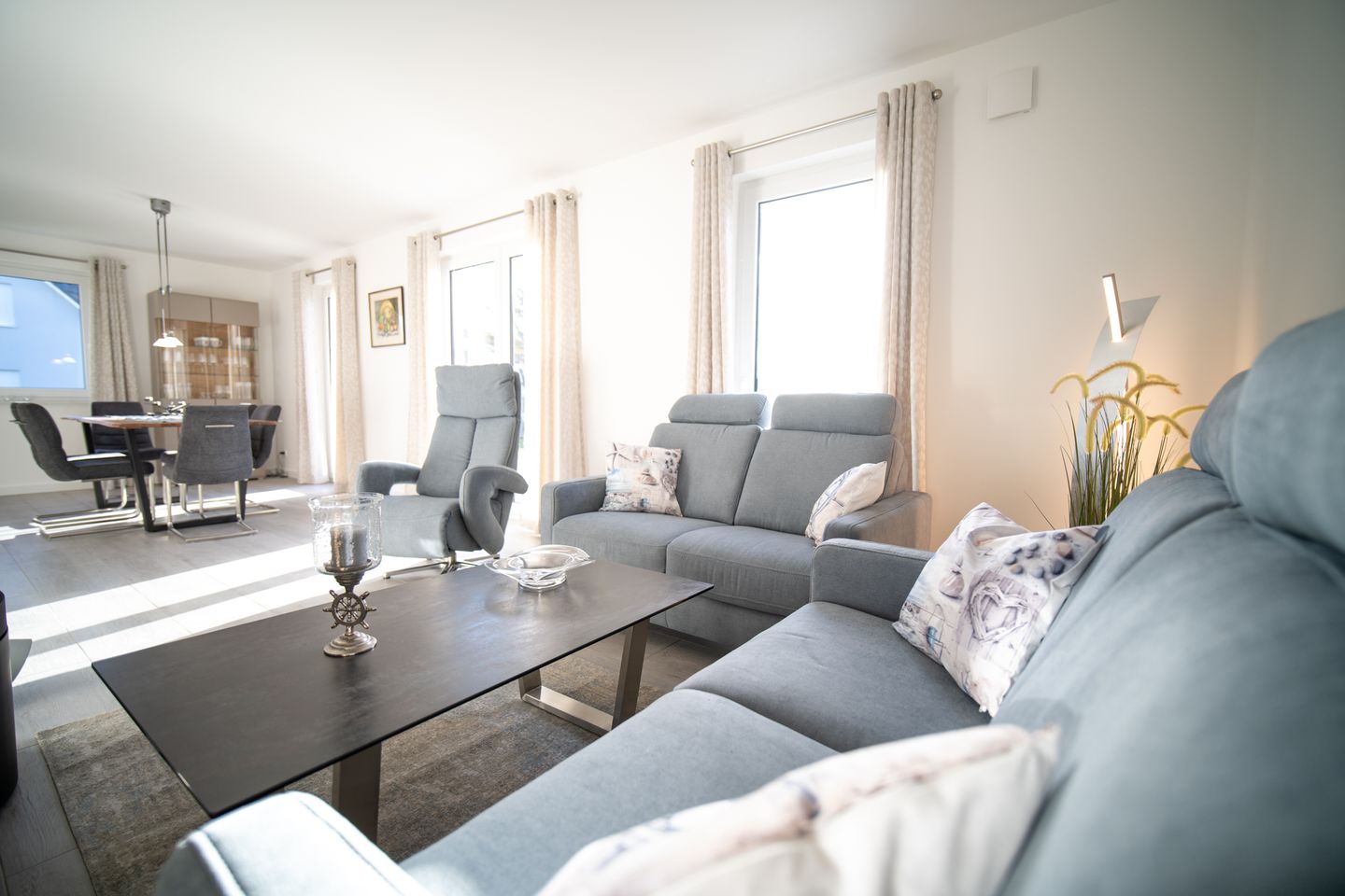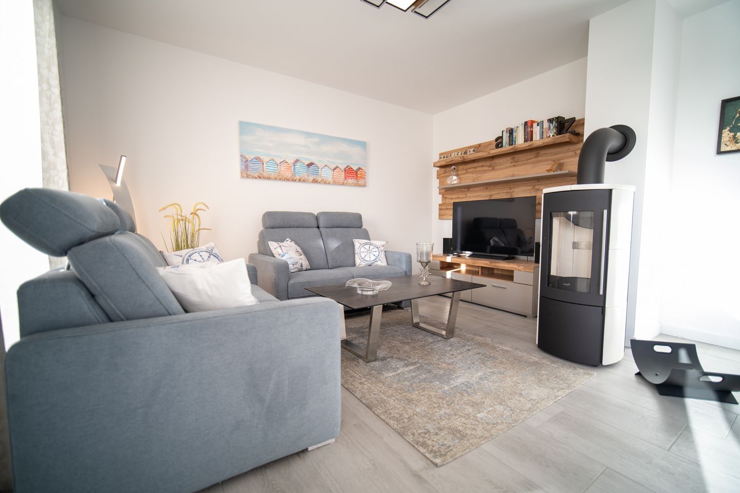Beim Betreten des Hauses werden Sie von einem einladenden Eingangsbereich empfangen. Von diesem gelangen Sie in den großzügigen Wohn-/Essbereich mit offener Küche. Den Abend können Sie gemütlich am prasselnden Kaminfeuer ausklingen lassen.