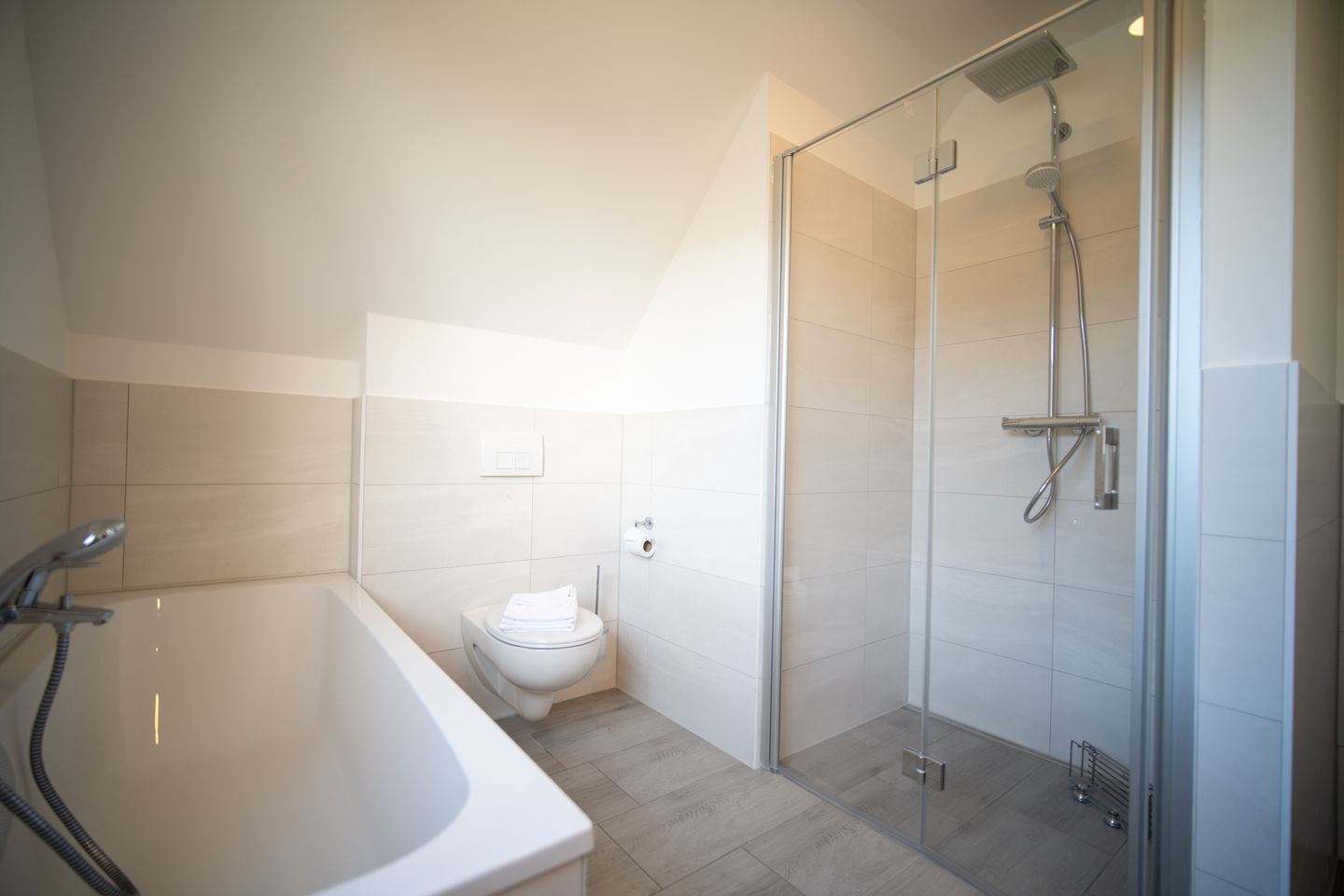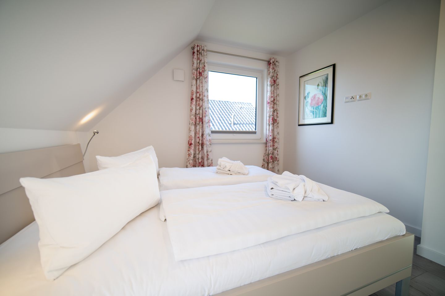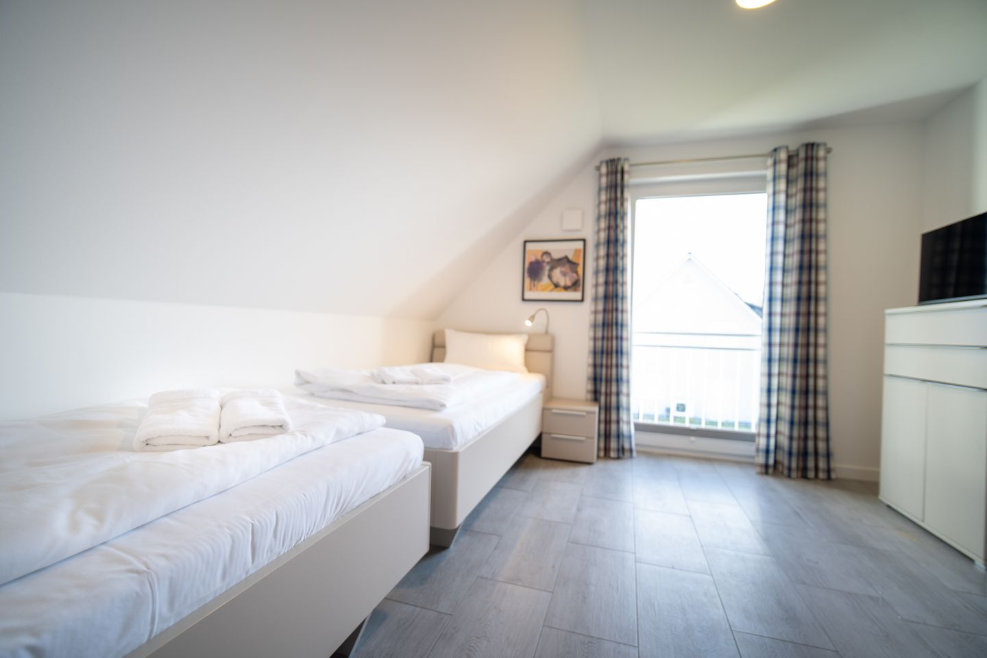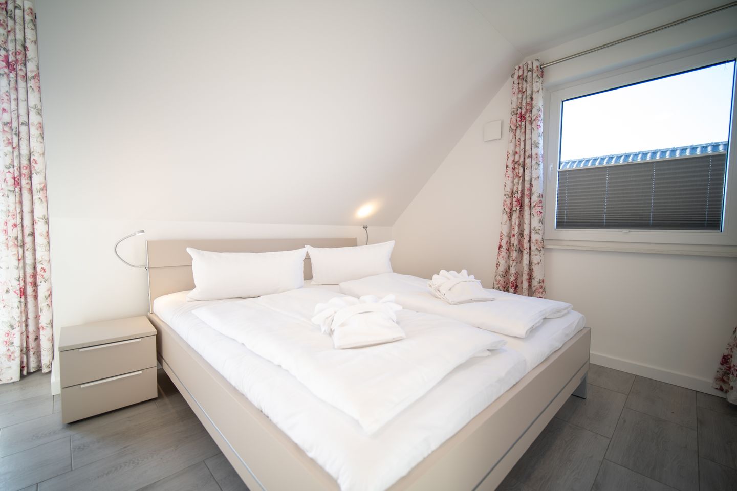 Im Obergeschoss befinden sich die drei hell eingerichteten Schlafzimmer sowie ein Dusch-/Wannenbad. Zwei Schlafzimmer sind jeweils mit einem Doppelbett und Kleiderschrank ausgestattet. Das dritte Schlafzimmer ist der perfekte Rückzugsort für Kinder – mit zwei einzelnstehenden Betten und Kleiderschrank ausgestattet.