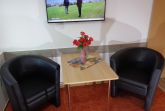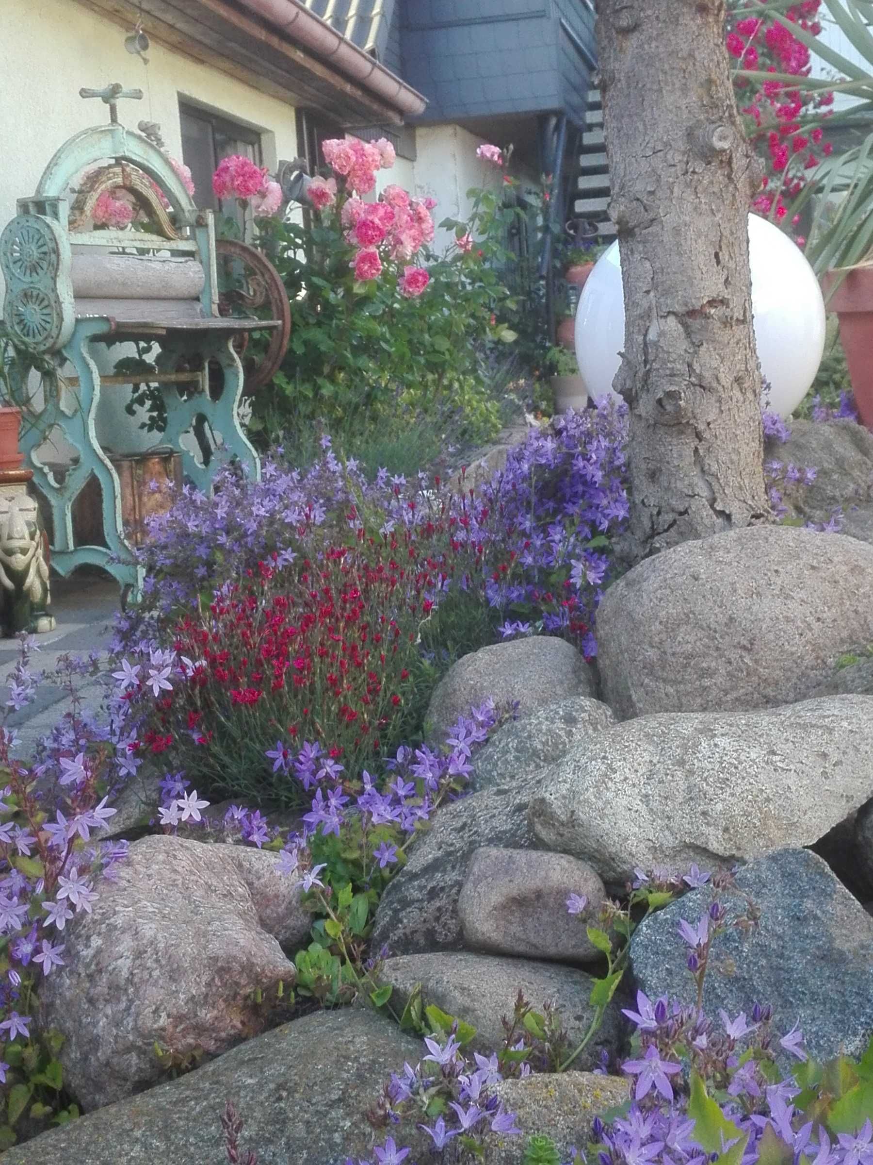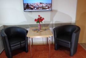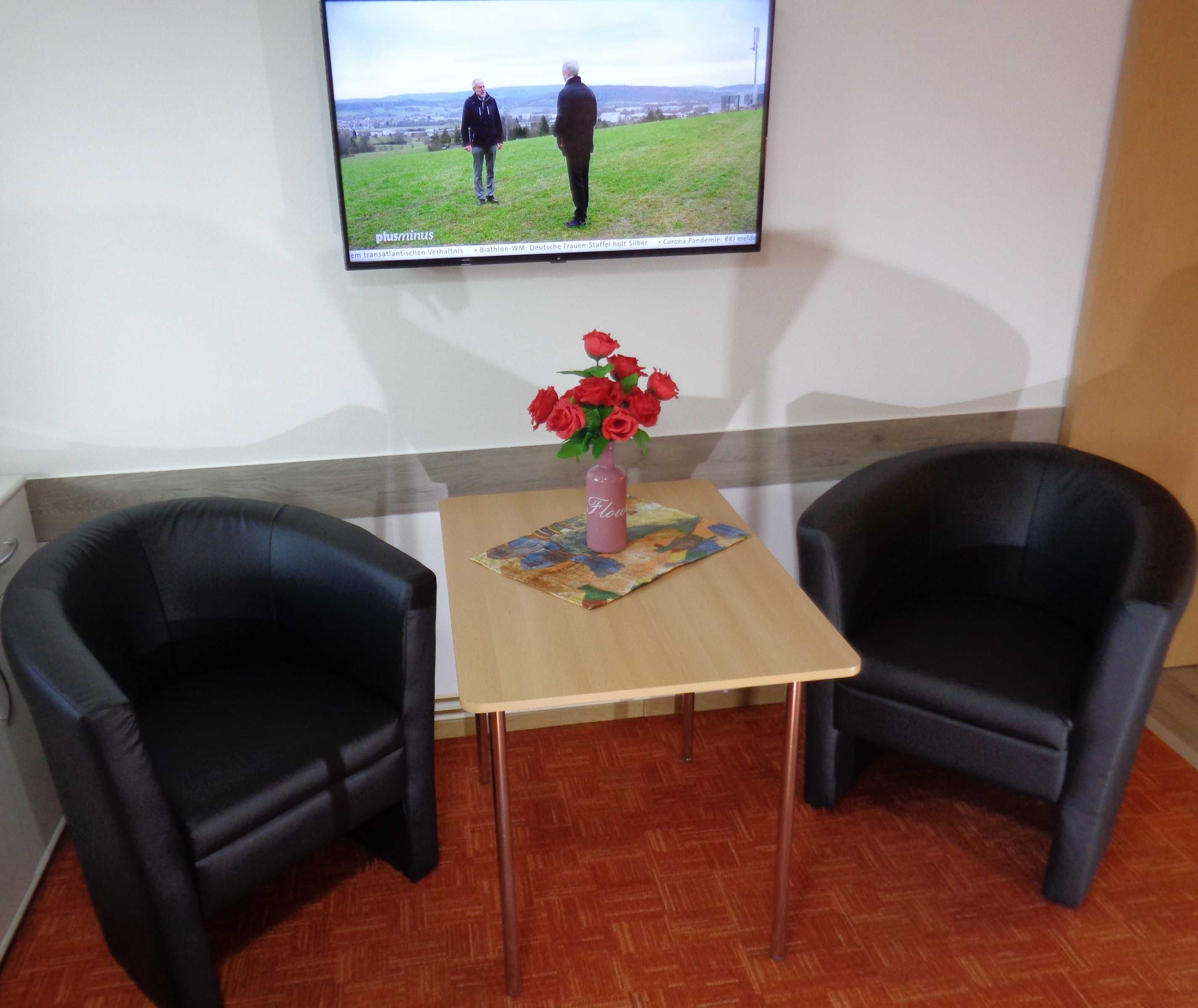 Kleine Ferienunterkunft mit sep. Eingang auf eigenem Grundstück, Sitzen im Grünen (Gartenmöbel vorhanden) in ruhiger, aber doch zentraler Lage, Terrasse, ebenerdig. Kombination aus Wohn- und Schlafraum mit einem Einzelbett 90x200, moderner Tisch mit 2 Cocktailsessel
