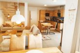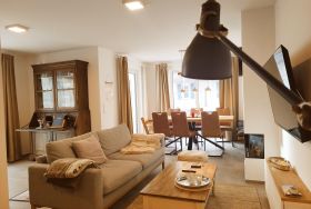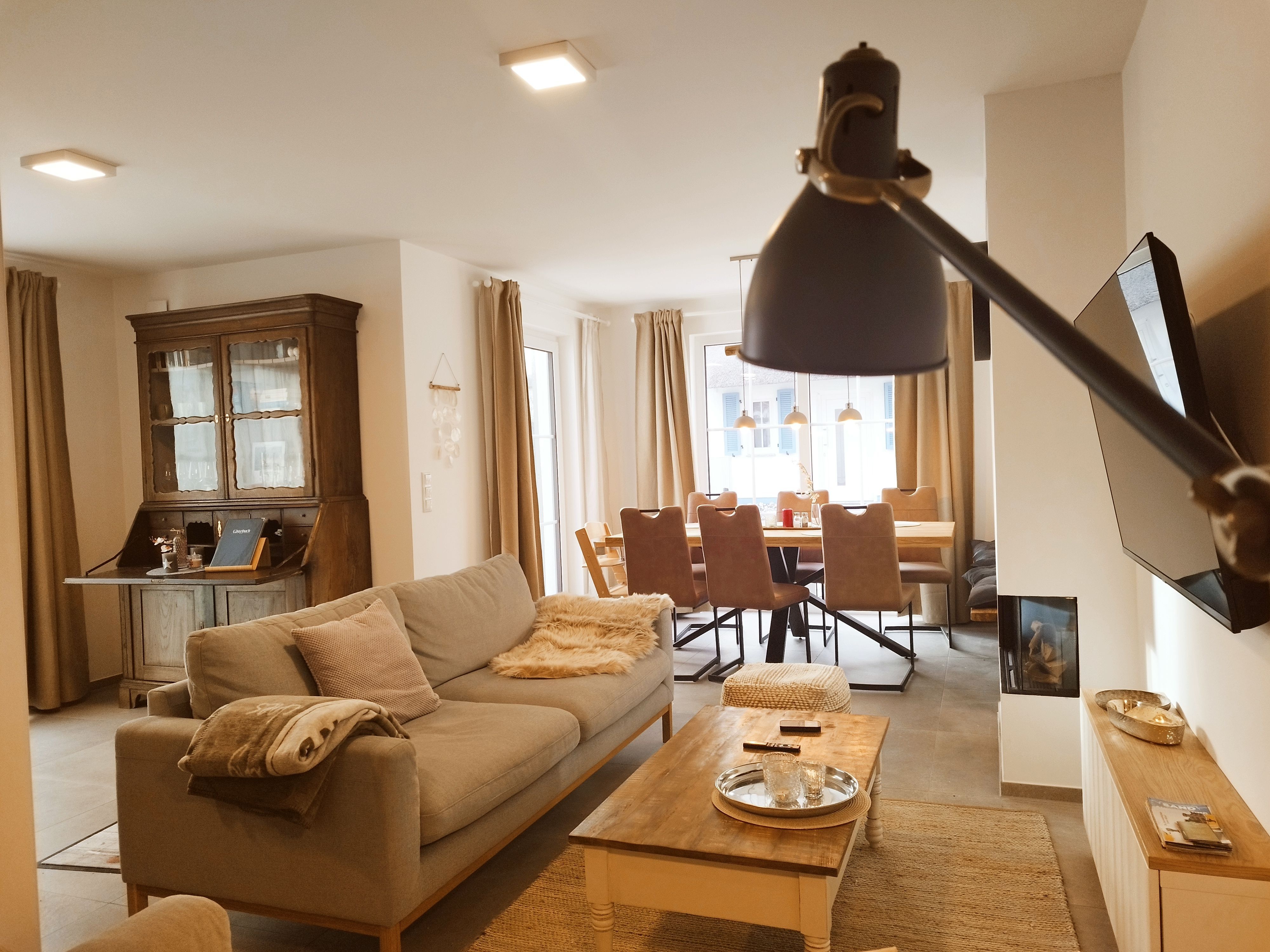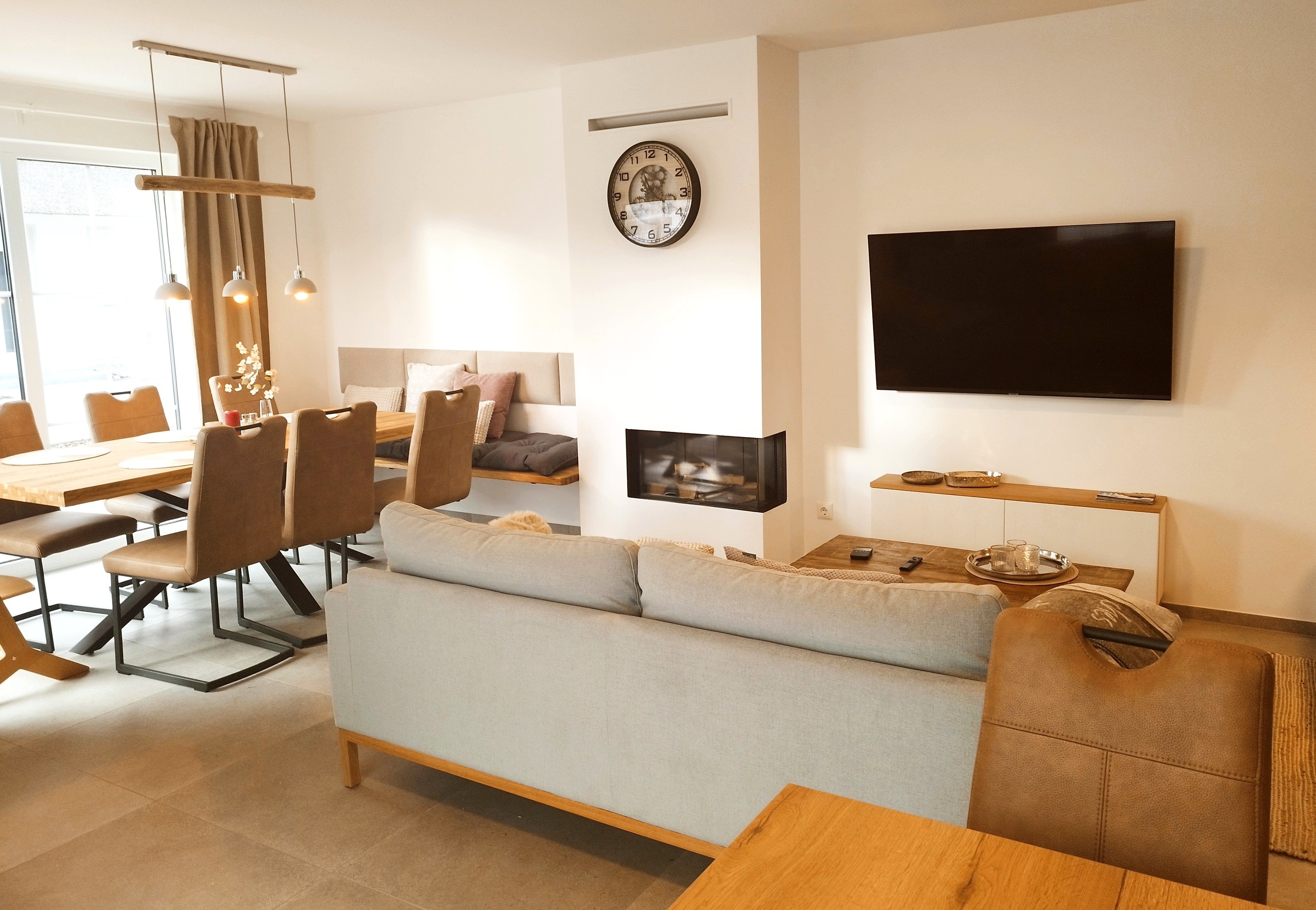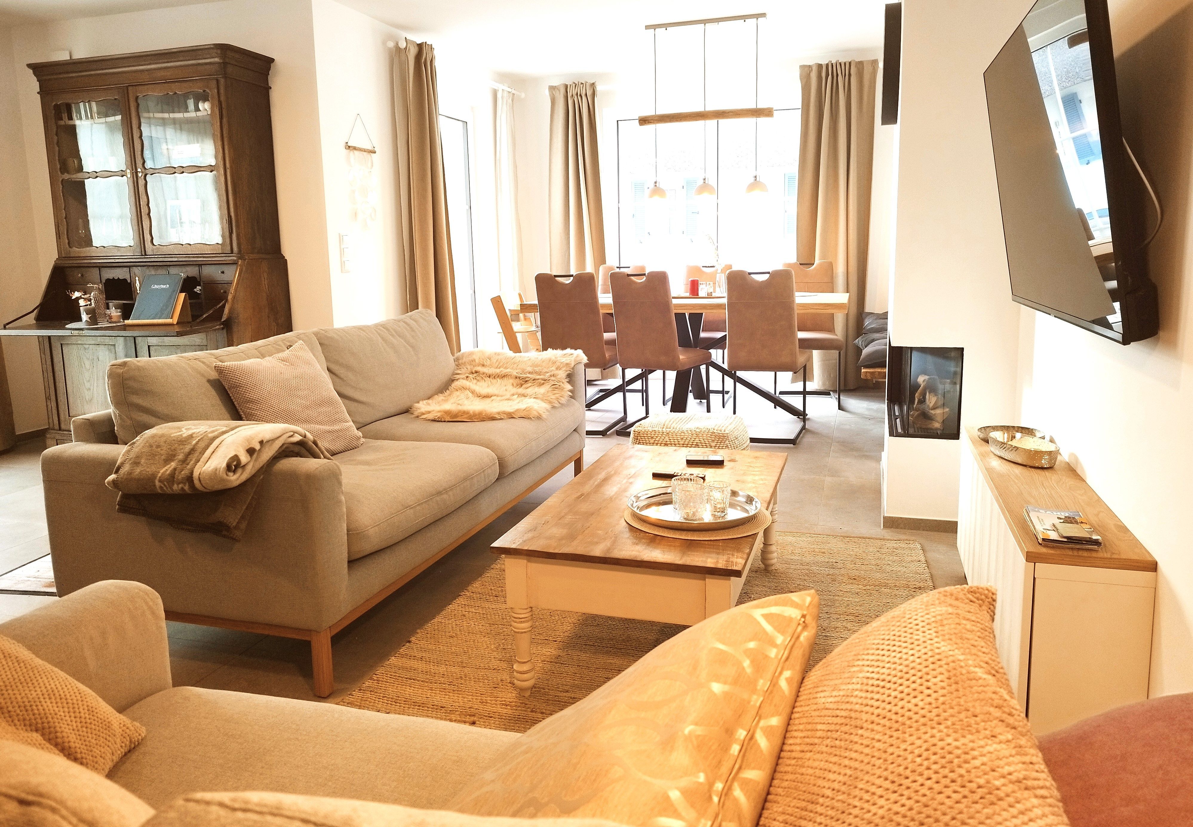 Der offene, lichtdurchflutete Wohnbereich mit integrierter, optimal ausgestatteter Küche lädt zum gemeinsamen Kochen oder Relaxen auf den Sofas oder vor dem Gaskamin ein. Am großen Esstisch, von dem man durch die bodentiefen Fenster in den Garten blickt, finden 8 Personen bequem Platz.