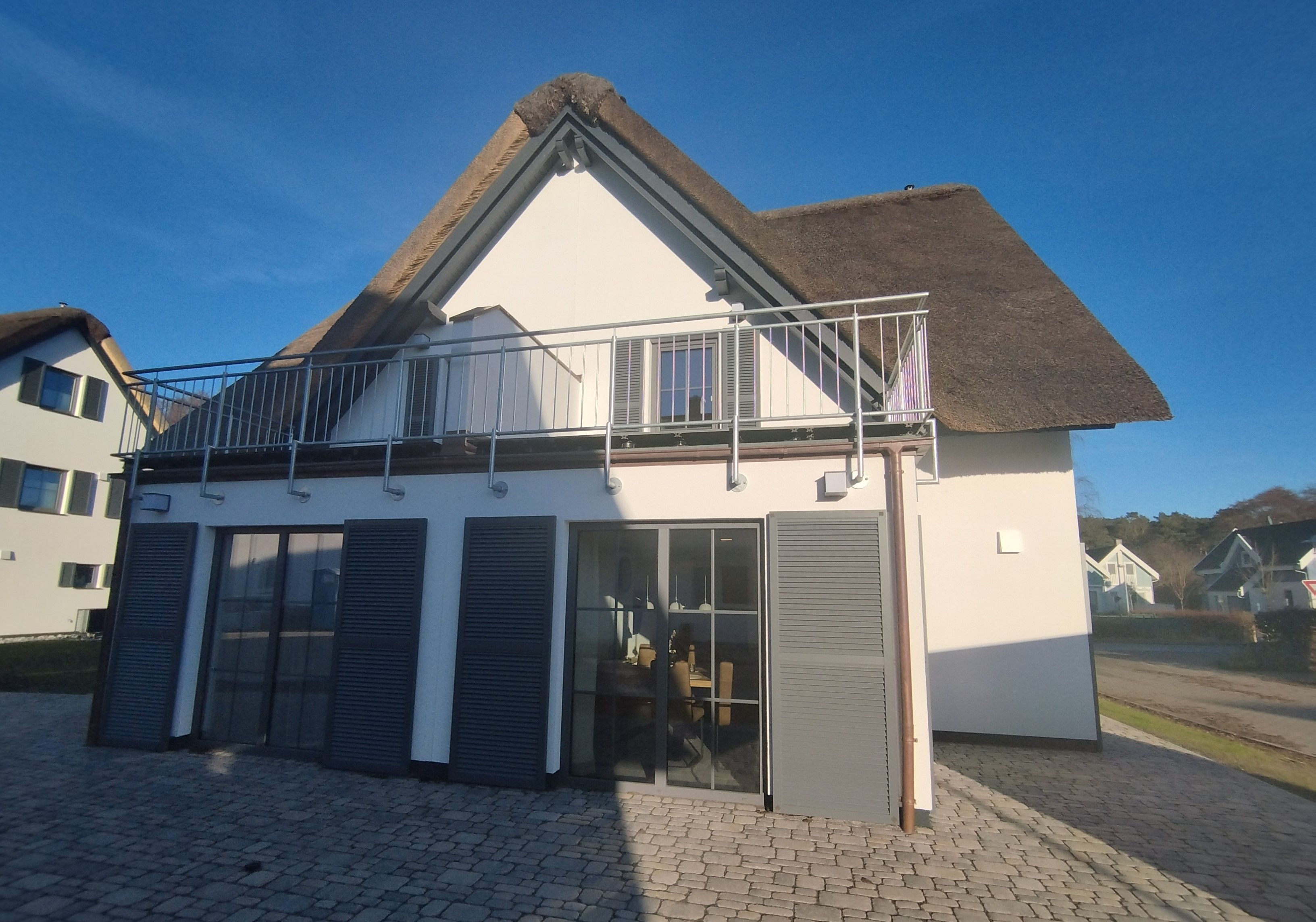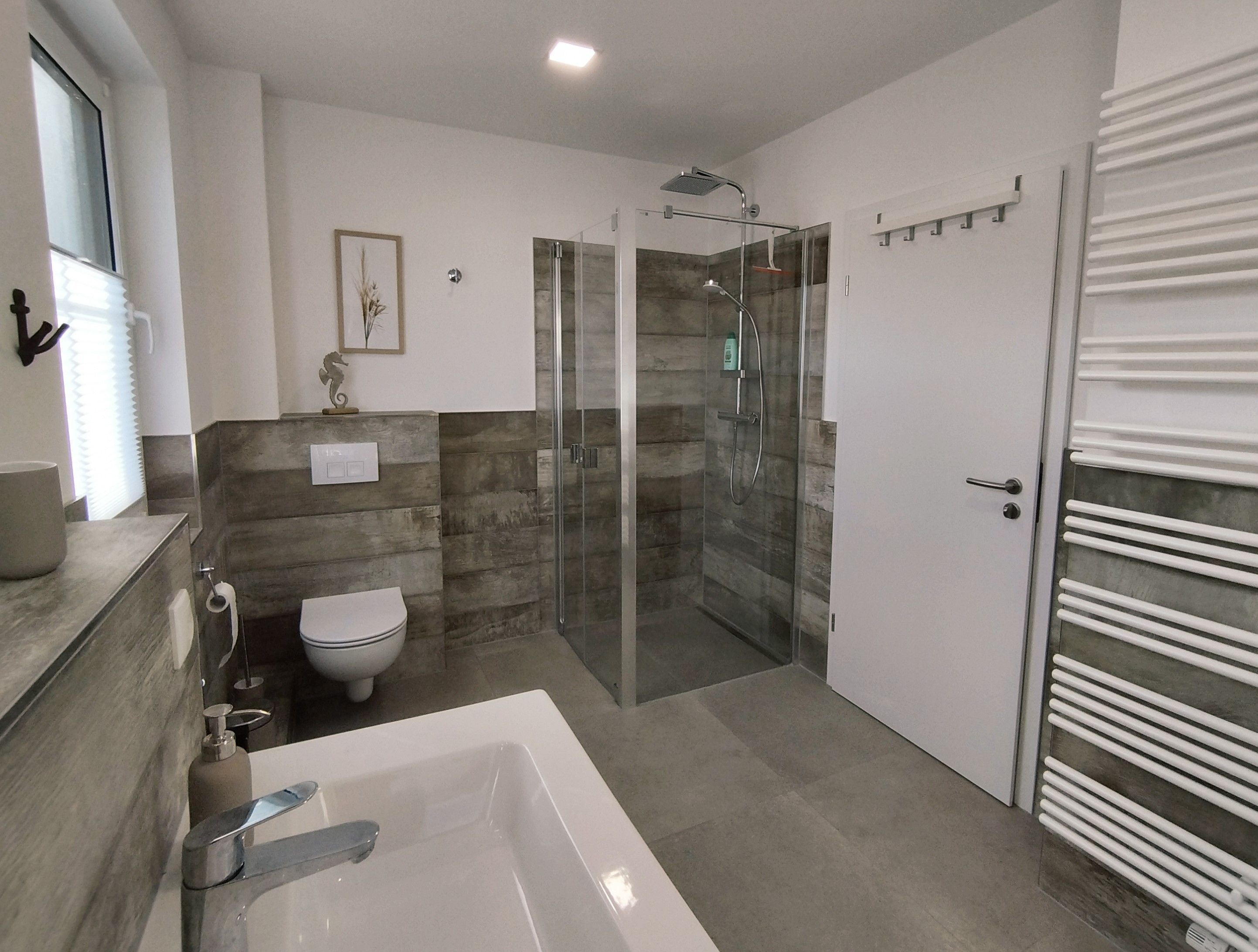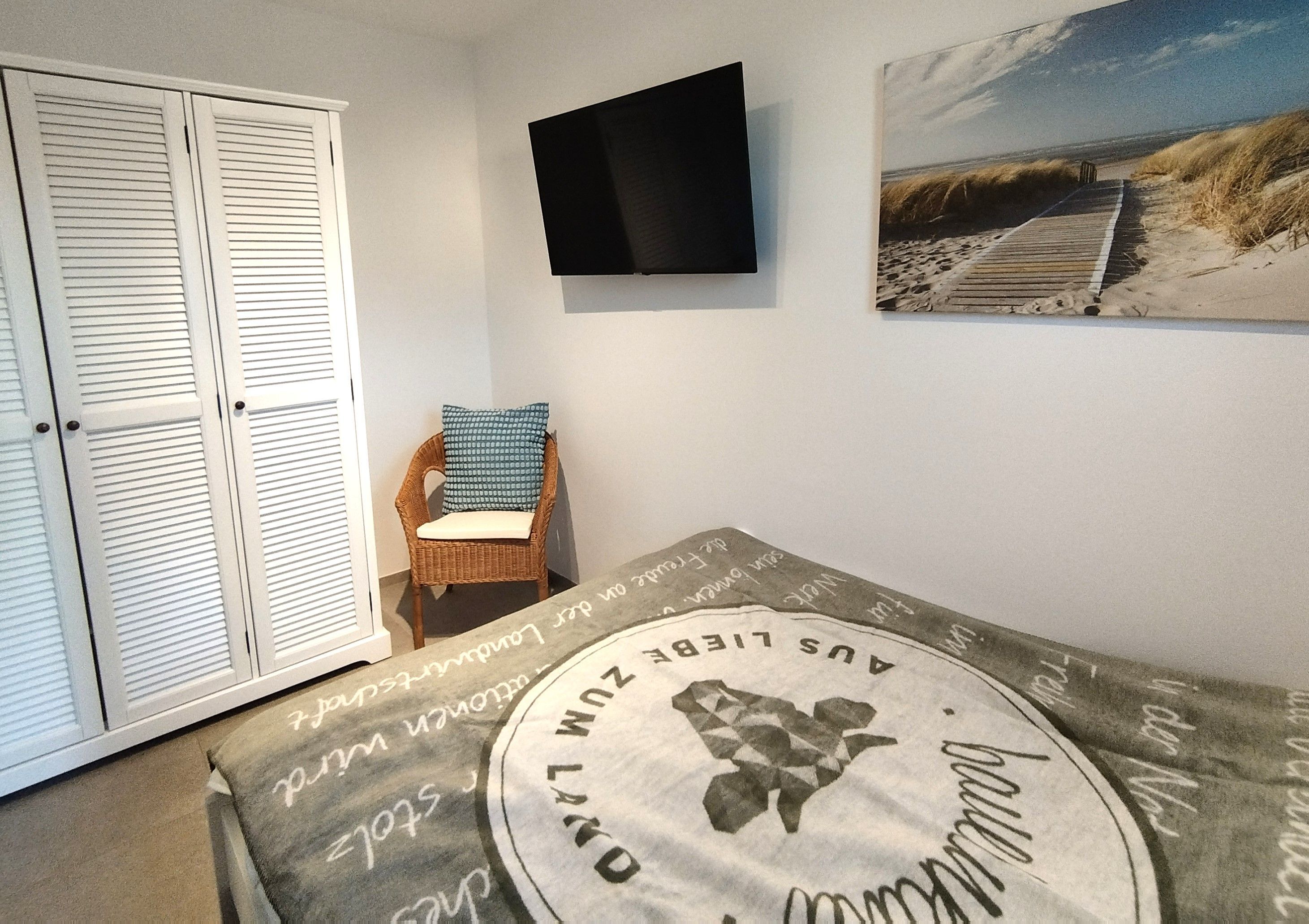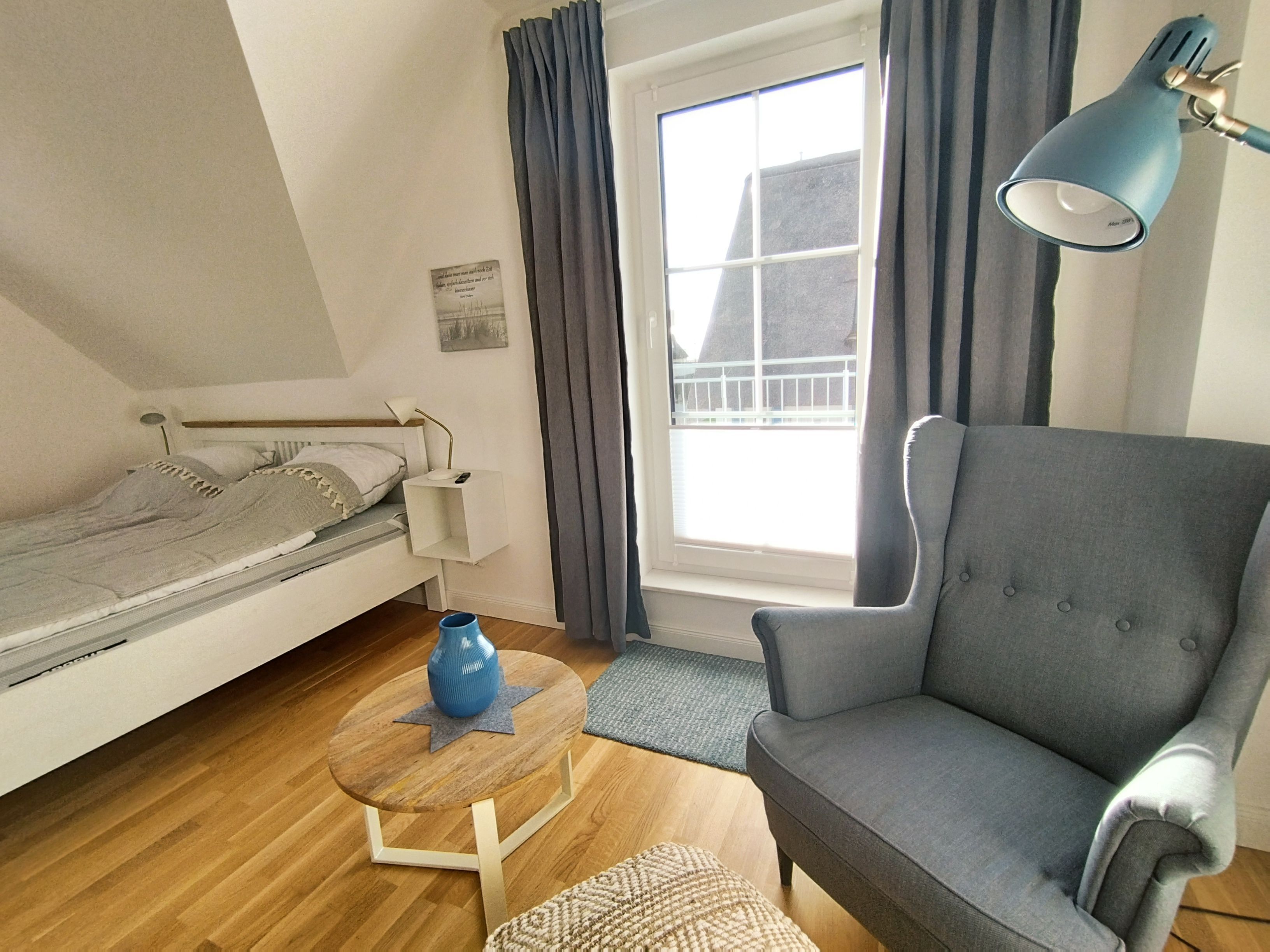 In 4 Schlafzimmern finden bis zu 8 Personen ein Plätzchen. 3 Bäder auf 3 Etagen garantieren, dass sowohl mehrere Paare als auch große Familien mit mehreren Generationen den gemeinsamen Urlaub und die Privatsphäre genießen können. Im barrierefreien EG befindet sich ein Schlafzimmer mit einem 140cm x 200cm großen Bett und angrenzendem Bad mit Dusche. Im 1. OG haben 2 Schlafzimmer mit jeweils einem Doppelbett (180 cm x 200 cm) Zugang zu einem großzügigen Wellnessbad mit Sauna und Dusche. Eines der Schlafzimmer hat einen direkten Zugang zu einer großzügigen Dachterrasse, von der man auf den Leuchtturm und den Bodden schauen kann- ideal für eine kurze Auszeit oder die Ruhephase zwischen den Saunagängen, welche man im Strandkorb dort genießen kann. Ein Schreibtisch sowie ein gemütlicher Ohrensessel im 1. OG bieten die Möglichkeit, sich zurückzuziehen - zum Arbeiten oder für eine Auszeit.