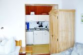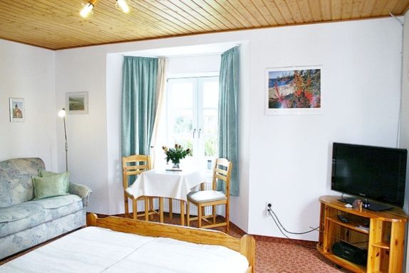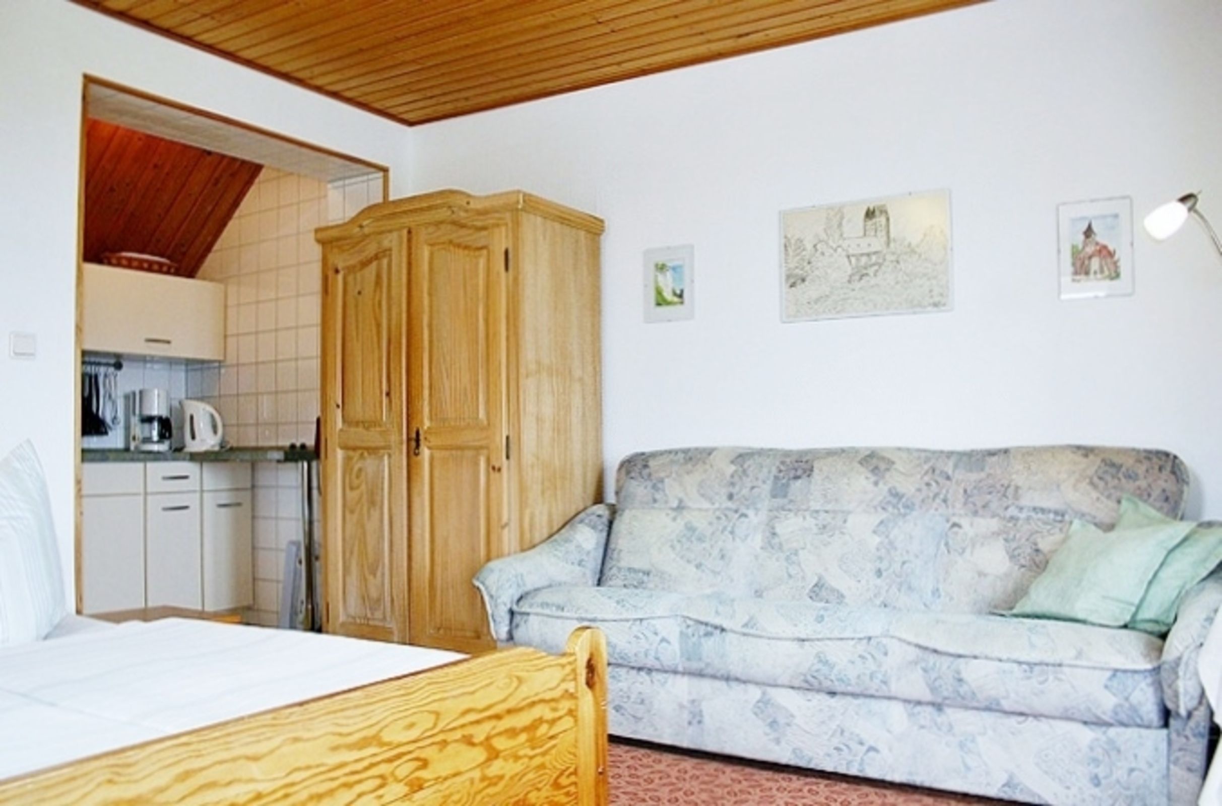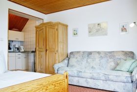 Ferienwohnung West verfügt über kombinierte Wohn-, Schlafraum mit TV und Radio, eine Einbauküche, Bad (WCund Dusche), Heizung. In der Westwohnung (ca. 22 qm) befindet sich eine Couch. Die Einbauküche ist ausgestattet mit: Kühlschrank, 2 Ceranfeldkochplatten, Wasserkocher, Kaffeemaschine, Toaster, Geschirr …