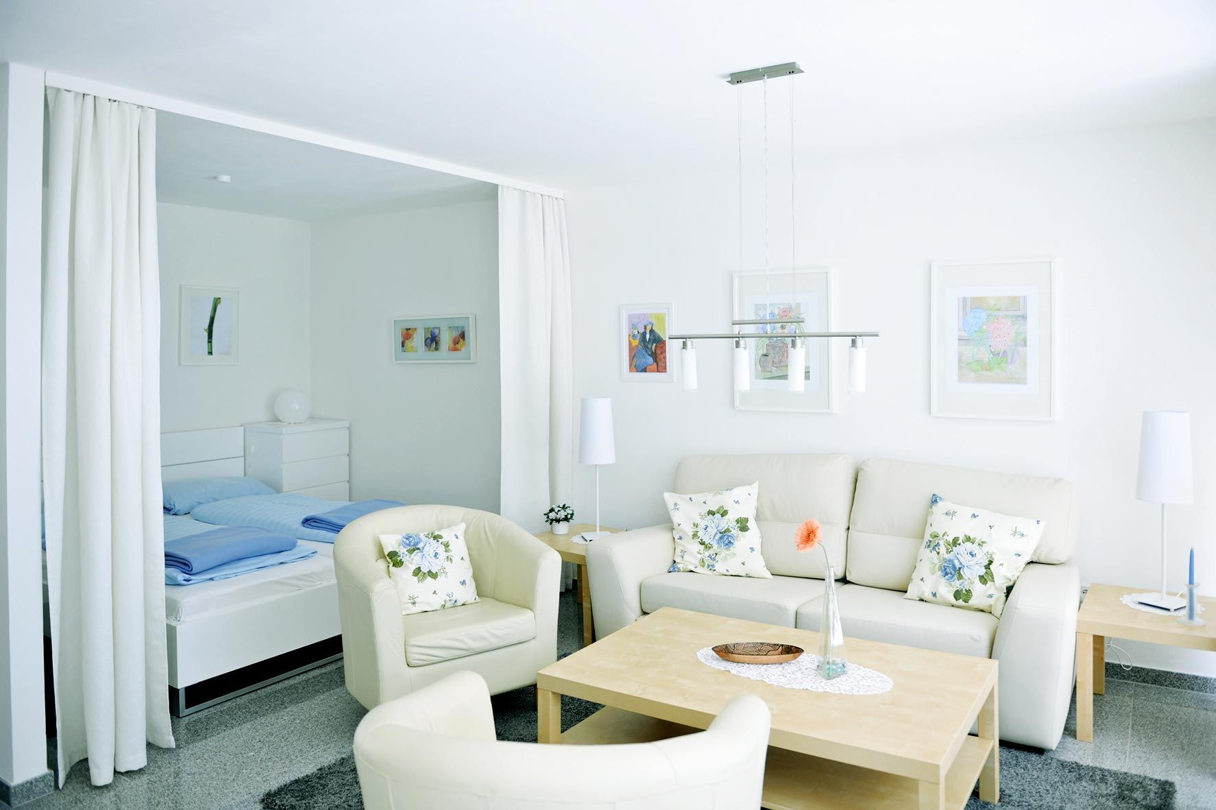 Der gemütliche Wohnbereich bietet neben SAT-TV auch viel Gemütlichkeit z.B. zum Lesen oder Ausruhen. Der Schlafbereich mit Doppelbett ist vom Wohnbereich durch einen Vorhang getrennt.