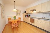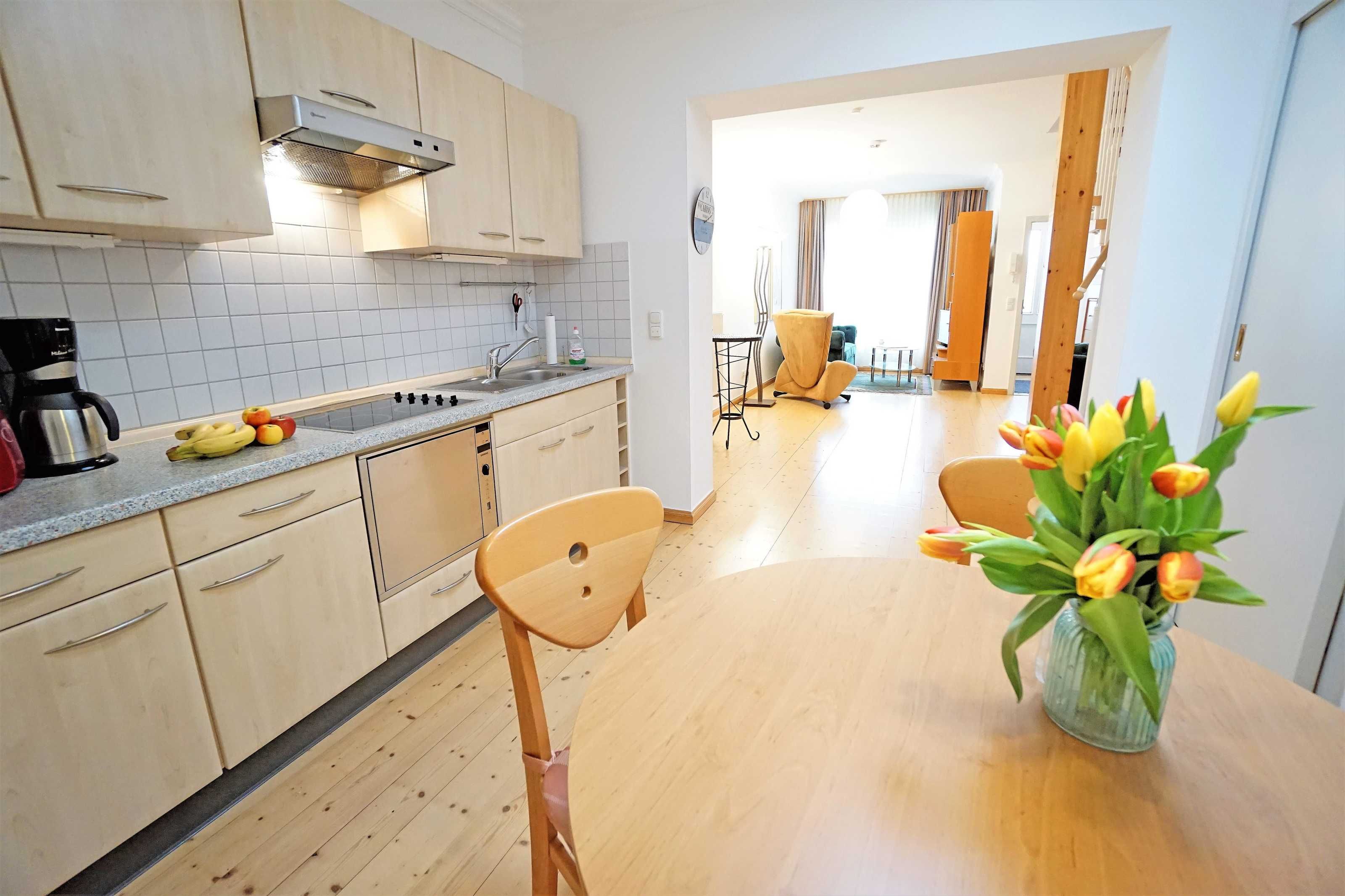 Das geräumige Wohn-Esszimmer im Erdgeschoss wartet mit einer gemütlichen Sitzgruppe, einem Flachbildfernseher, einem schönen Esstisch sowie einer vollausgestatteten Küche mit Cerankochfeld, Mikrowelle und Geschirrspüler auf.