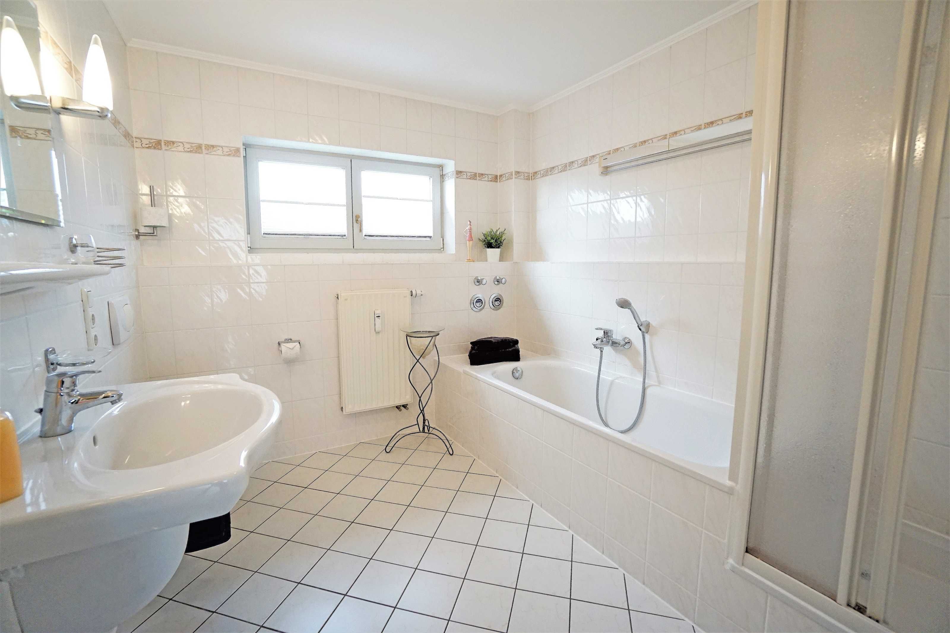 Desweiteren befindet sich im Obergeschoss das Badezimmer mit Dusche, Badewanne und WC.