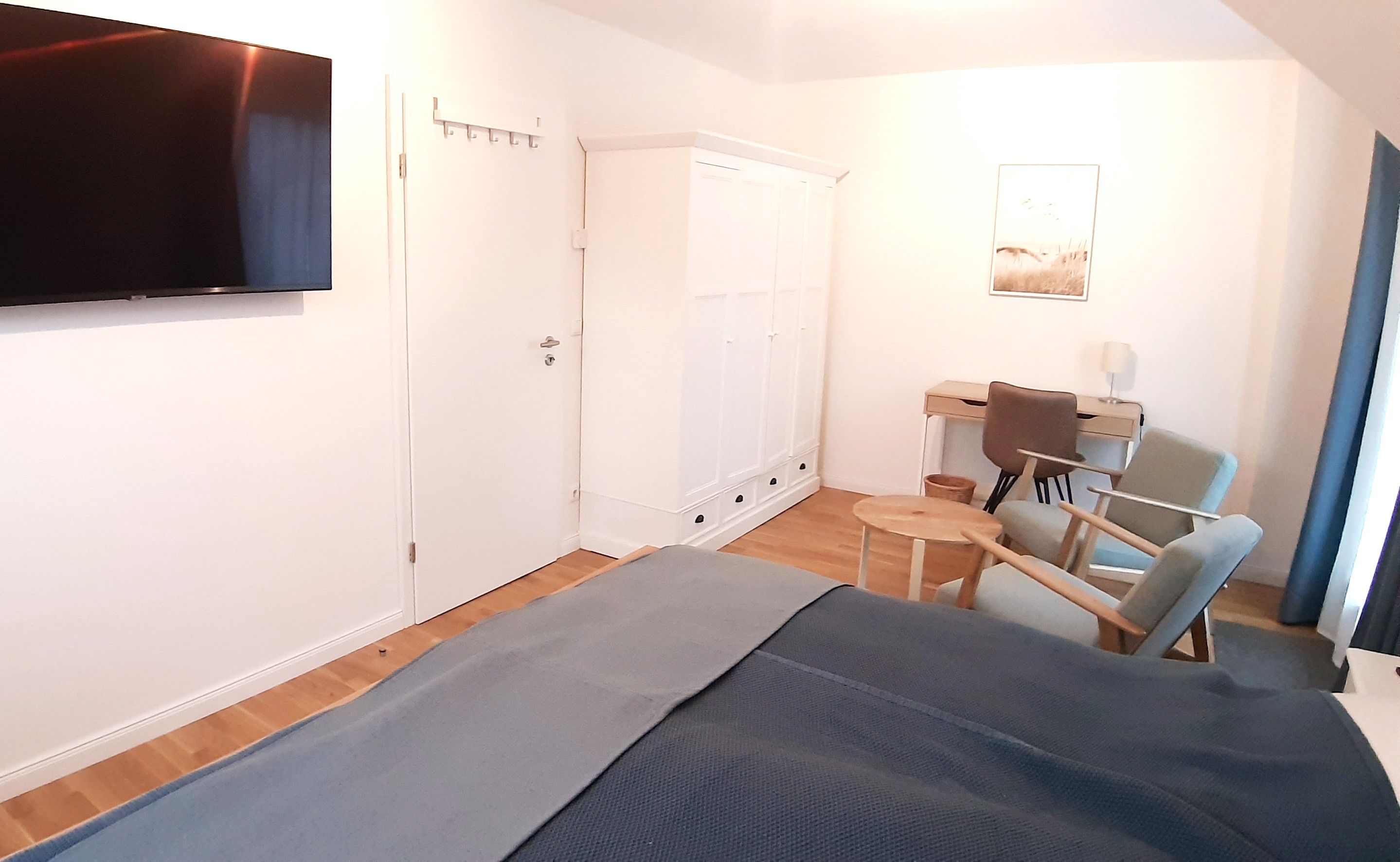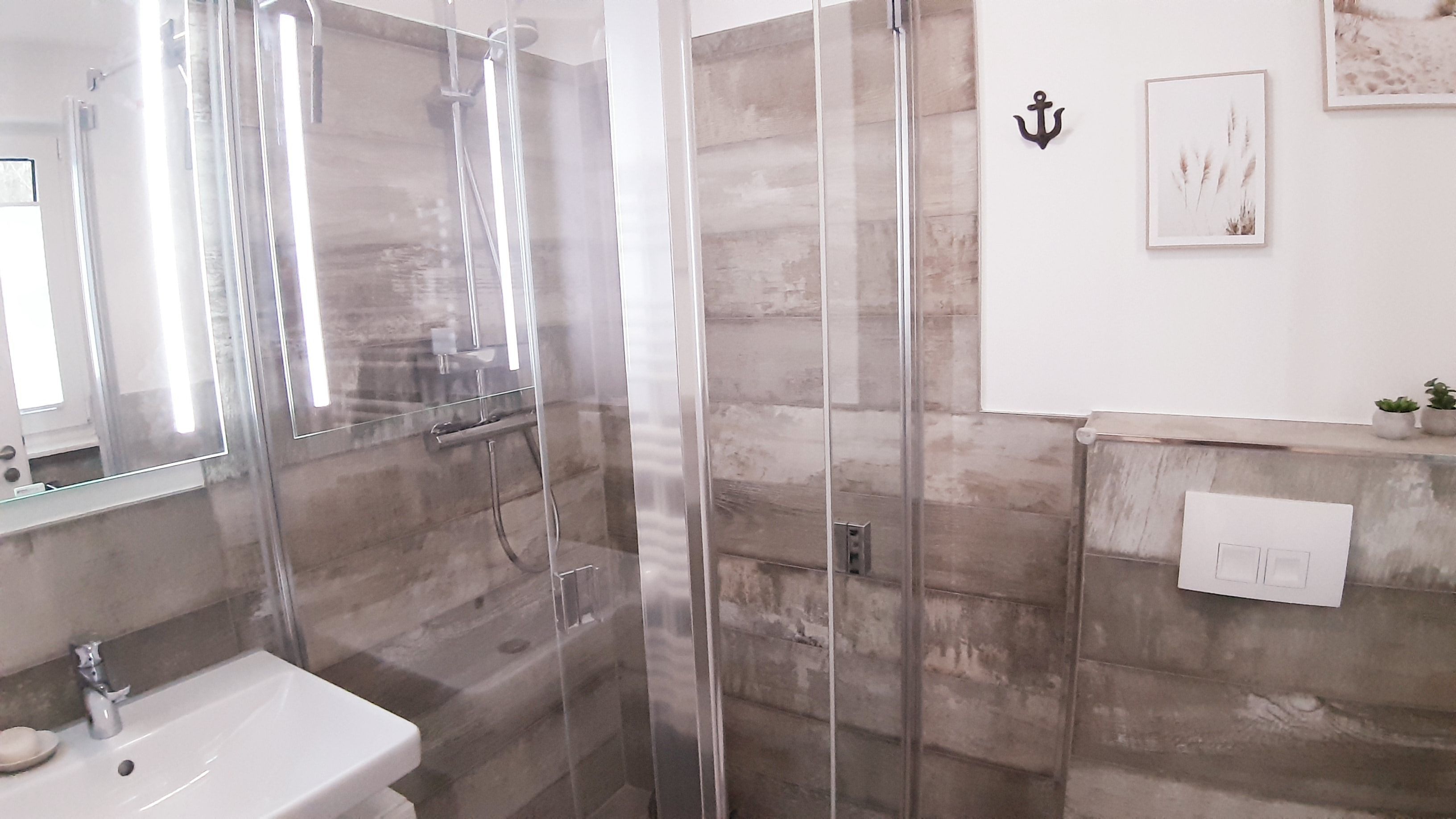 In 4 Schlafzimmern finden bis zu 8 Personen ein Plätzchen. 3 Bäder auf 3 Etagen garantieren, dass sowohl mehrere Paare als auch große Familien mit mehreren Generationen den gemeinsamen Urlaub und Privatsphäre genießen können. Im barrierefreien EG befindet sich ein Schlafzimmer mit zwei 80cm x 200cm großen Betten, welche zu einem großen Bett zusammengeschoben werden können. In dem angrenzenden Bad ist eine Dusche vorhanden. Im 1. OG haben 2 Schlafzimmer mit jeweils einem Doppelbett (180 cm x 200 cm) Zugang zu einem großzügigen Wellnessbad mit Sauna und Dusche. Eines der Schlafzimmer hat einen direkten Zugang zu einer großzügigen Dachterrasse, von der man auf den Leuchtturm, den Bodden und ins angrenzende Grün blickt - ideal für eine kurze Auszeit oder die Ruhephase zwischen den Saunagängen. Zusätzlich ist eines der Zimmer mit einem Schreibtisch ausgestattet.