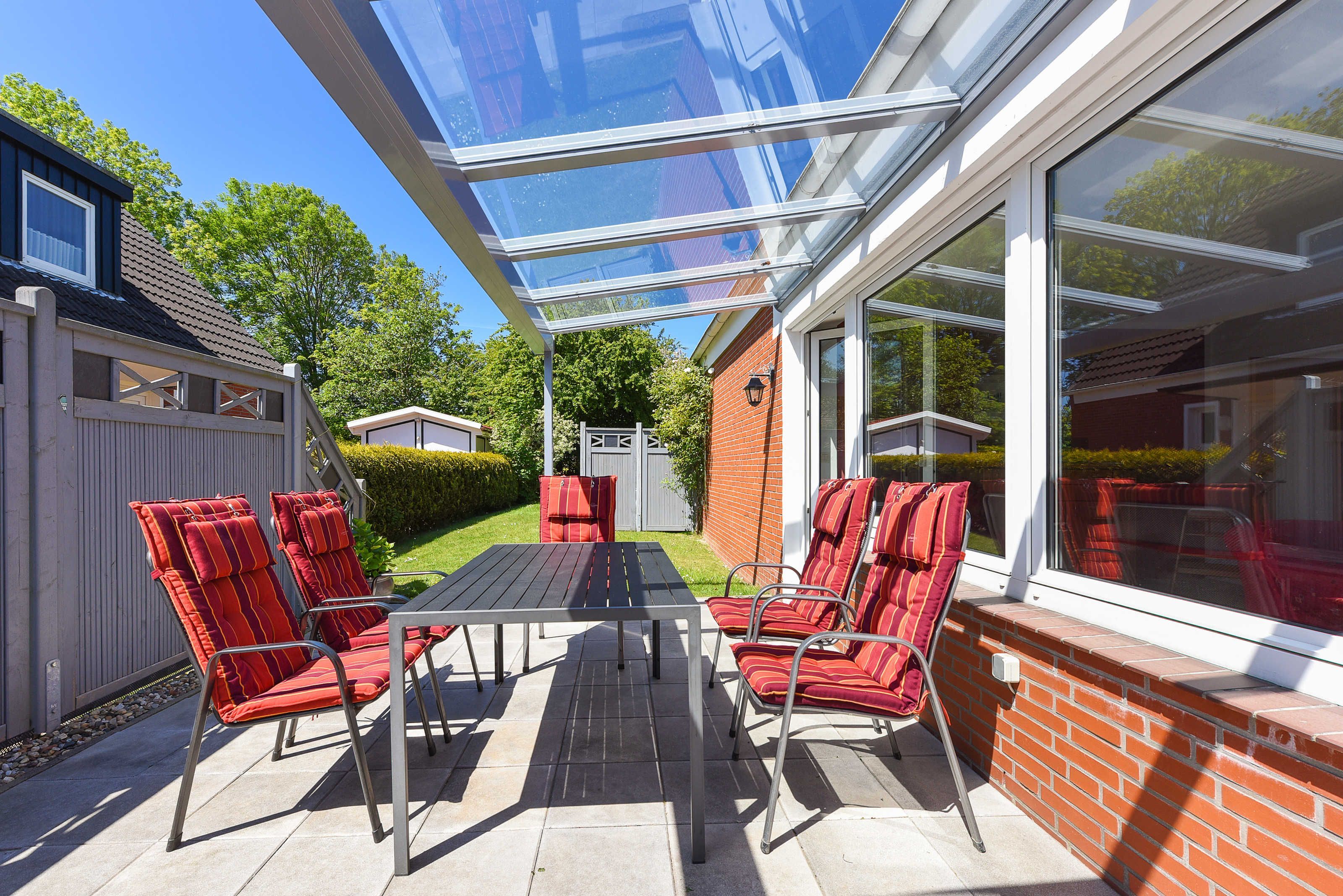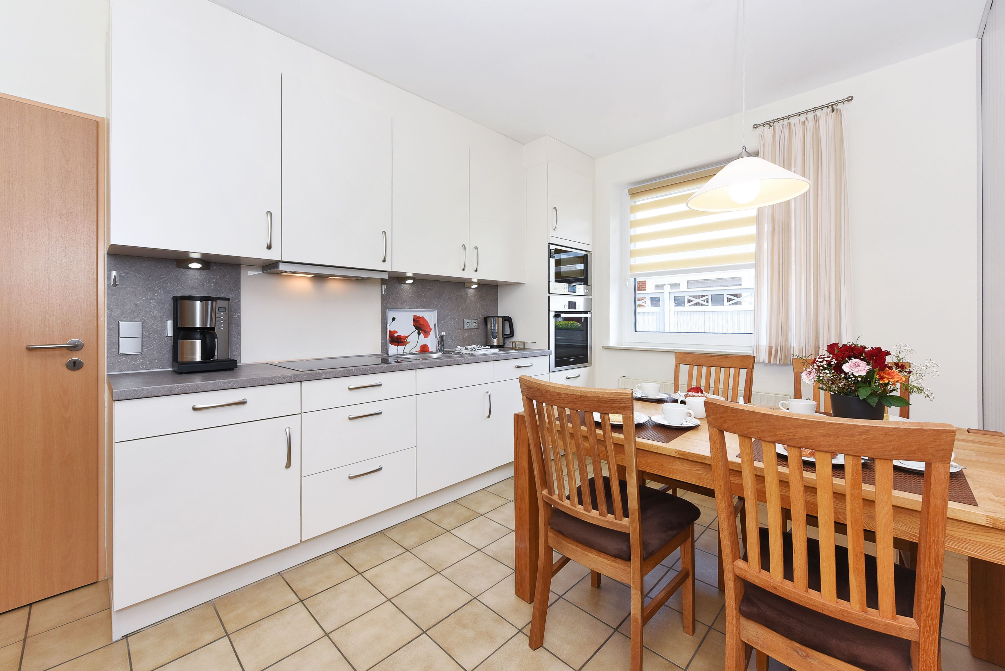 Unsere Wohnung „unten“ hat eine Terrasse. Ein schöner großer Garten steht Ihnen ebenfalls zur Verfügung. Natürlich gibt es in allen Wohnungen voll ausgerüstete moderne Einbauküchen und alles, was man überhaupt im Urlaub benötigen könnte. Jede Wohnung verfügt über eine Mikrowelle, Geschirrspüler ist in der größeren Wohnung vorhanden und Waschmaschine sowie Wäschetrockner stehen für Sie im Waschraum zur Verfügung.