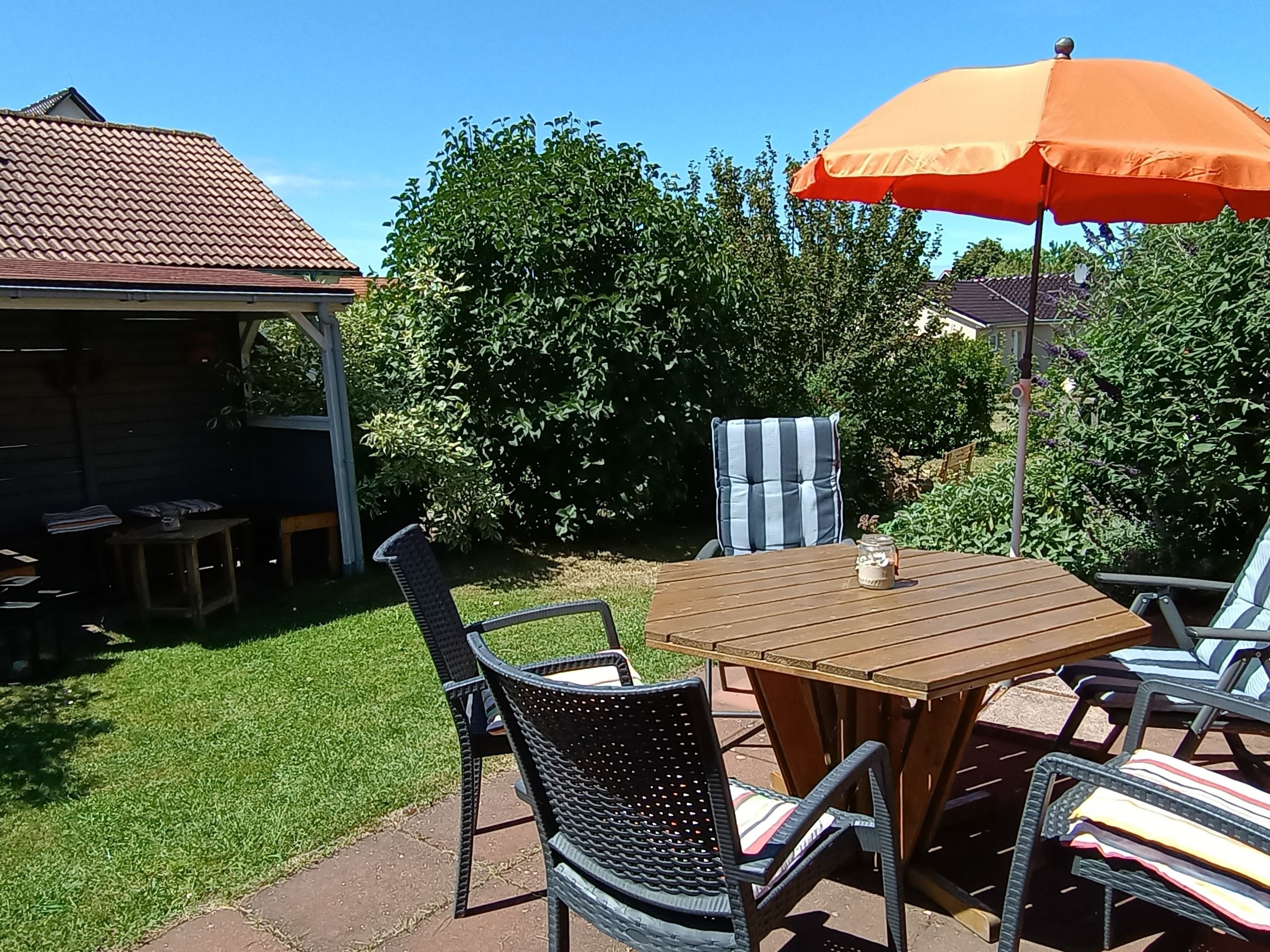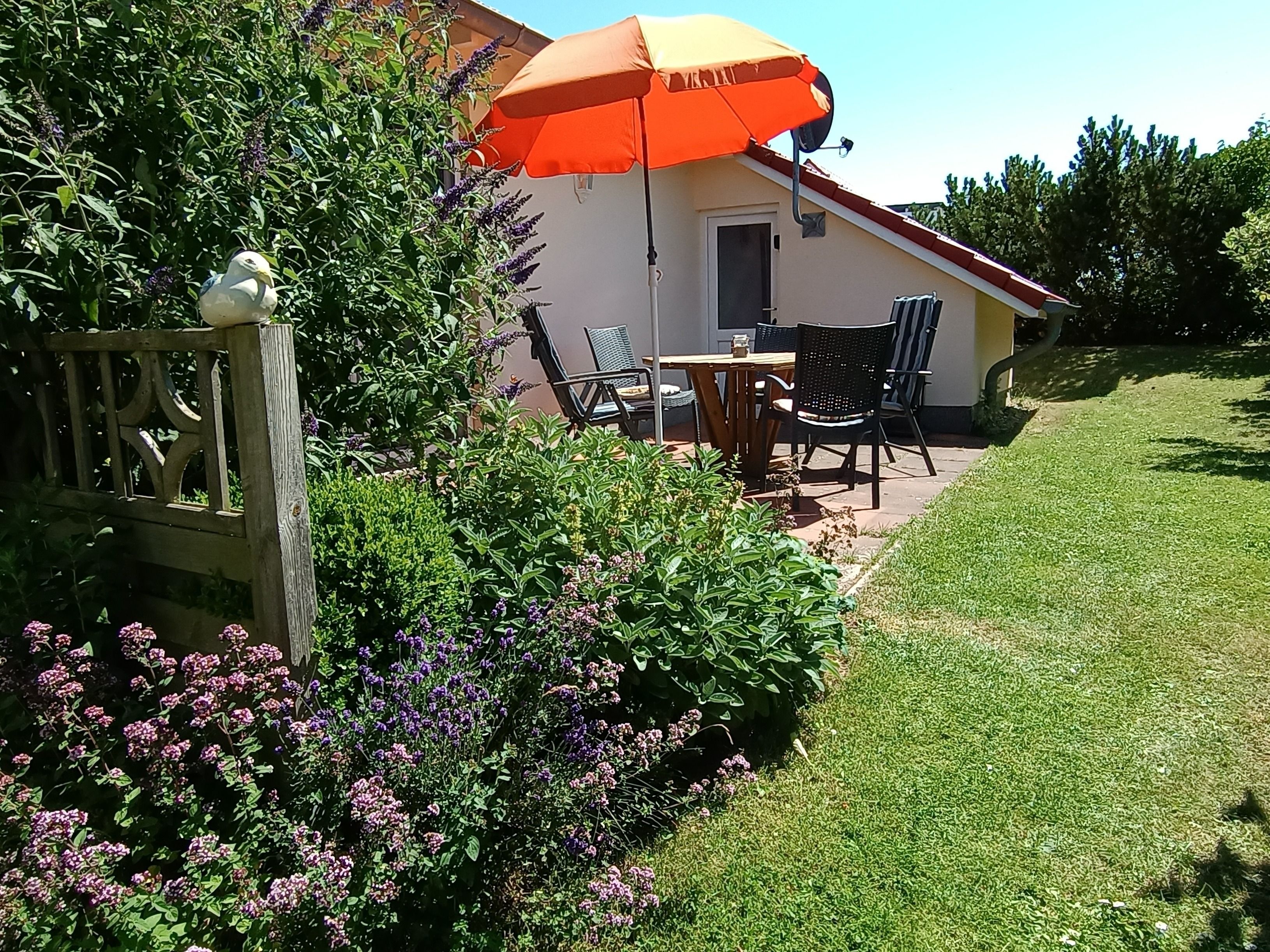 Rieke liegt auf einem mit blühenden Sträuchern, Blumeninseln und bunt blühendem Terrassenbeet liebevoll angelegten Grundstück. Es ist nicht eingezäunt. Rasen, Bolzplatz, Kinderrutsche und Sandkiste lassen Kindern viel Platz zum Spielen. Ein hauseigener Grillplatz mit Gartenpavillon rundet das Grundstück ab.