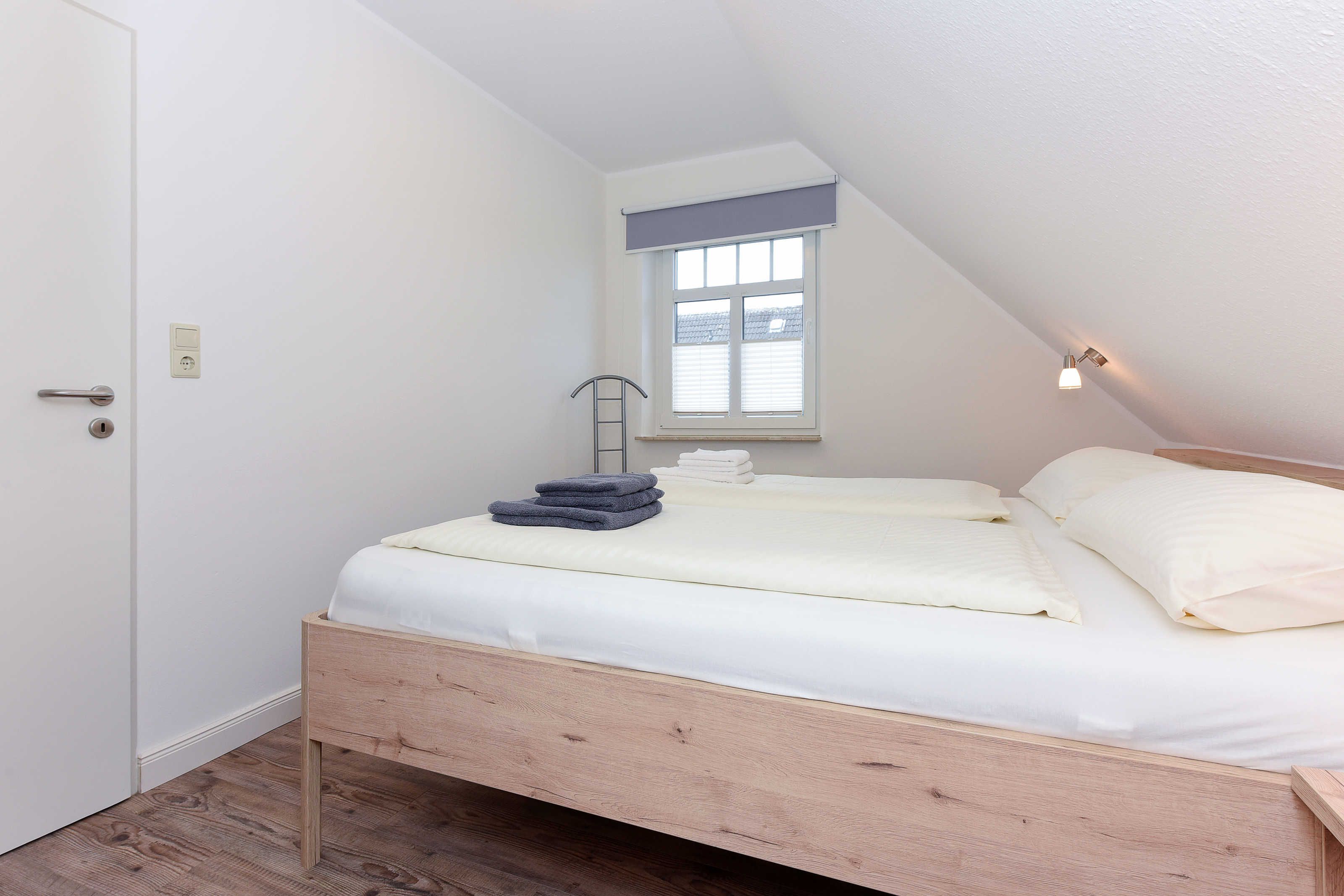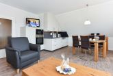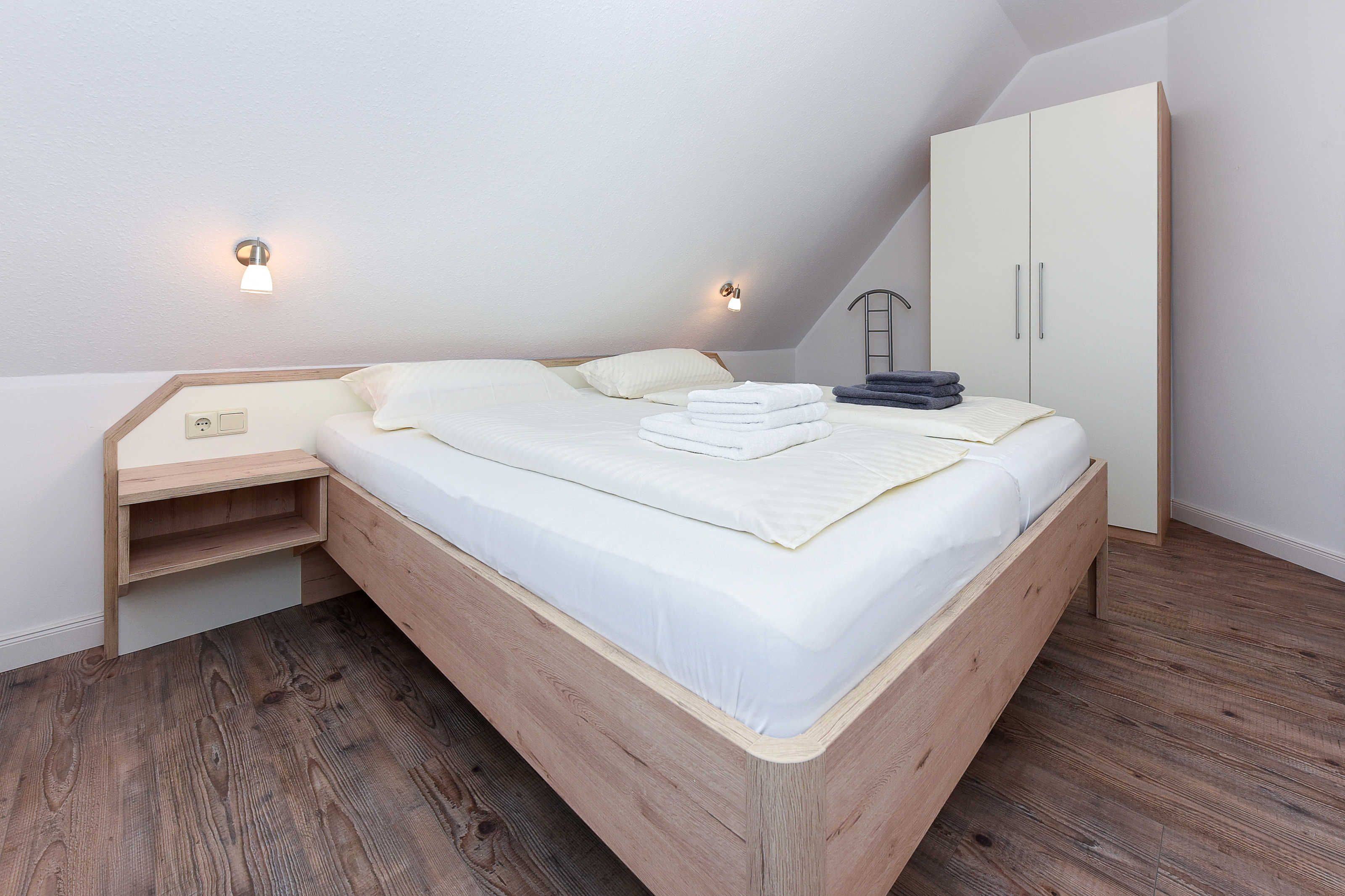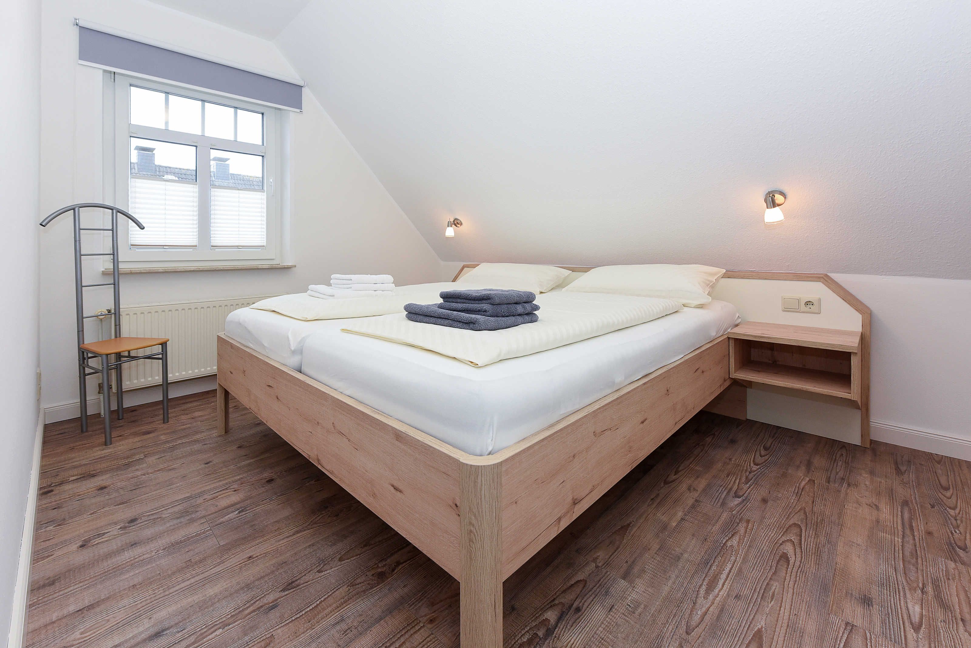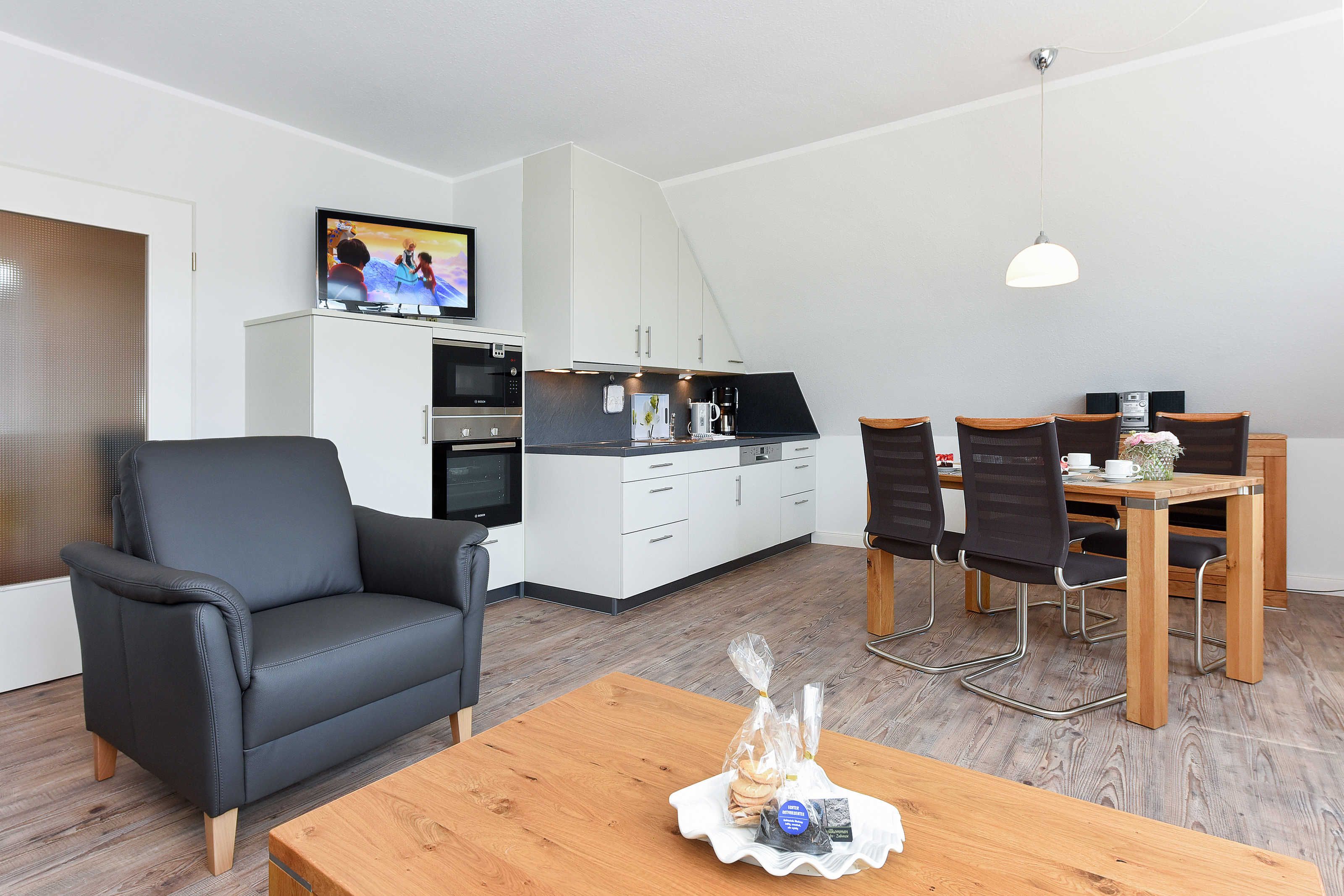 Größe ca. 60 Quadratmeter, Wohnraum mit integrierter Küche und Essgruppe, Schlafzimmer, zweites separates Schlafzimmer/Kinderzimmer, Badezimmer mit Dusche, Waschtisch und WC, Obergeschoss, Balkon, optimal für 2 bis 4 Personen.