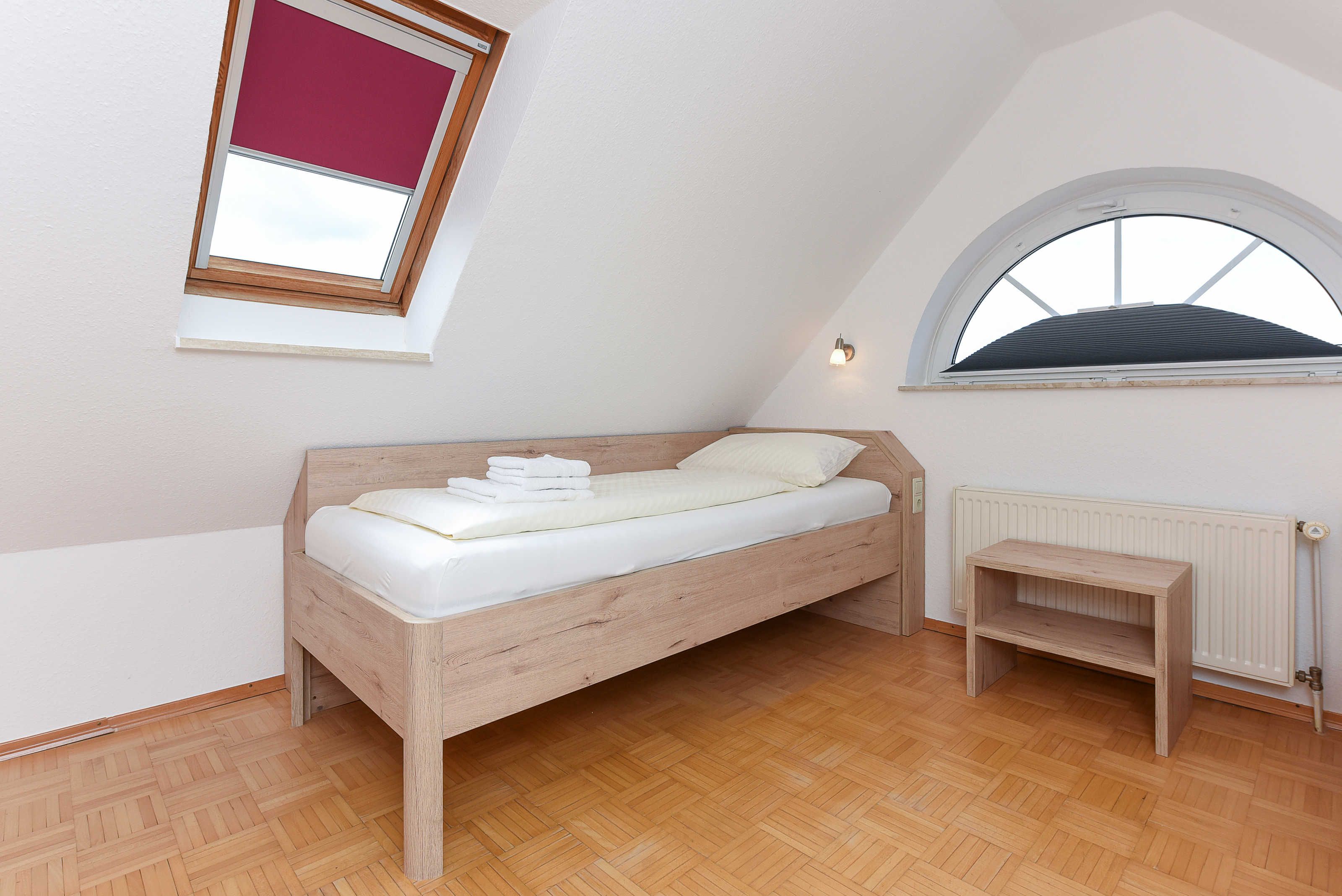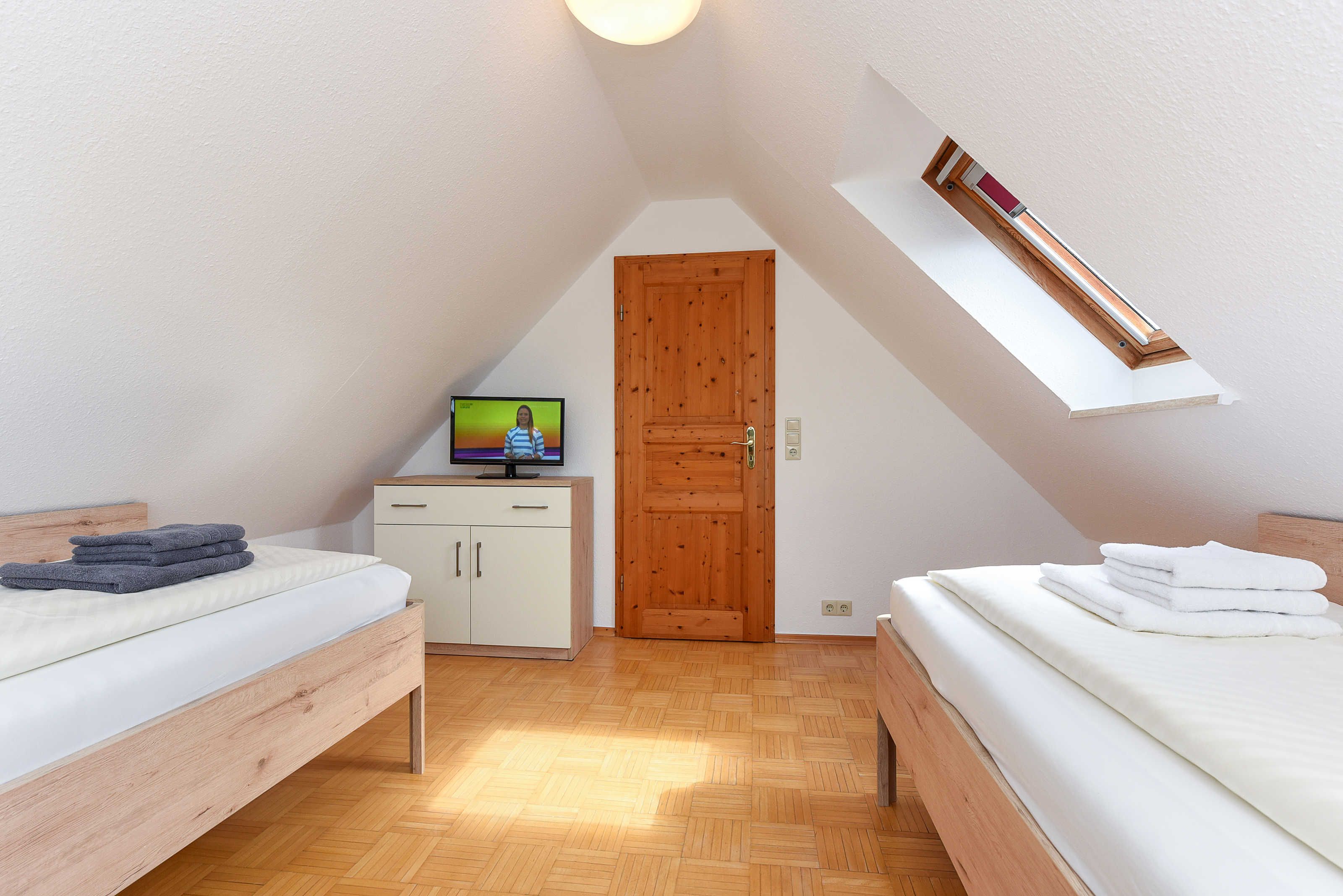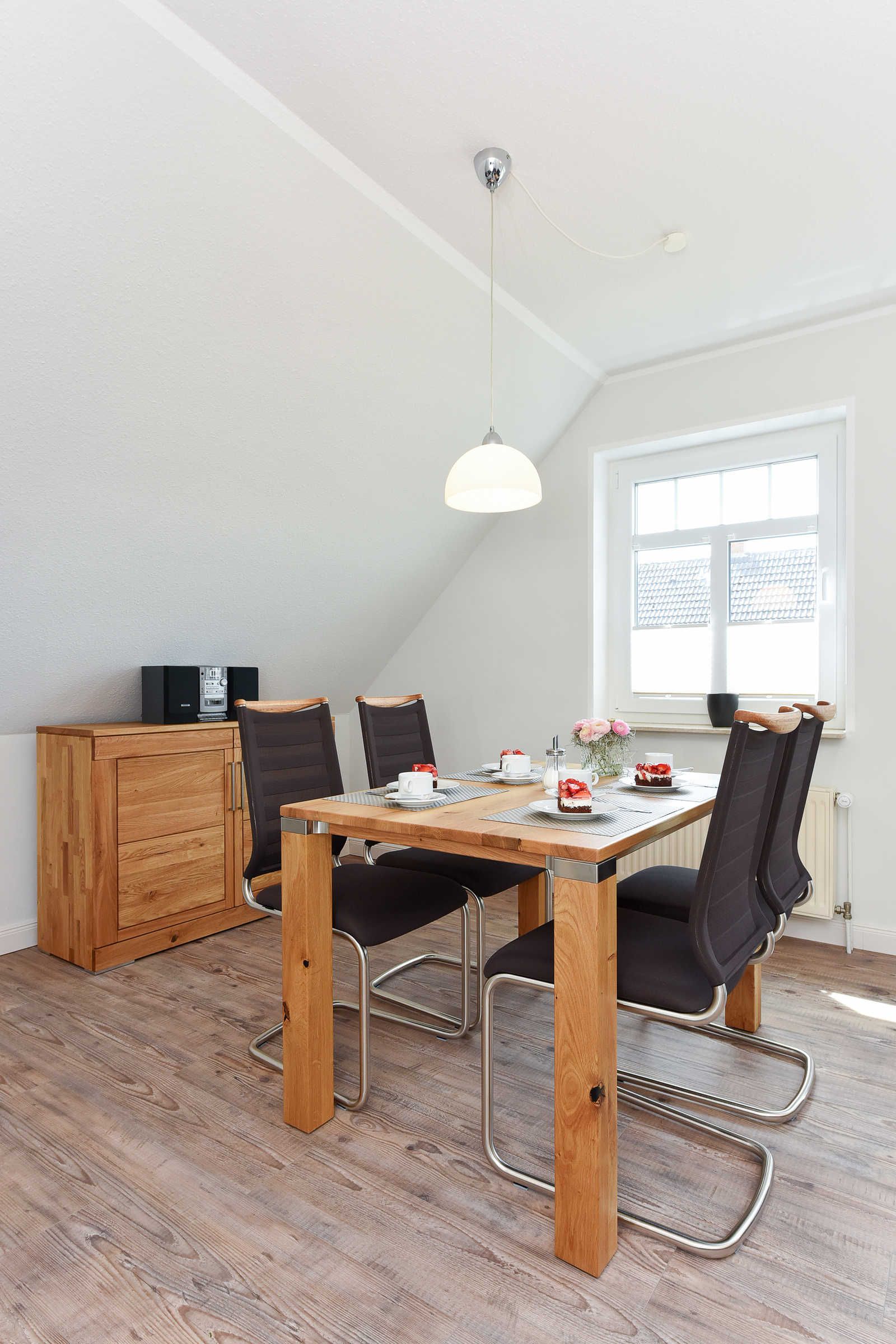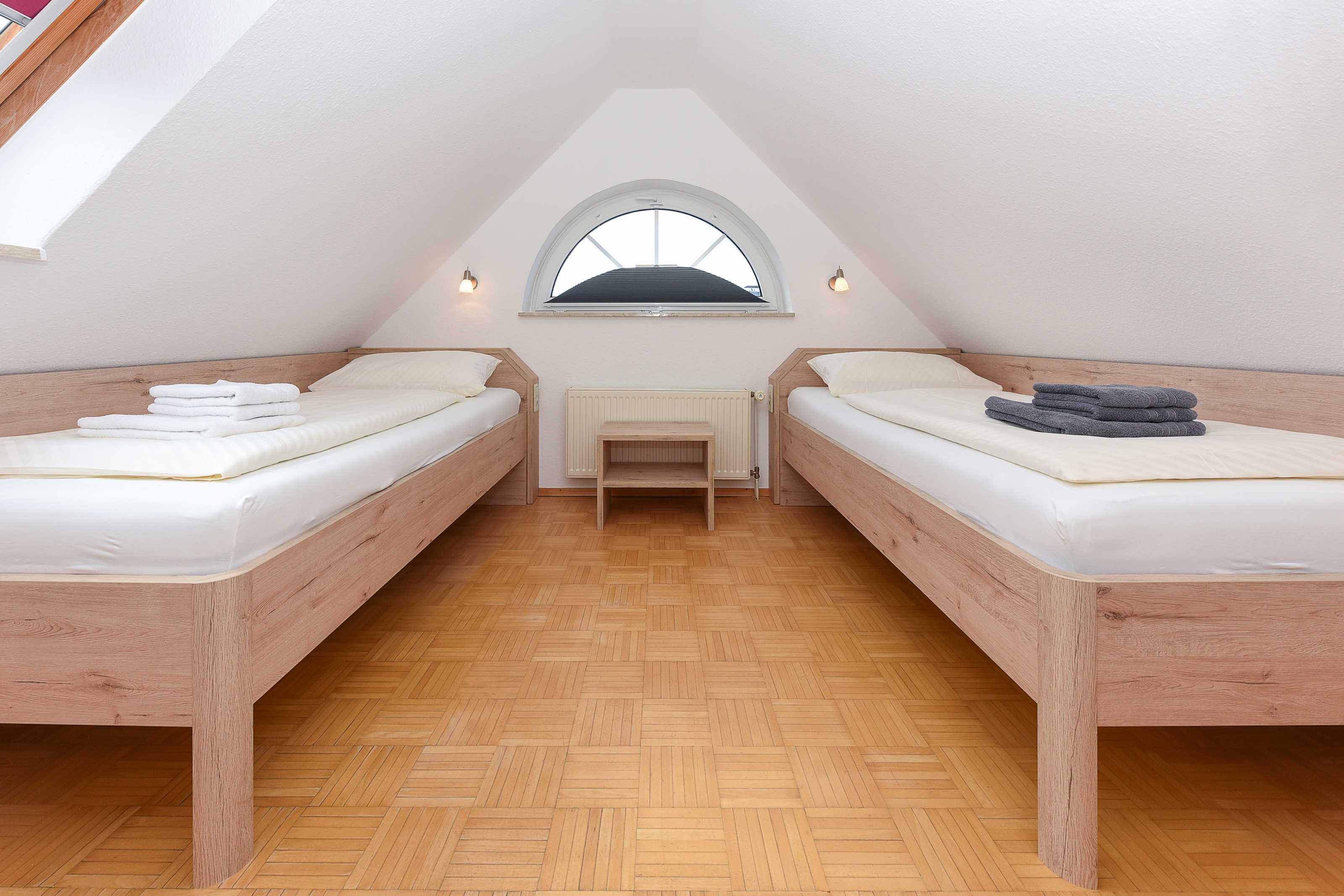 Größe ca. 60 Quadratmeter, Wohnraum mit integrierter Küche und Essgruppe, Schlafzimmer, zweites separates Schlafzimmer/Kinderzimmer, Badezimmer mit Dusche, Waschtisch und WC, Obergeschoss, Balkon, optimal für 2 bis 4 Personen.