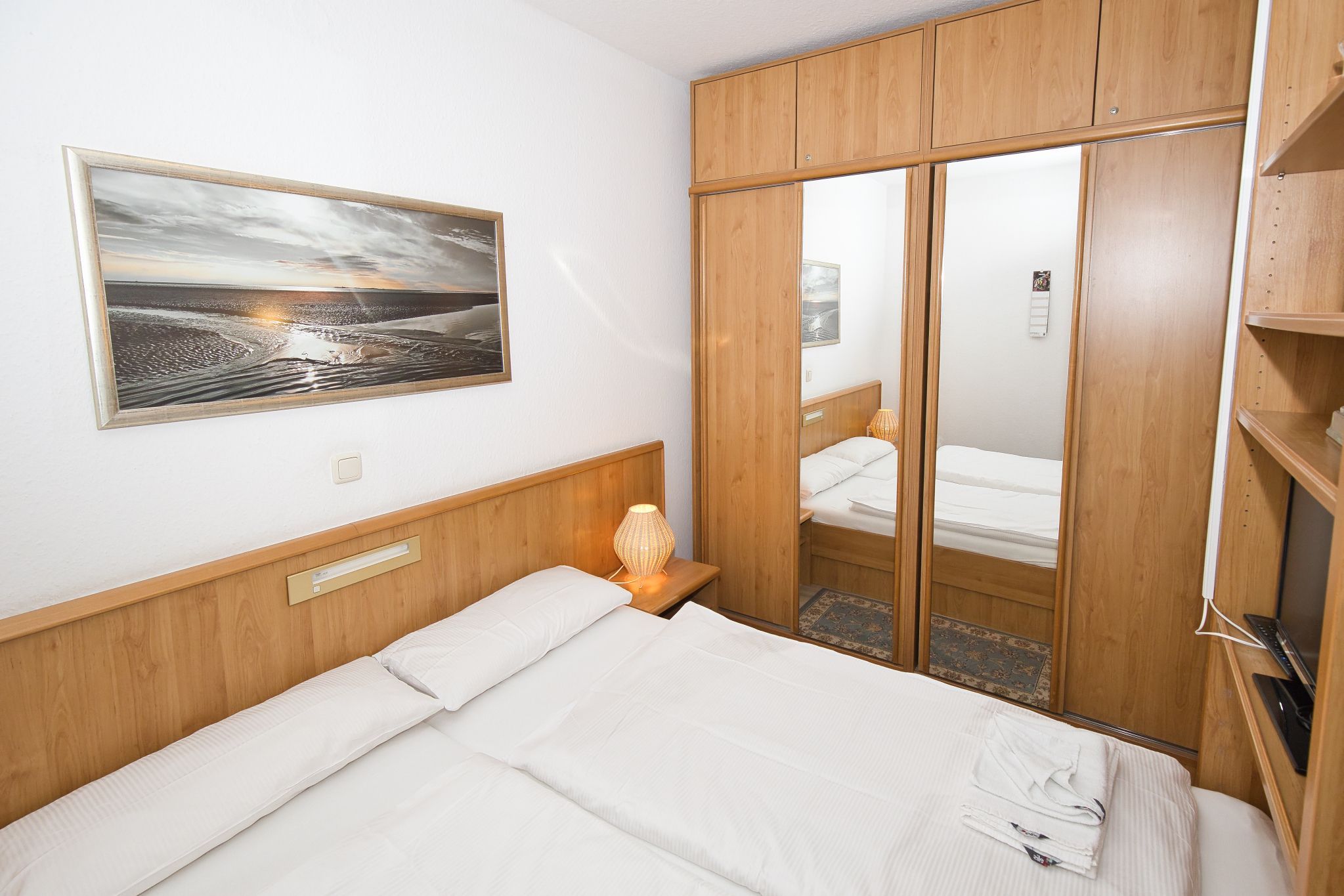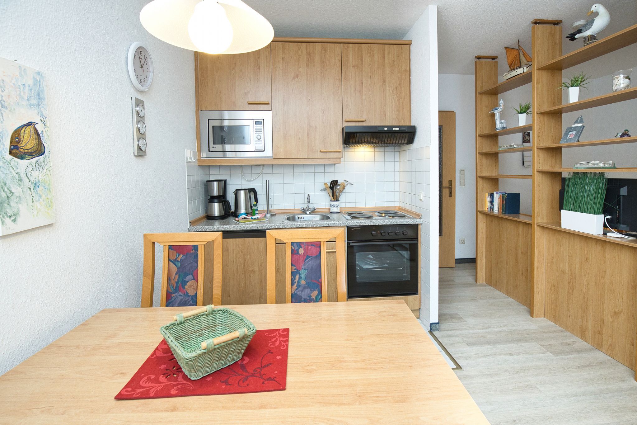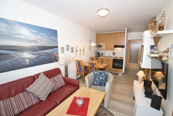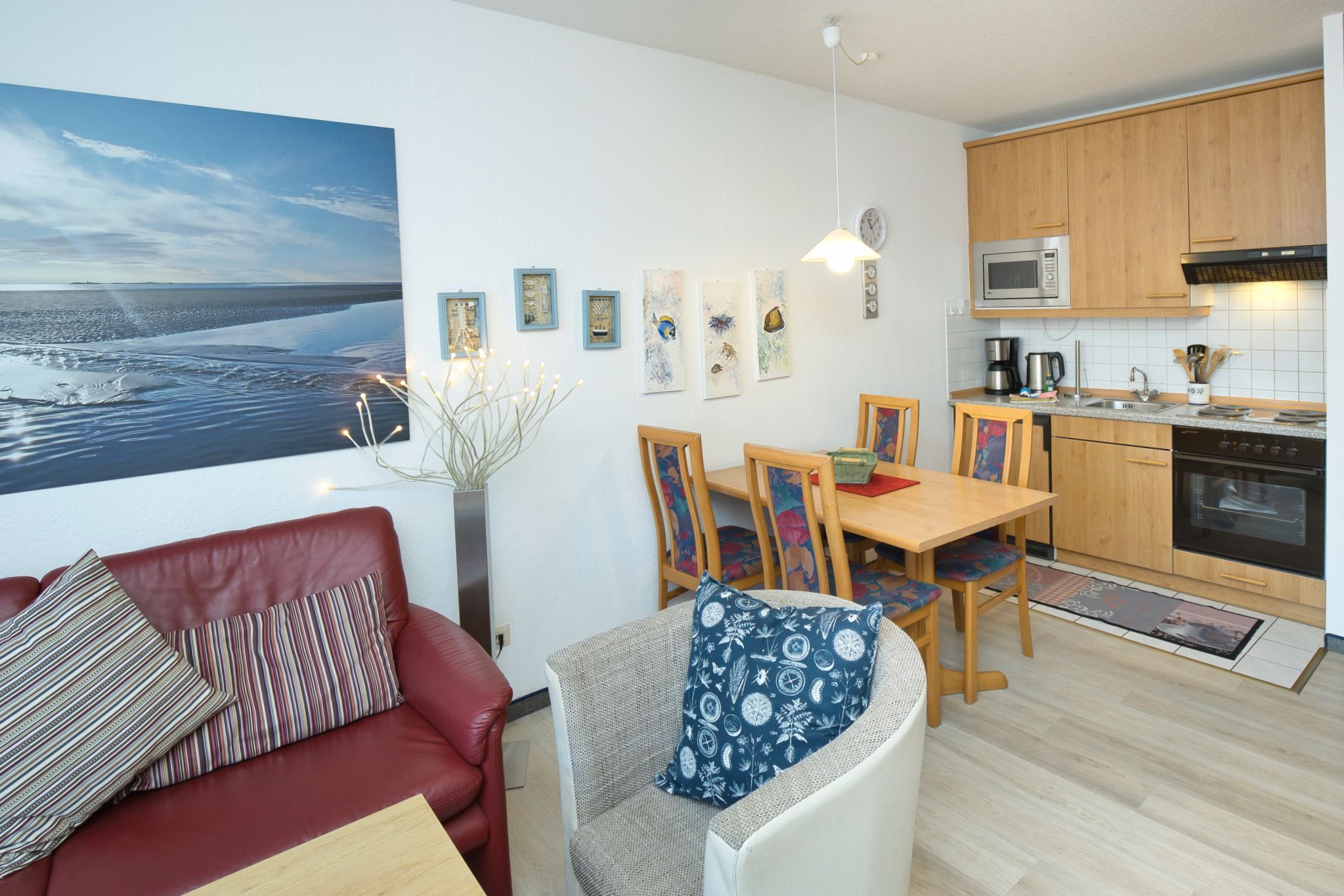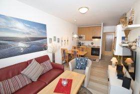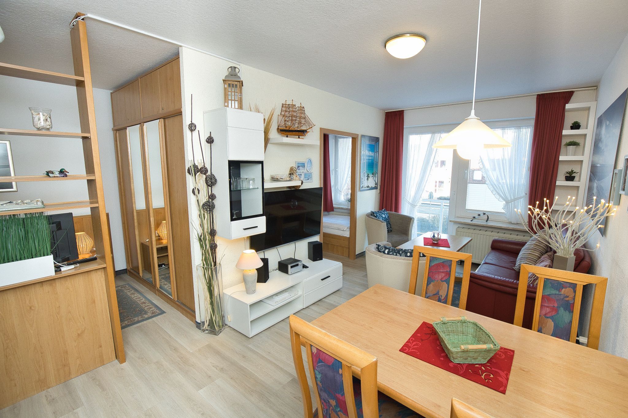 Ankommen und Wohlfühlen, dies soll das Motto dieser mit einem pfiffigen Grundriss aufgeteilten Ferienwohnung im Albatros Döse sein. Die 2-Raum Ferienwohnung mit 2 Schlafbereichen ist aufgeteilt mit einem gemütlichem Wohn- Ess- Küchen- und einem 1. Schlafbereich mit Doppelbett, sowie einem Schlafzimmer mit 2 Einzelbetten. Der Schlafbereich (mit bezogener Bettwäsche) mit einem Doppelbett ist ganz toll in einer Nische (gemeinsamer Wohn- und Schlafbereich) eingerichtet. Ein Schlafzimmer (mit bezogener Bettwäsche) befindet sich separat und ist mit 2 Einzelbetten ausgestattet. Im Küchenbereich finden Sie eine kleine aber feine Einbauküche und einem Essplatz für bis zu 4 Personen vor. Der Wohnbereich (TV, DVD-Spieler, freier Internetzugang) mit einer gemütlichen Couch lädt zum abendlichen entspannen ein. Von hier aus kommen Sie auch auf den sonnigen Westbalkon dieser Wohnung. Im Eingangsbereich der Wohnung befindet sich das hell geflieste Duschbad mit WC und ein kleiner Abstellschrank und eine Garderobe. Ihr PKW Parkplatz ist auf den gemeinsamen Parkplatz Ecke Vogelsand für Sie fest reserviert.