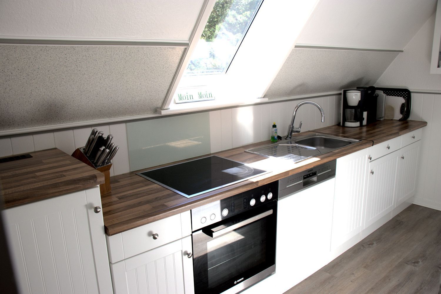 Die neue Küche ( separat) bietet alles, was zum täglichen Kochen benötigt wird: Backofen, Geschirrspüler u.v.m. Das Wohnzimmer verfügt über einen hellen Essplatz.