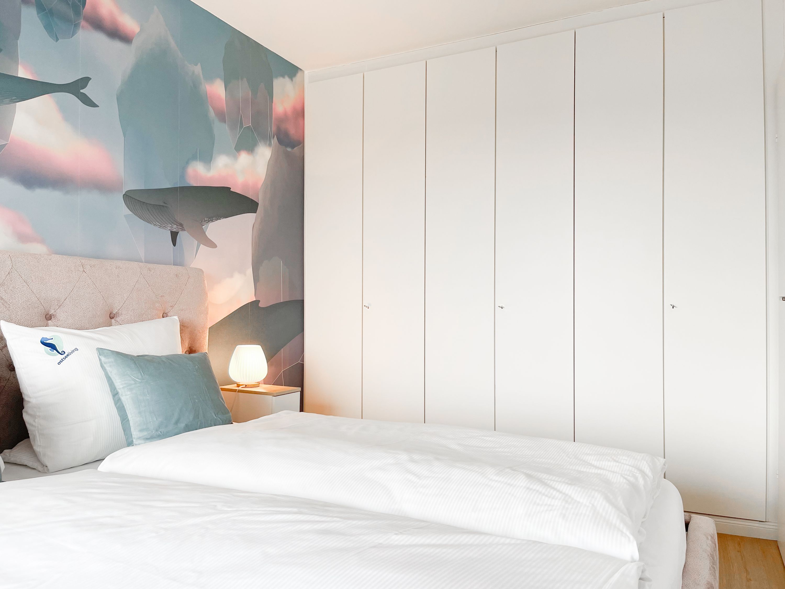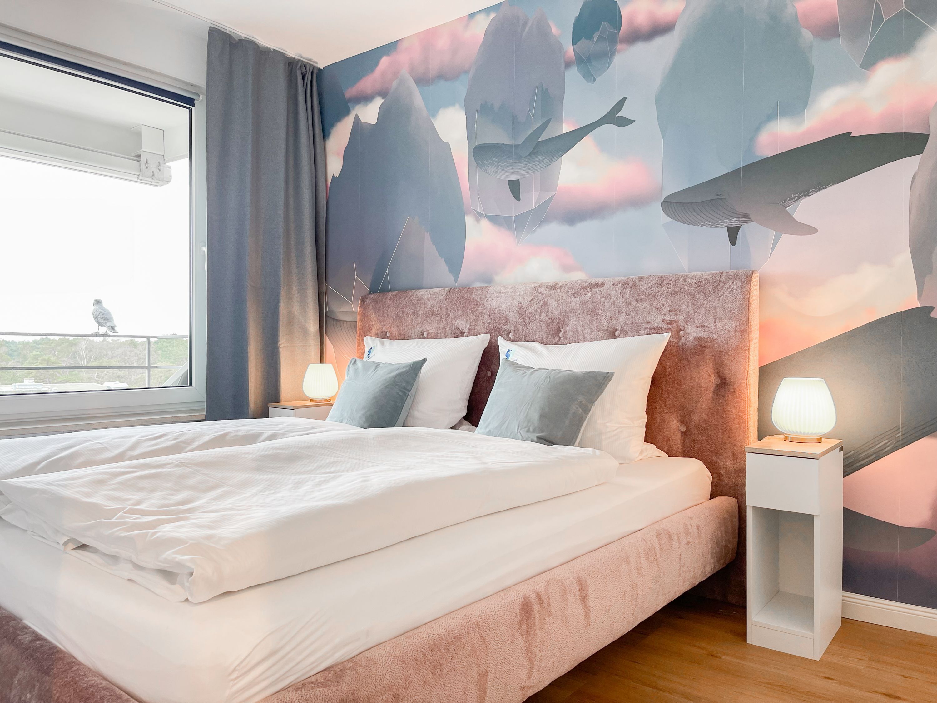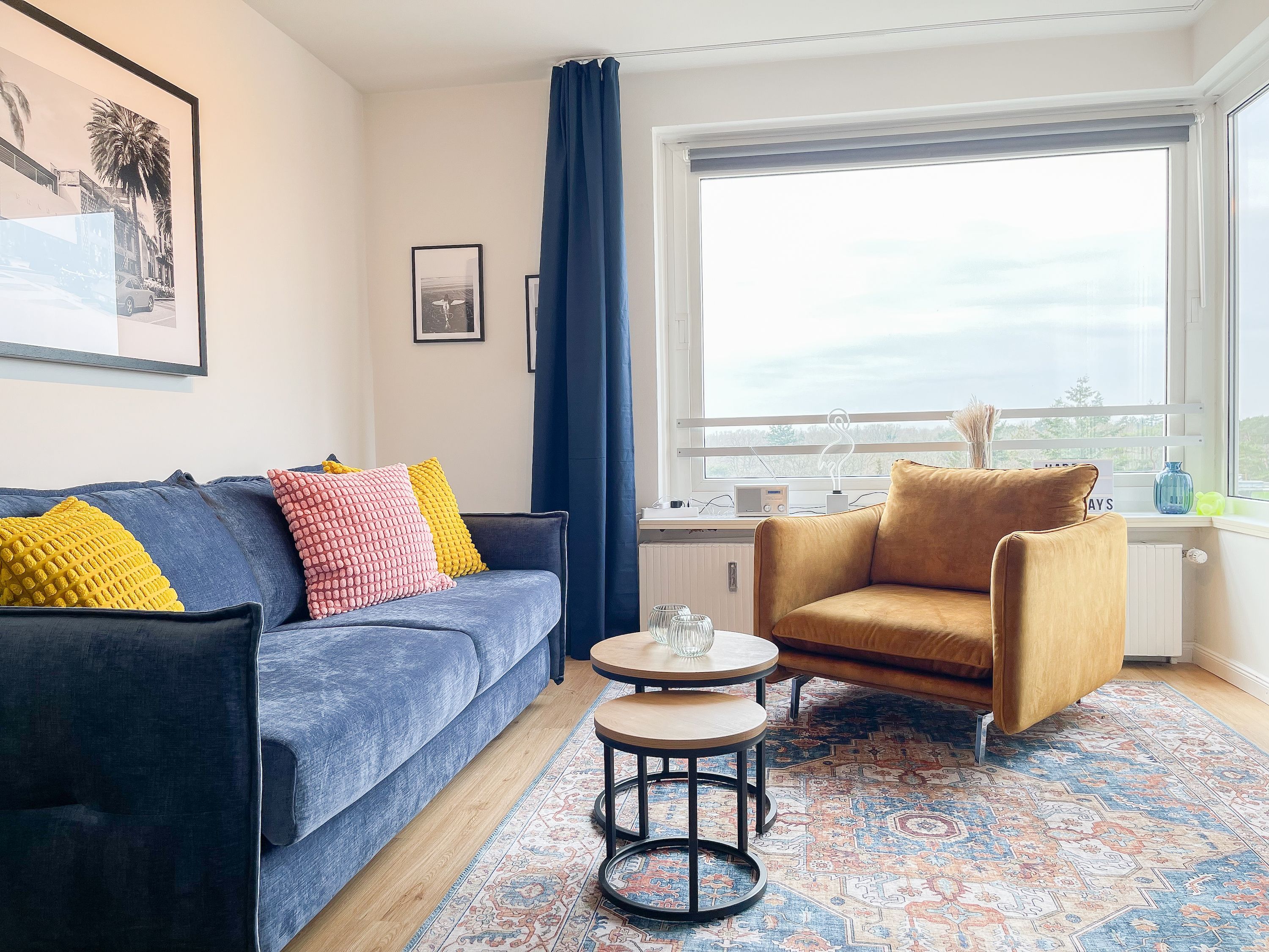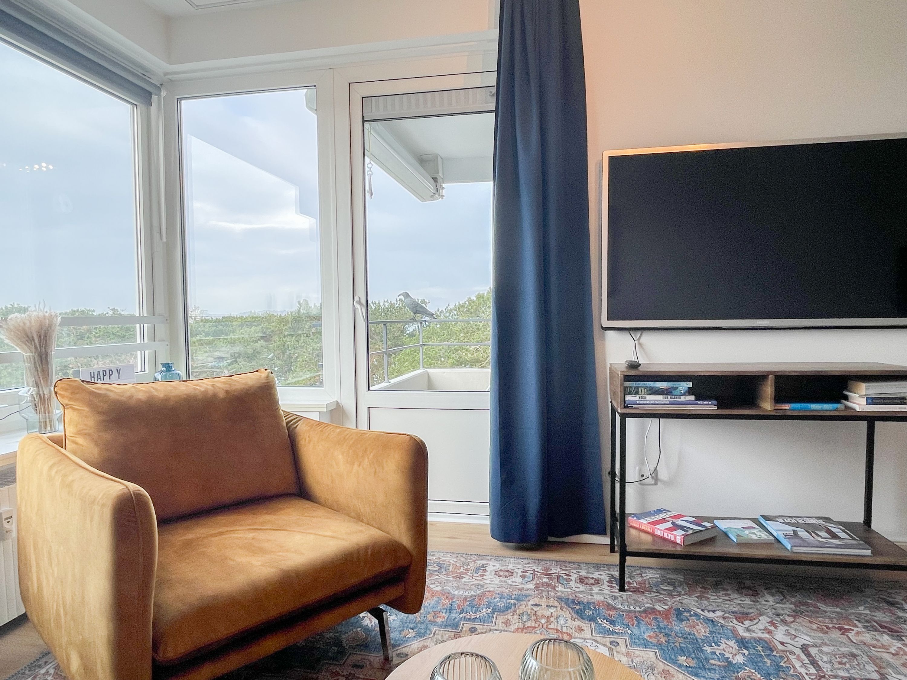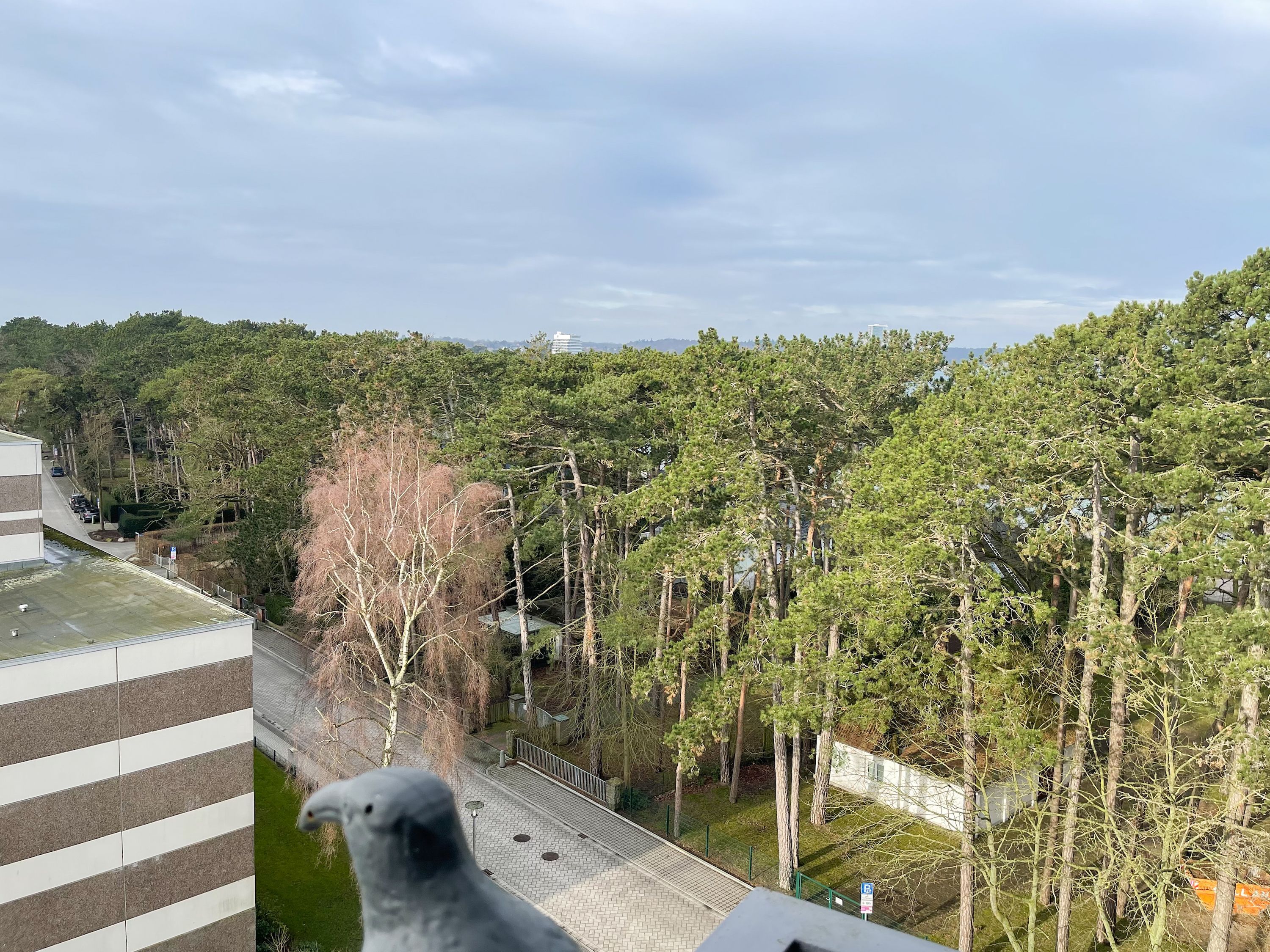 Die aufwendig renovierte und mit viel Liebe zum Detail eingerichtete Ferienwohnung befindet sich in der Endetage im Carpe Diem, einer gepflegten Wohnanlage. Es erwartet Sie ein lichtdurchfluteter Wohnbereich mit schönem Panoramablick, eingerichtet mit einem hochwertigen Schlafsofa, TV, Radio und WLAN sowie einem gemütlichen   Essbereich. Die offene, neue Einbauküche ist gut ausgestattet und verfügt über einen Backofen, Cerankochfeld und einen Kühlschrank mit Gefrierfach. Der Balkon in Südwestausrichtung ist mit Gartenmöbeln und einer Markise ausgestattet und bietet einen herrlichen Ausblick, teilweise kann man die Ostsee durch die Bäume blitzen sehen.  Meeresrauschen und die frische Seeluft sind garantiert. Das separate Schlafzimmer ist mit einem Doppelbett (180x200)und einem Kleiderschrank mit reichlich Stauraum für die Urlaubsgarderobe ausgestattet. Die Fenster sind mit Jalousien und Vorhängen zur Abdunkelung versehen. Zur Wohnung gehört ein Tiefgaragenstellplatz  (Einfahrthöhe 1,95m). Der Fahrstuhl geht bis in die 6. Etage, von dort ist die Endetage über Treppen zu erreichen.