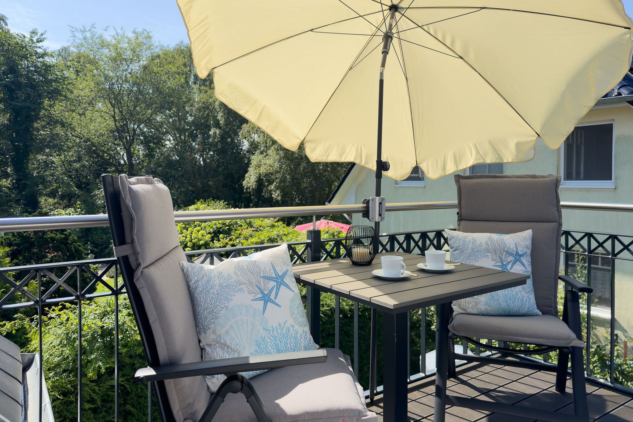 Beginnen Sie den Tag auf dem großzügigen Balkon mit Blick ins Grüne und genießen Sie die frische Meeresbrise. Nach einem Tag an der Ostsee bietet der Balkon den perfekten Ort, um bei einem Glas Wein zu entspannen.