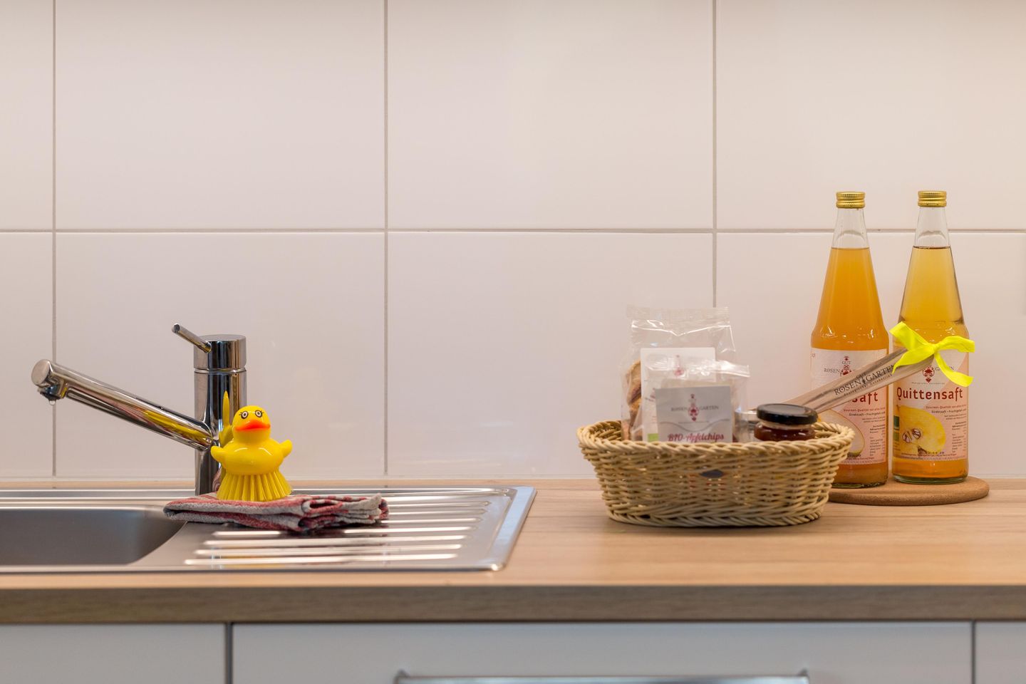 Die Wohnungen im Hauptgebäude sind für Individualreisende und Paare konzipiert und bieten auf 45-65 m² eine perfekte Ausstattung und ein liebevoll gestaltetes Ambiente. Sie verfügen alle über große Duschbäder, die Sie mit dem Wasser der Hertha-Quelle verwöhnen werden. Die Küchen sind modern und funktional mit Backofen und Cerankochfeldern, großem Kühlschrank und Spülmaschine ausgestattet. Hier können Sie Ihren Kochkünsten freien Lauf lassen. Falls Sie einmal nicht selbst kochen wollen, aber dennoch behaglich in den eigenen vier Wänden, im Garten oder auf dem Balkon speisen wollen, können Sie sich im Hofladen saisonale Gerichte holen, die aus im Gutsbetrieb angebautem Gemüse und Kräutern frisch zubereitet sind.