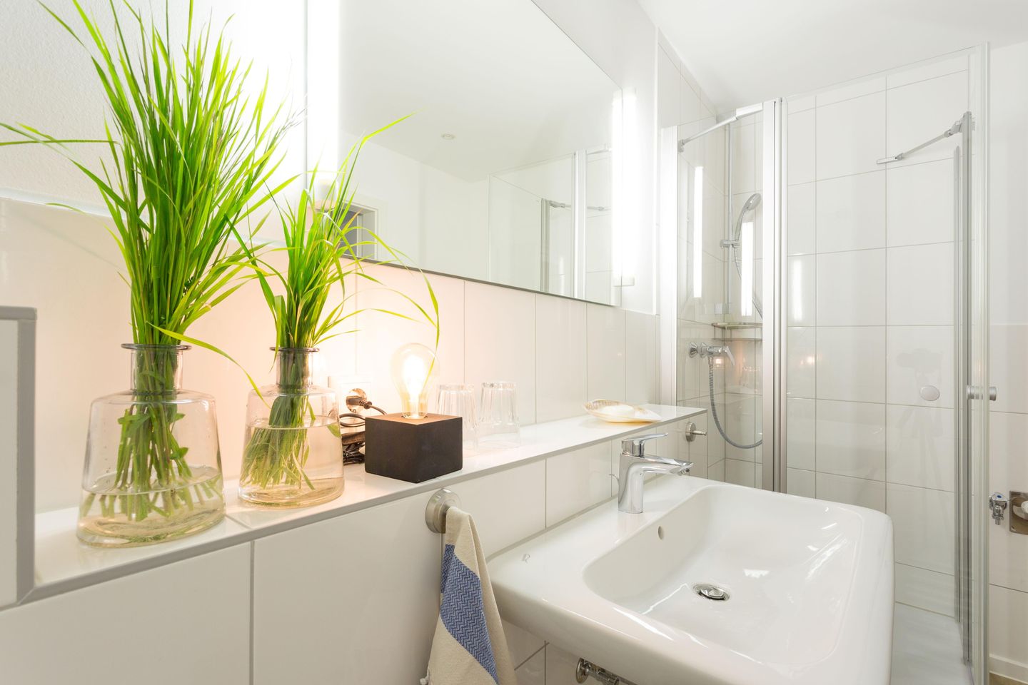 Das separate Bad umfasst Dusche, WC, Waschbecken und Ablagemöglichkeiten.