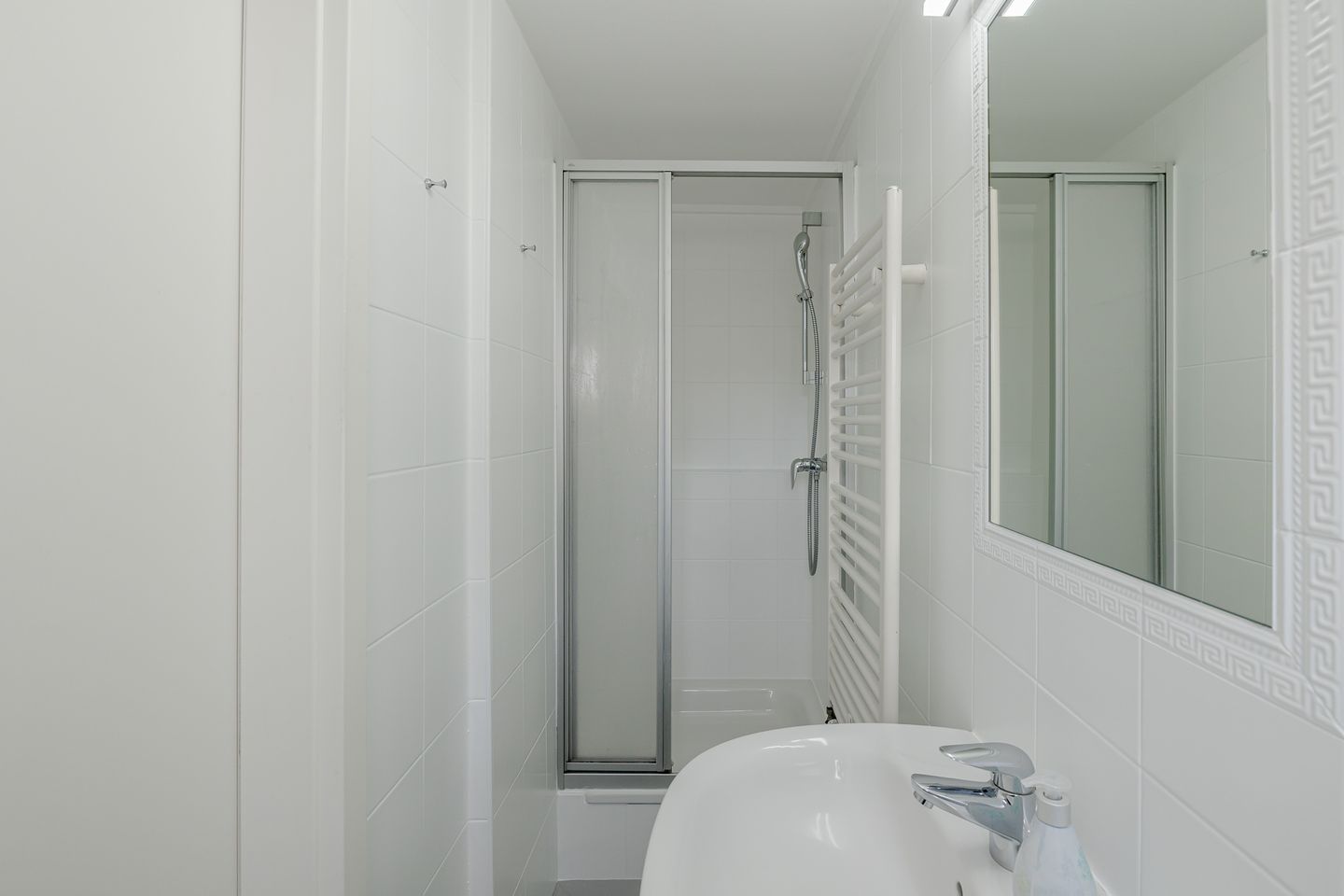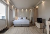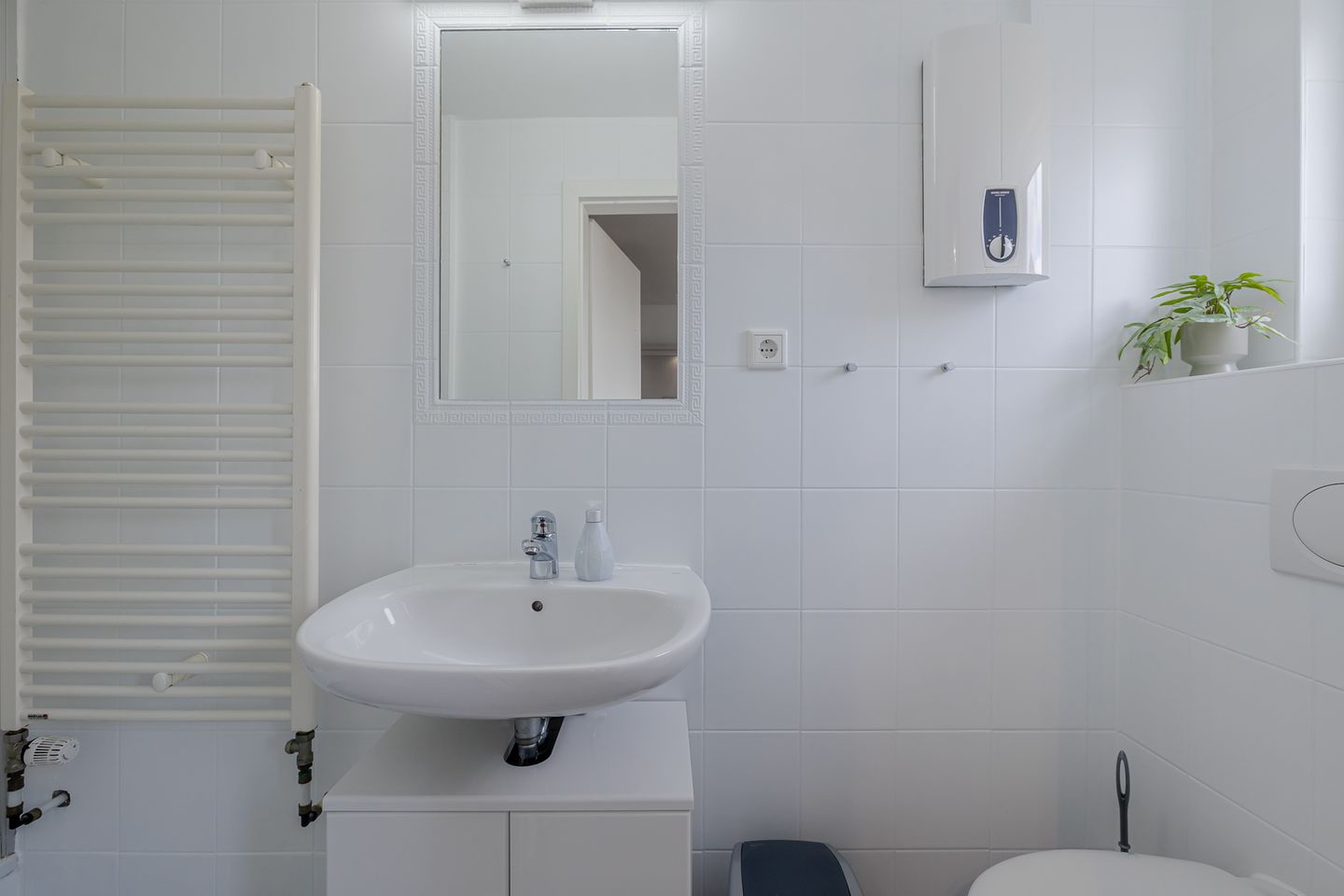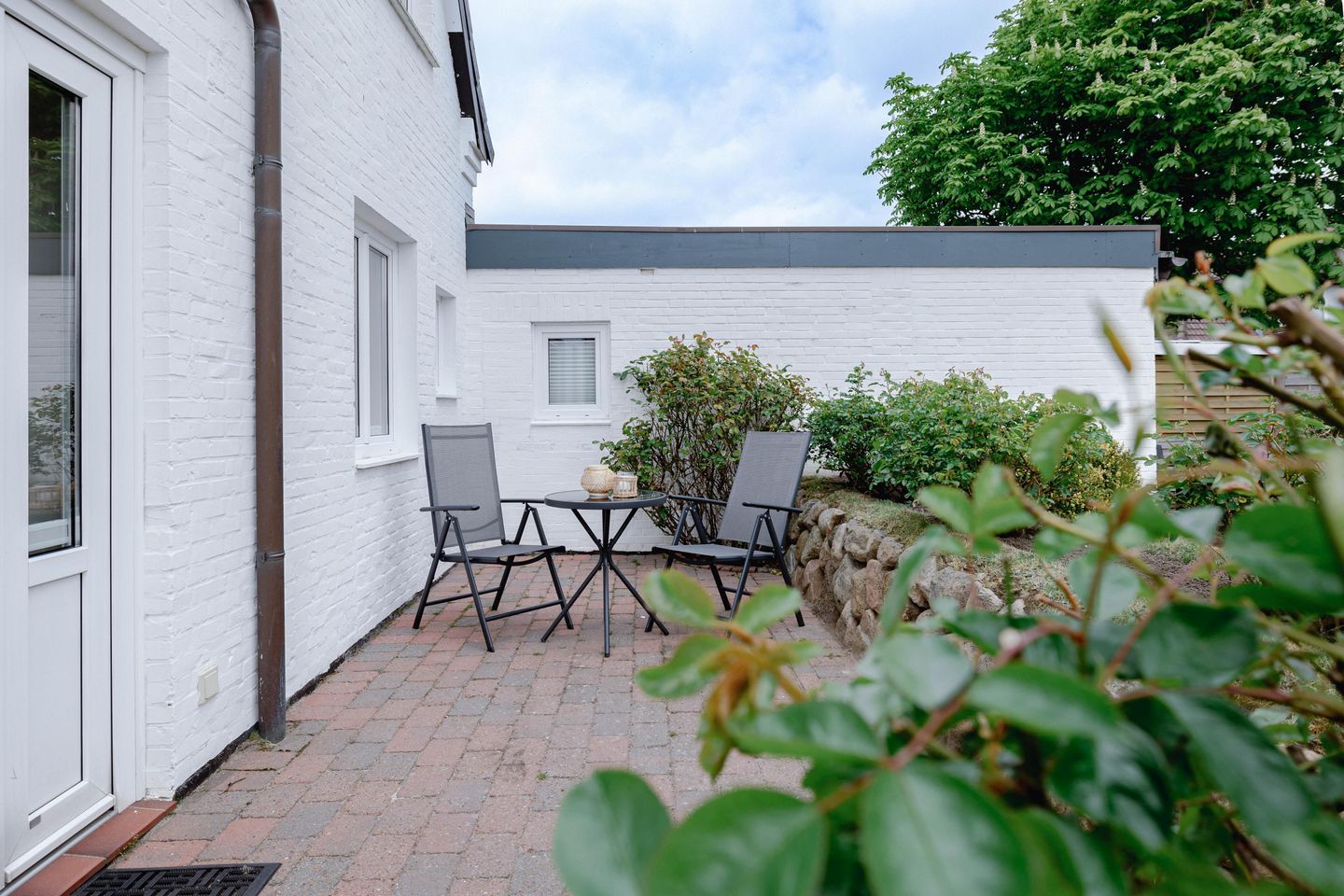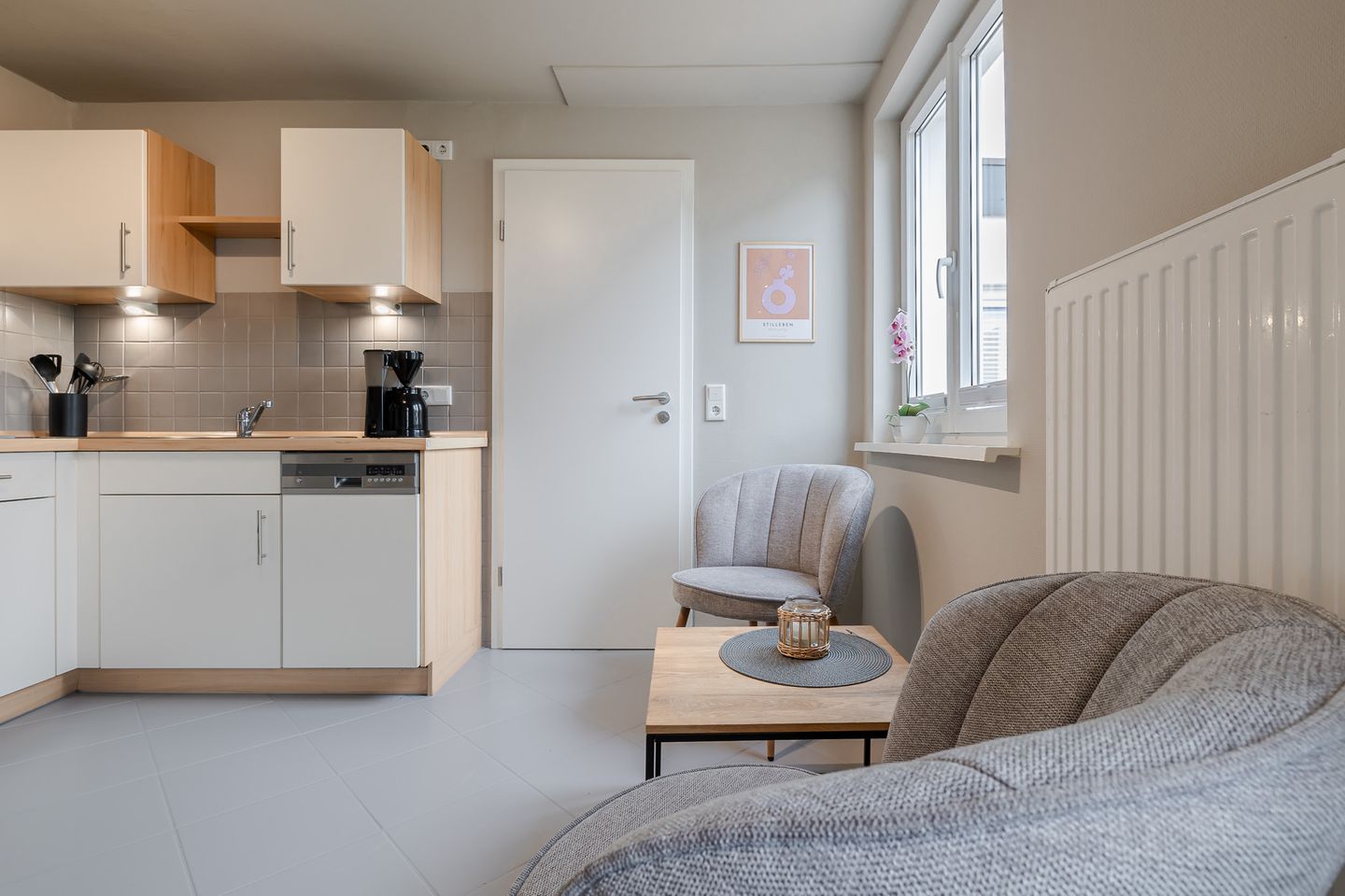 Hier findet wohnen, kochen und schlafen in einem Raum statt und das funktioniert dank der gelungenen Raumaufteilung ziemlich gut. Dafür sorgen eine gut ausgestattete Küchenzeile, ein kleiner Esstisch sowie ein bequemes Boxspringbett (1,60m Breite). Angrenzend befindet sich das helle Duschbad mit Fenster. Besonders schön: Die kleine Gartenterrasse!