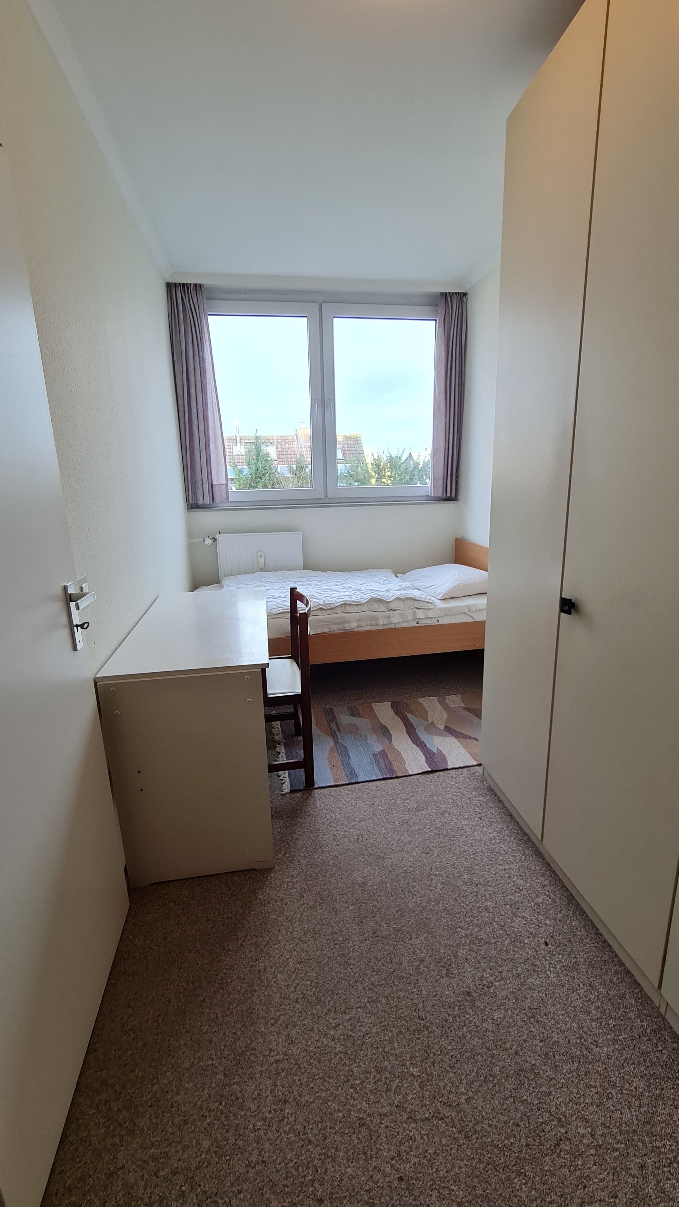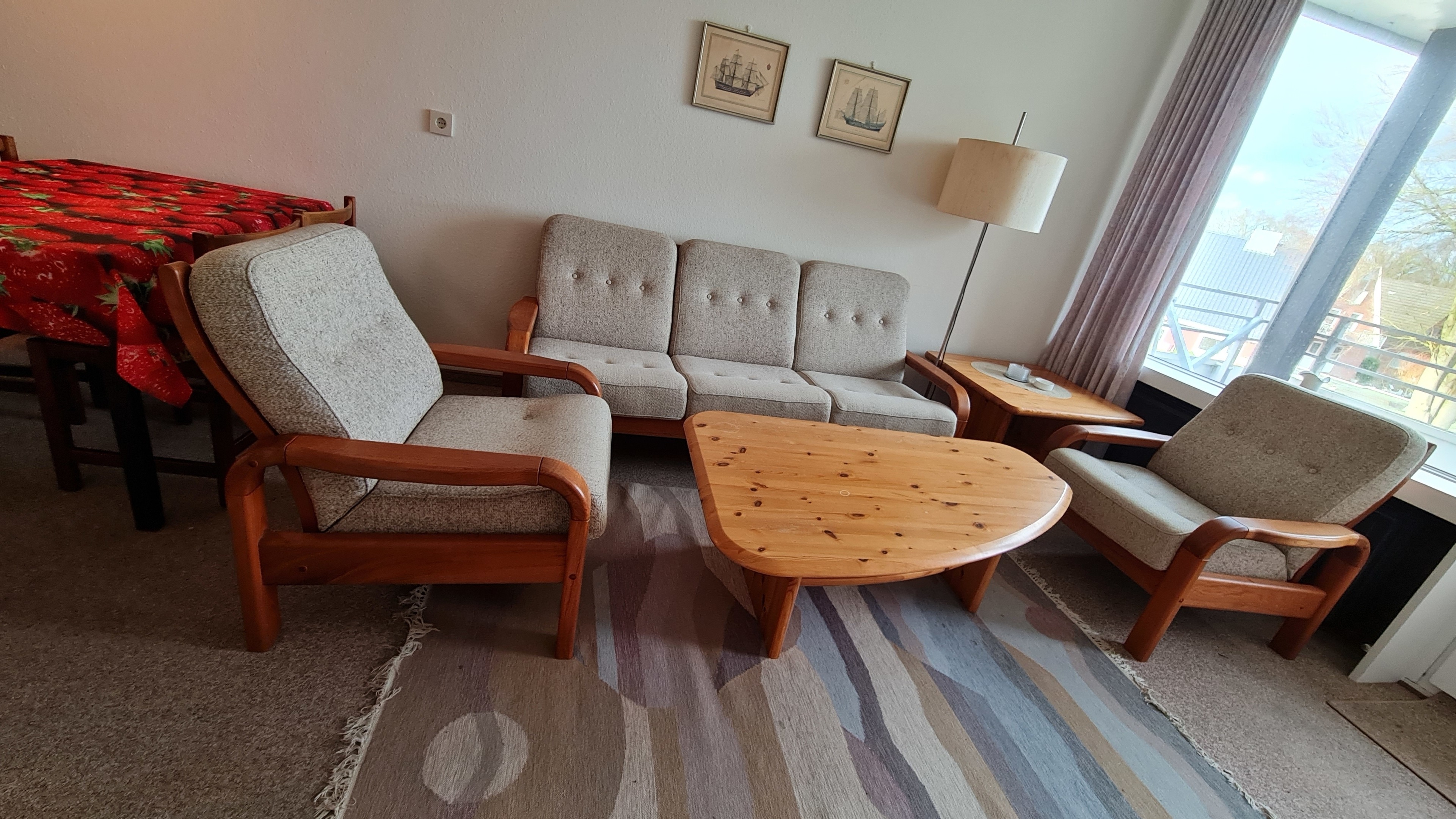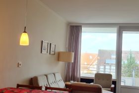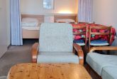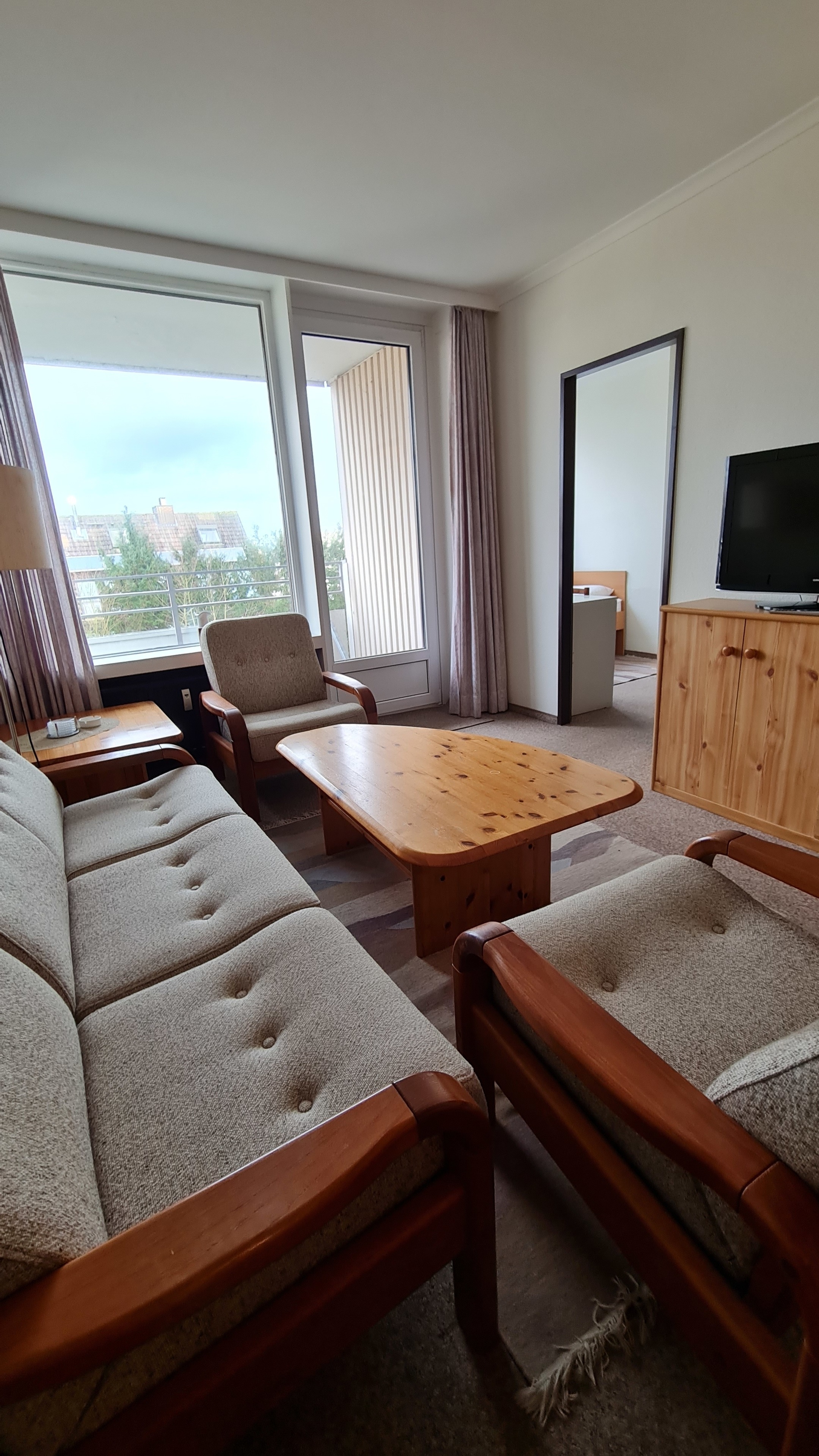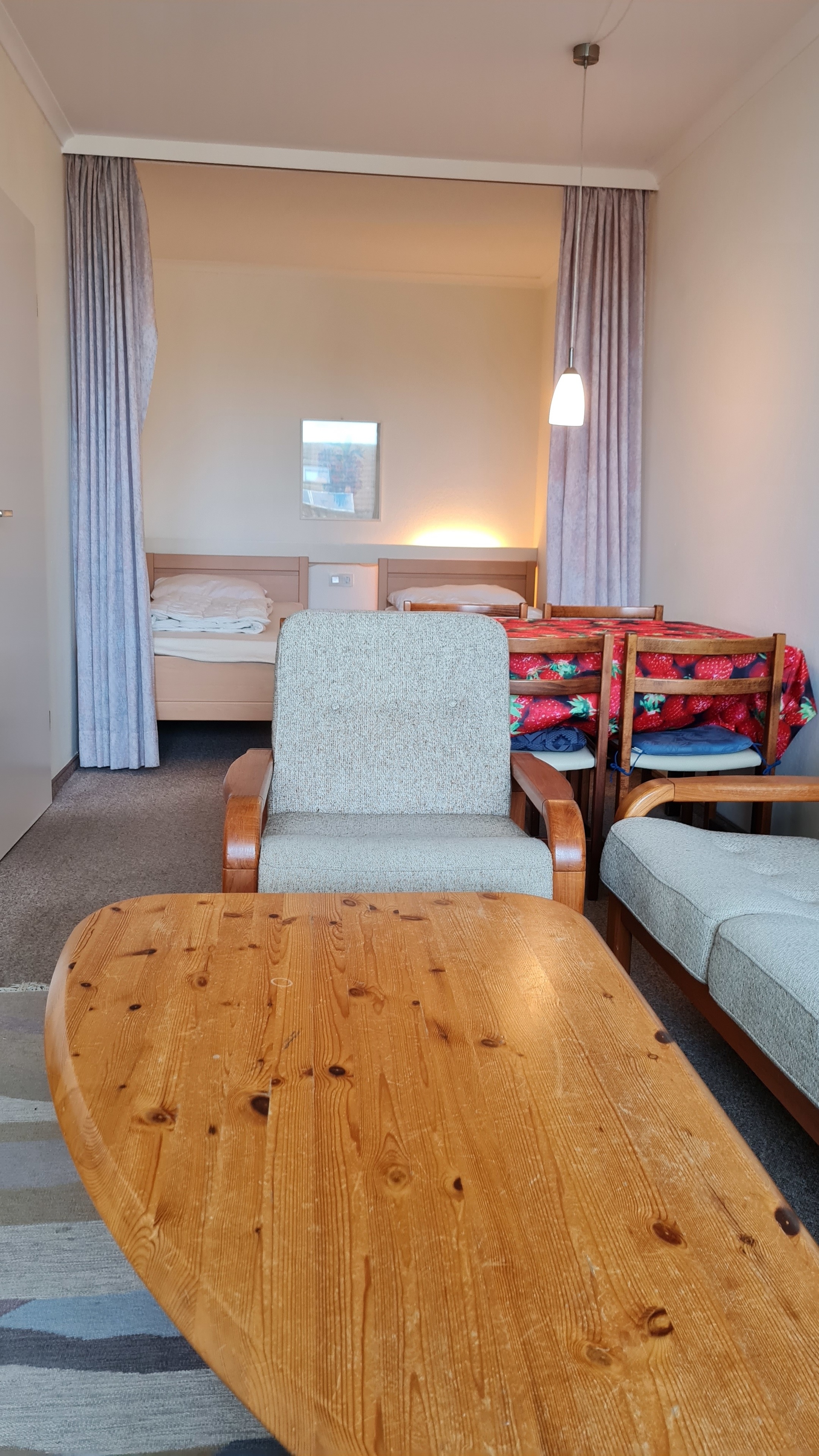 Im Wohn/Schlafbereich lädt die gemütliche Couch an regnerischen Tagen zum Verweilen ein. Hier befindet sich ein FlachTV und Zugang zum Balkon. Des Weiteren befindet sich ein Esstisch inkl. 4 Stühlen im Wohnbereich. In dem hier, per Vorhang abgetrenntem Schlafbereich können 2 Personen bequem auf den Einzelbetten nächtigen.