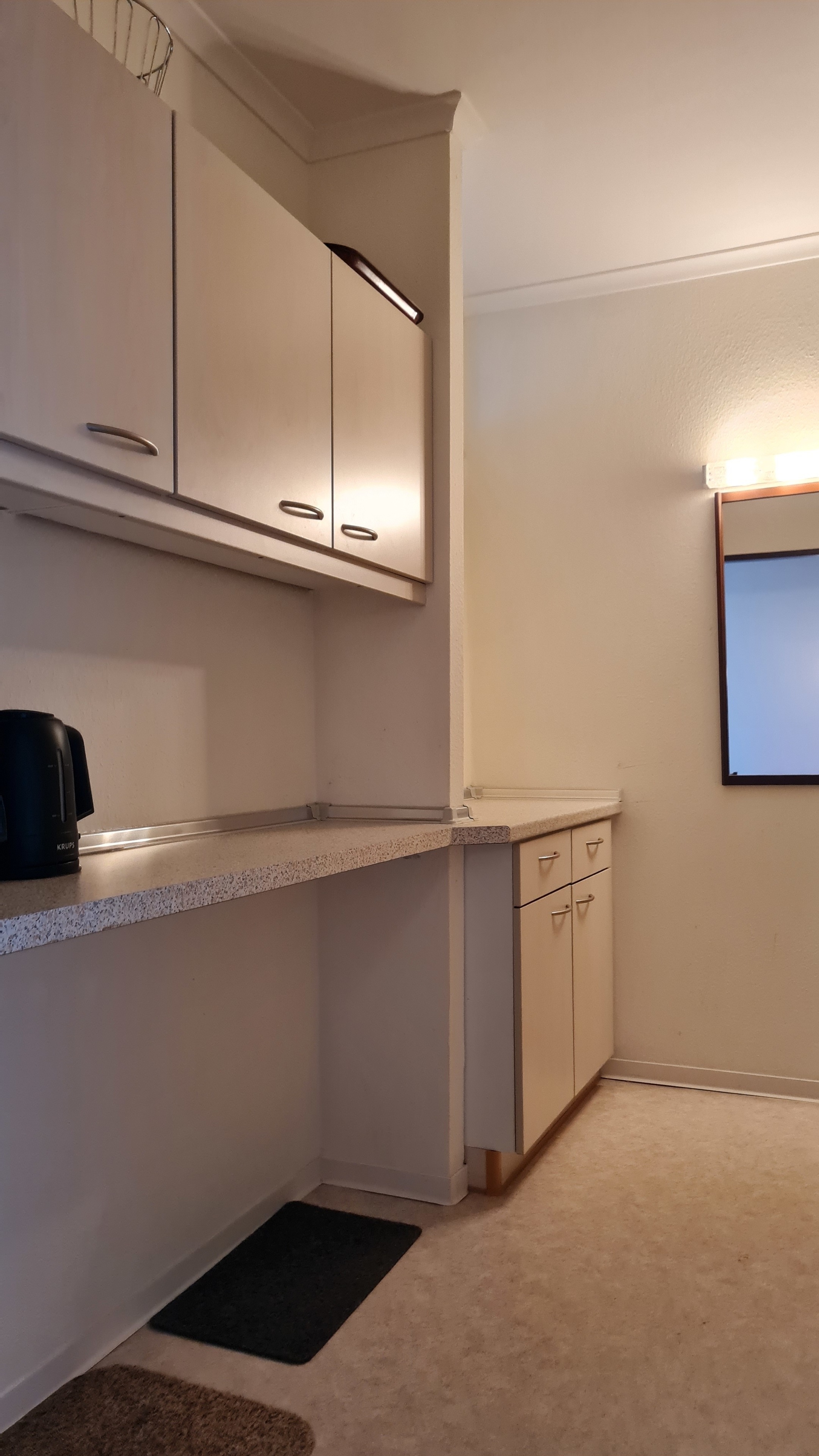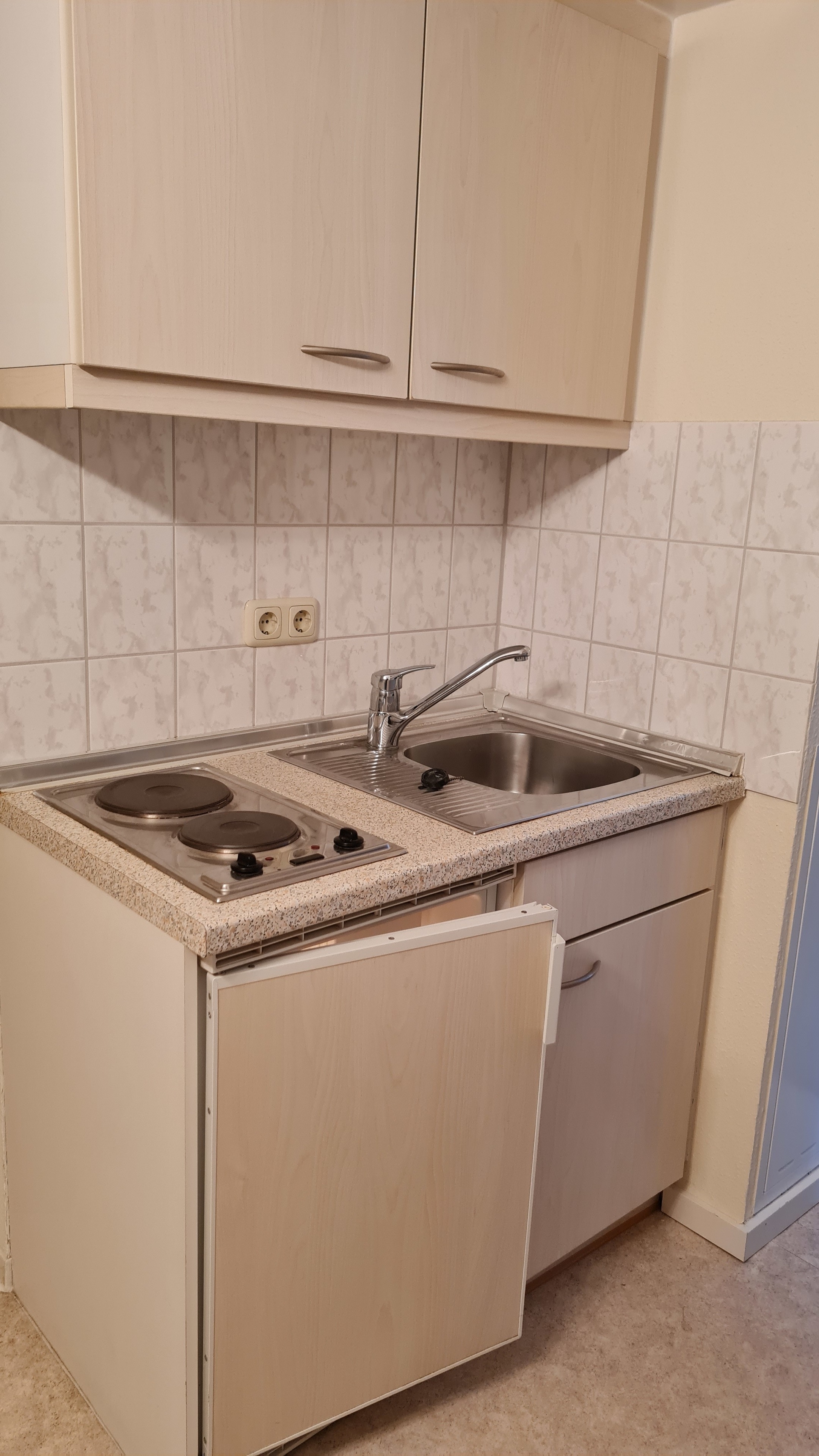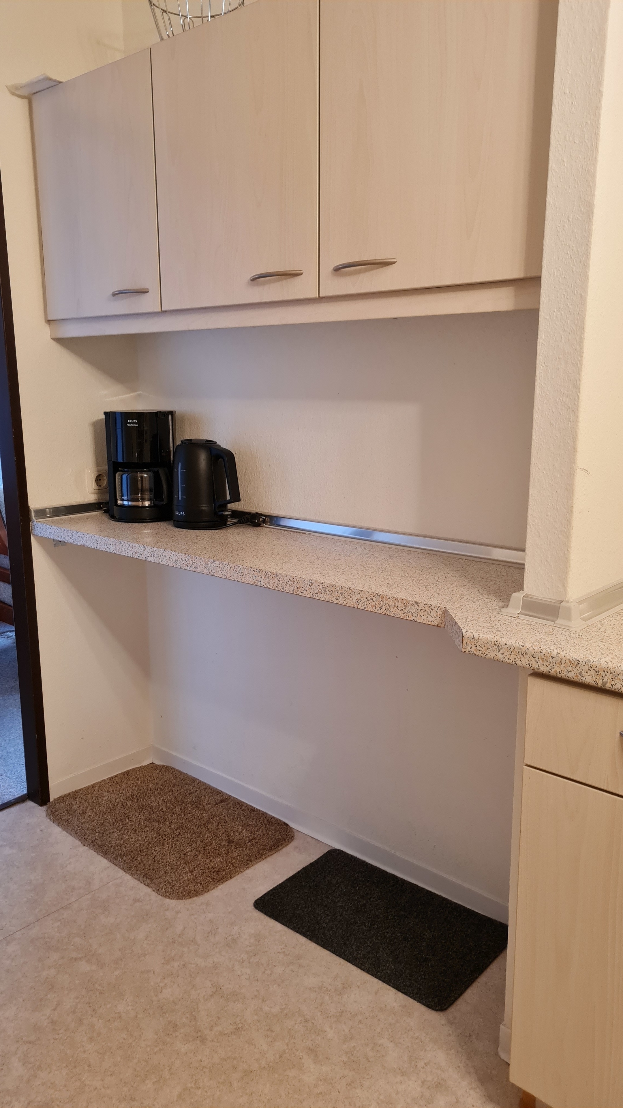 In der separaten Küche befindet sich eine Pantry- Küche mit Kühlschrank, zwei Kochfeldern und ein Kaffeeautomat.