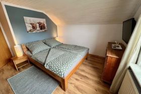 Die Schlafzimmer befinden sich im Obergeschoss (Treppe): Schlafzimmer 1 mit Doppelbett (160 cm breit) und Schlafzimmer 2 mit zwei Einzelbetten (140 cm und 100 cm breit). Die Küche ist mit Mikrowelle, Kaffeemaschine, Wasserkocher, Toaster, Spülmaschine und viel Geschirr sehr gut ausgestattet. Eine Waschmaschine ist ebenfalls vorhanden wie auch WLAN-Internetzugang, Kabelanschluss. Das Wohnzimmer ist mit einem Kamin ausgestattet, dort finden Sie auch viele Bücher und Brettspiele, die den Urlaubsabend in der Familie perfekt machen.