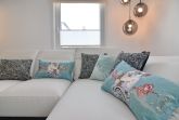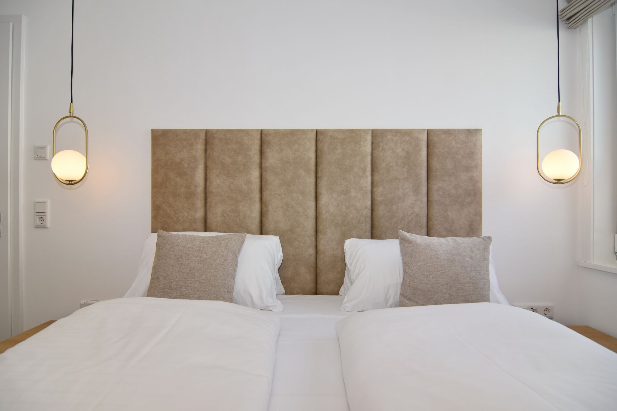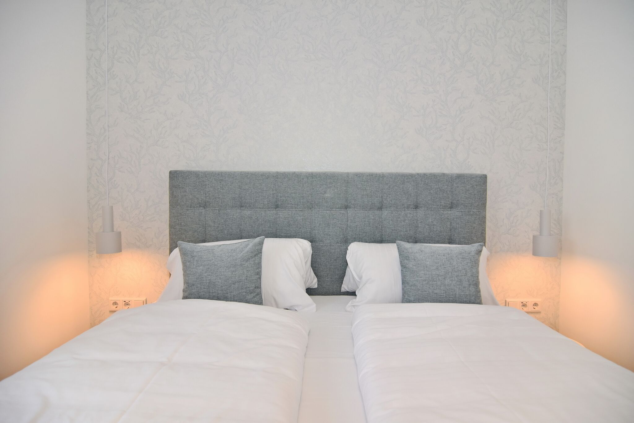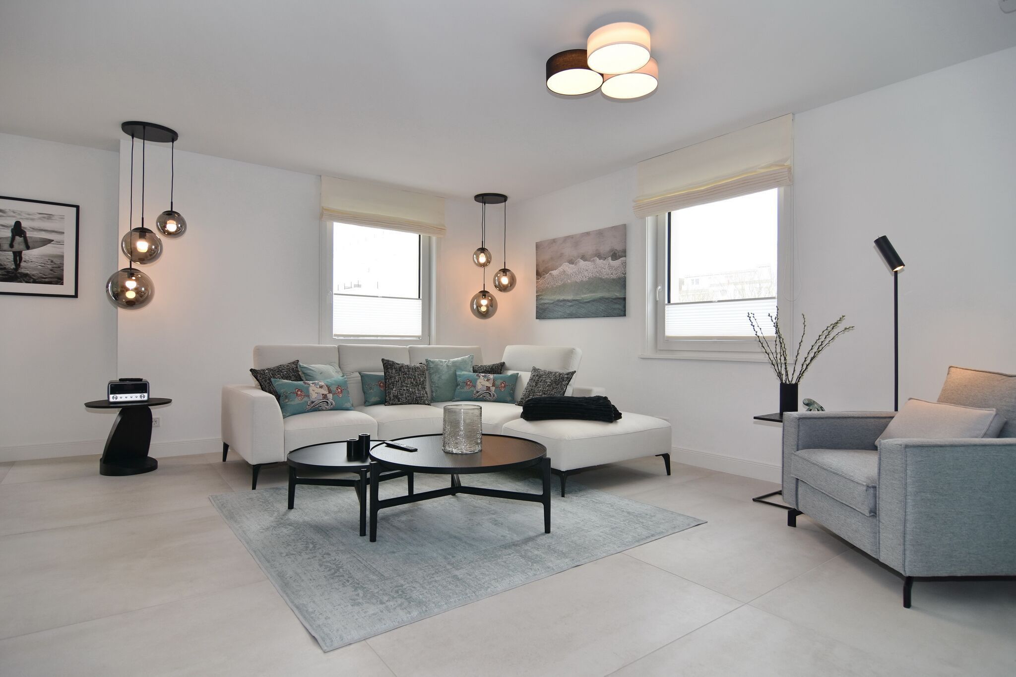 Die hochwertige 3-Zimmer-Wohnung im 1. OG mit ca. 80 qm ist für maximal 4 Personen. Vom geräumigen Flur mit Garderobe gelangen Sie in das Wohnzimmer mit offener Küche und möblierten Westbalkon. Die hochwertige Küche bietet neben Induktionsherd auch Geschirrspüler, Kühlschrank mit Gefrierfach und Backofen mit integrierter Mikrowelle. Beide Schlafräume bieten mit Boxspringbetten (180x200) der Marke FBF hochwertigen Schlafkomfort und verfügen über Einbauschrank und TV (1 Kinderbett im blauen Schlafzimmer zubuchbar). Die Wohnung verfügt über 2 moderne Duschbäder mit Haar- und Handtuchtrockner. Die Wohnung ist mit großformatigen Fliesen ausgelegt und verfügt über Fußbodenheizung. Lediglich die Schlafräume sind mit Teppichware versehen. Internet (ohne Gewähr) und Smart-TV sind vorhanden.