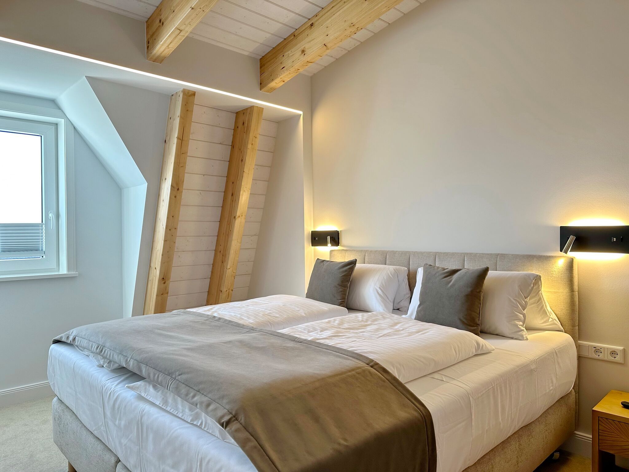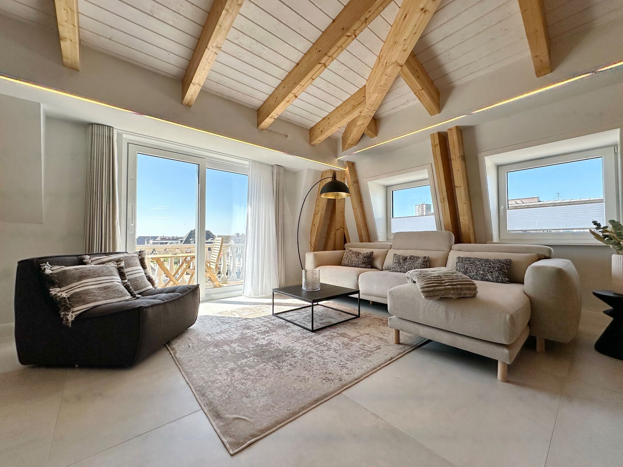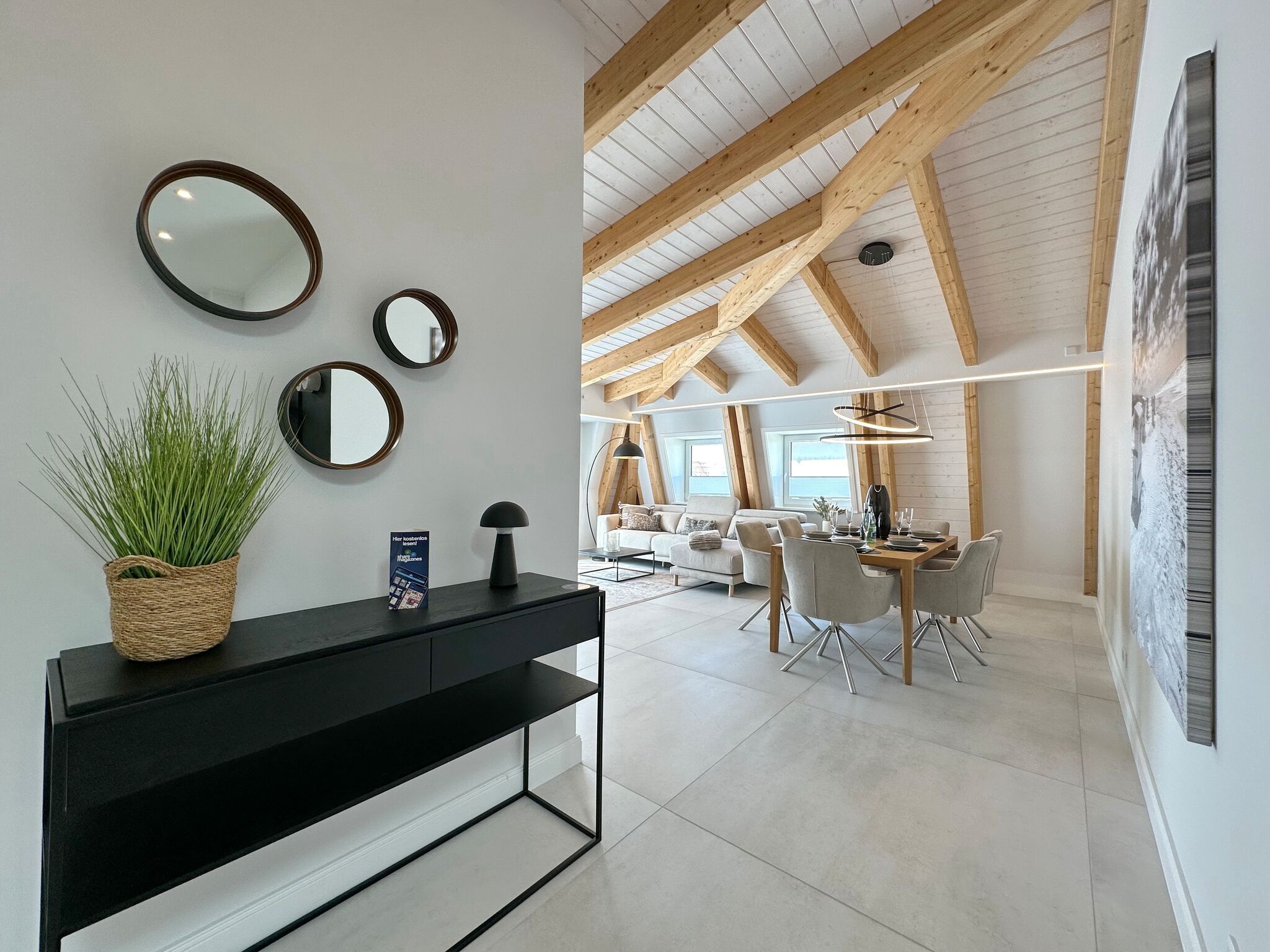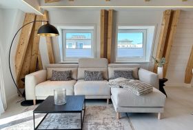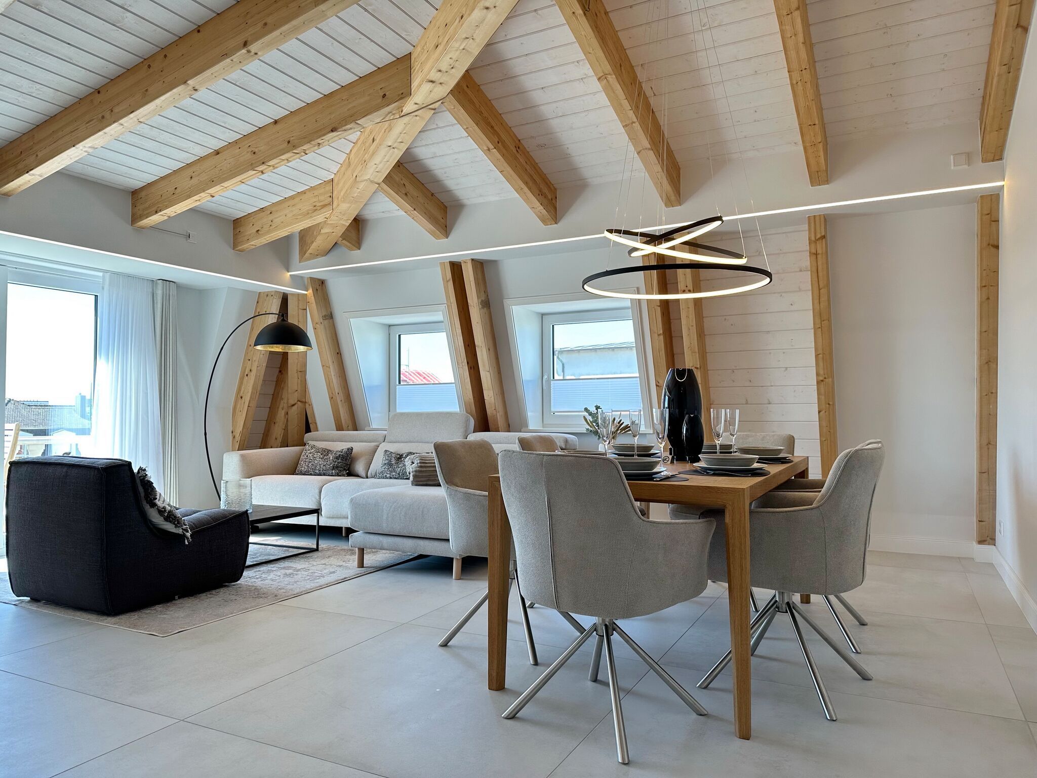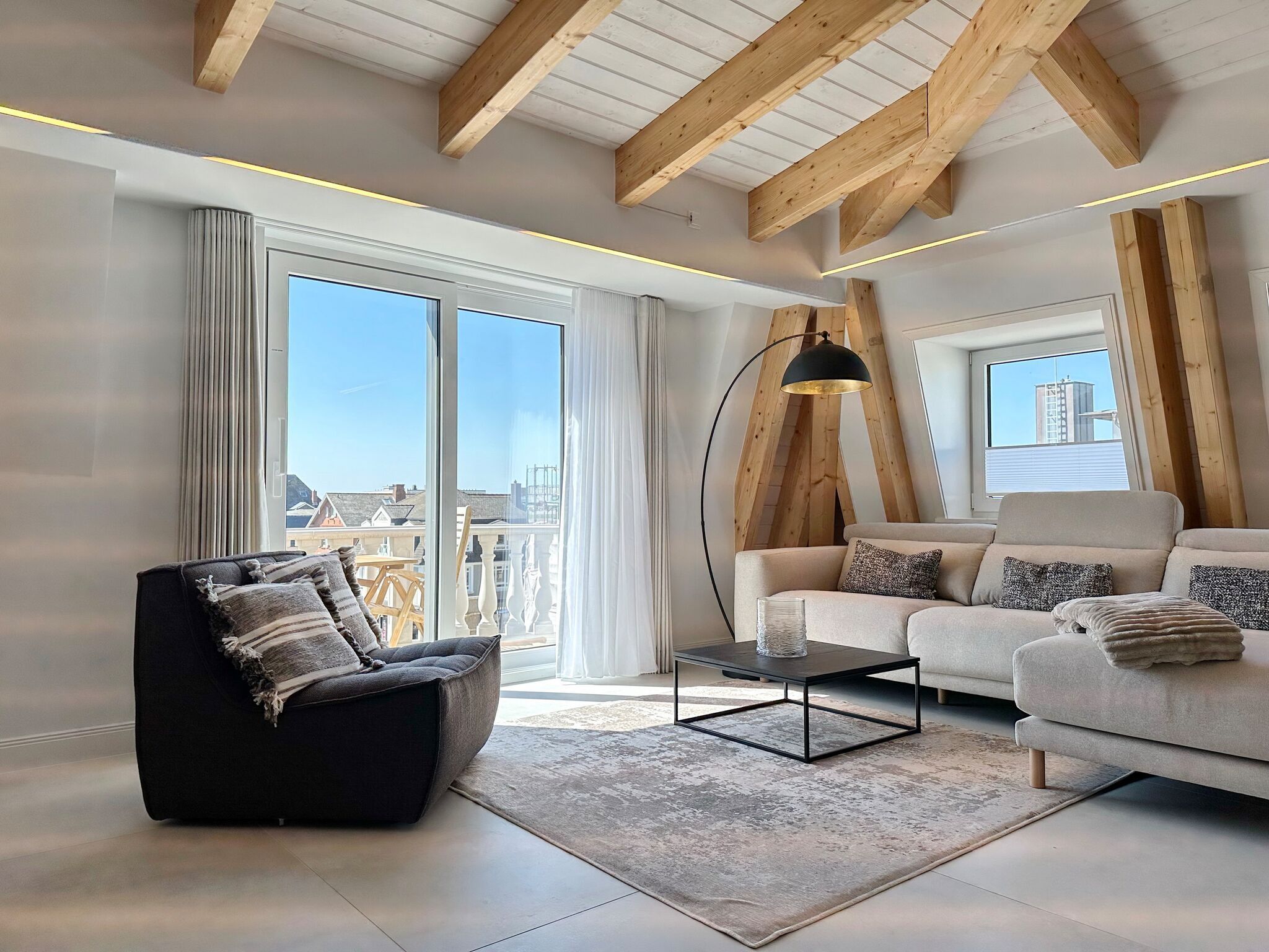 Die hochwertige 4-Zimmer-Wohnung im 3. OG mit ca. 109 qm ist für maximal 6 Personen. Vom geräumigen Flur mit Garderobe gelangen Sie durch die offene Küche in das Wohnzimmer mit Südbalkon. Die hochwertige Küche bietet neben Bora Induktionsherd auch Geschirrspüler, Kühlschrank mit Gefrierfach und Backofen mit integrierter Mikrowelle. Alle Schlafräume bieten mit Boxspringbetten (2x 180x200 und 200x200) der Marke FBF hochwertigen Schlafkomfort und verfügen über Einbauschränke. Das Hauptschlafzimmer verfügt über eine Dusche und separates WC, einen Südbalkon und eine Dachterrasse Richtung Osten. Für die anderen Schlafräume stehen 1 weiteres Duschbad /WC und ein Gäste-WC zur Verfügung (jeweils 1 Kinderbett zubuchbar). Die Wohnung ist mit großformatigen Fliesen ausgelegt und verfügt über Fußbodenheizung. Lediglich die Schlafräume sind mit Teppichware versehen. Internet (ohne Gewähr) und insgesamt 3 Smart-TV sind vorhanden.