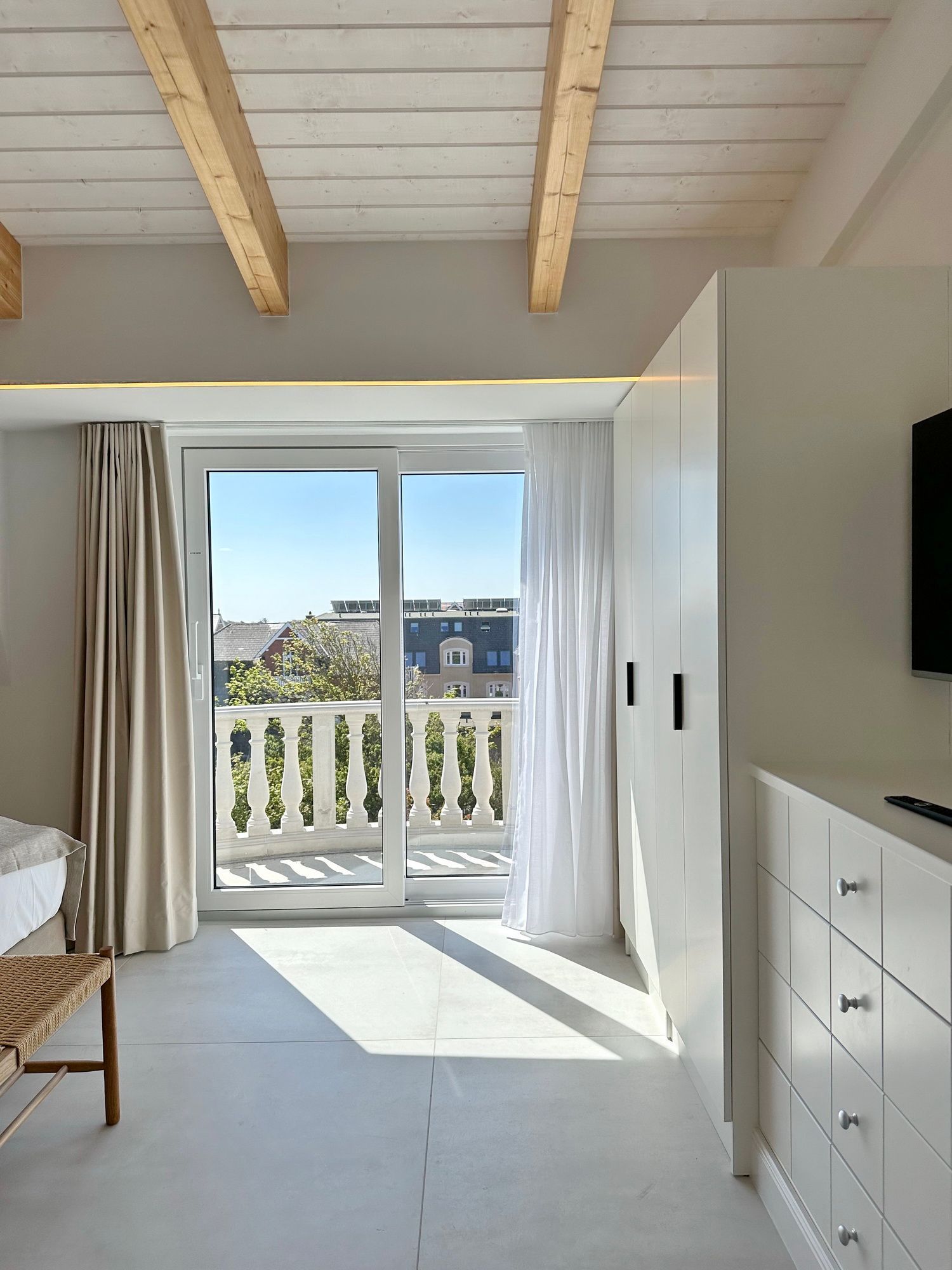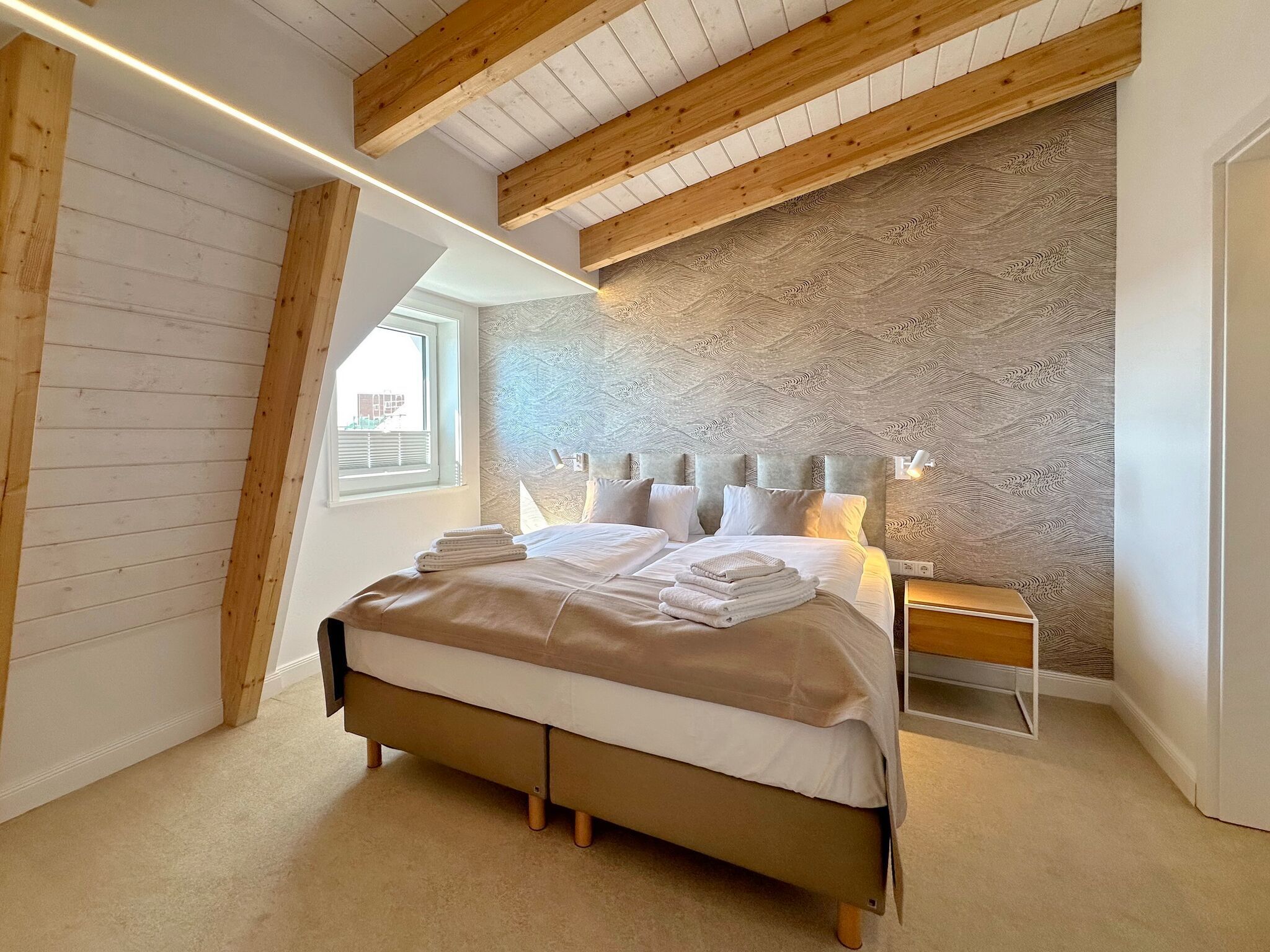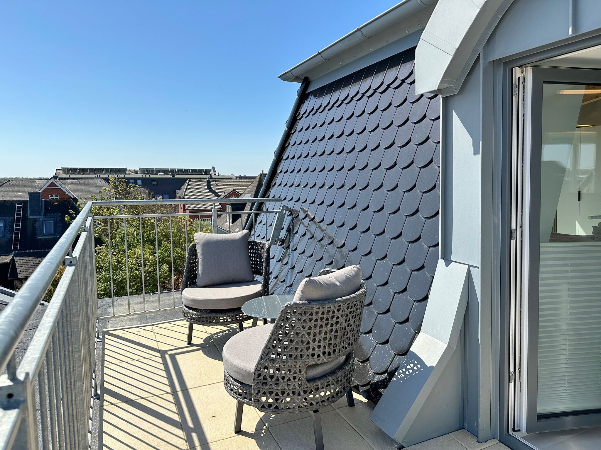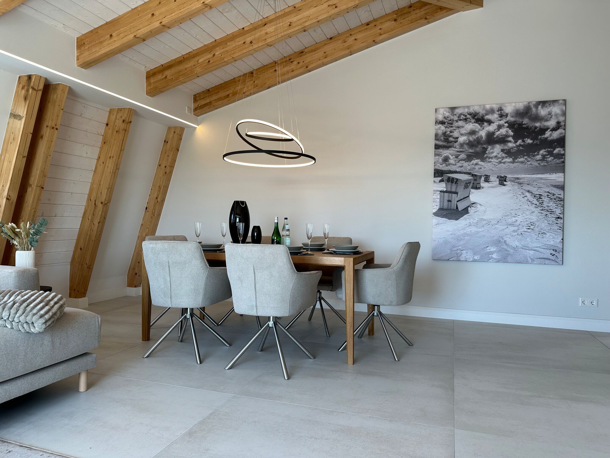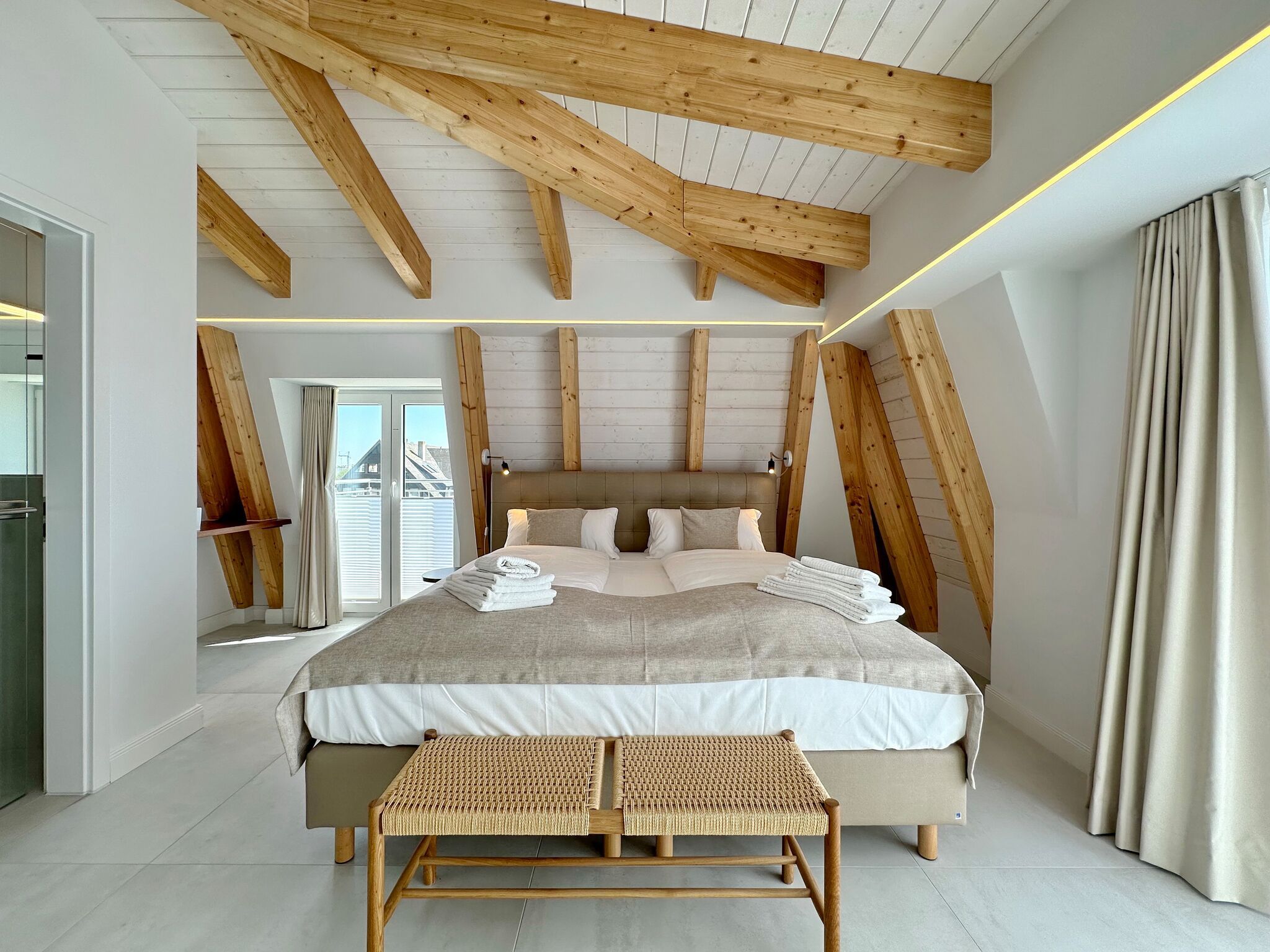 Die hochwertige 4-Zimmer-Wohnung im 3. OG mit ca. 109 qm ist für maximal 6 Personen. Vom geräumigen Flur mit Garderobe gelangen Sie durch die offene Küche in das Wohnzimmer mit Südbalkon. Die hochwertige Küche bietet neben Bora Induktionsherd auch Geschirrspüler, Kühlschrank mit Gefrierfach und Backofen mit integrierter Mikrowelle. Alle Schlafräume bieten mit Boxspringbetten (2x 180x200 und 200x200) der Marke FBF hochwertigen Schlafkomfort und verfügen über Einbauschränke. Das Hauptschlafzimmer verfügt über eine Dusche und separates WC, einen Südbalkon und eine Dachterrasse Richtung Osten. Für die anderen Schlafräume stehen 1 weiteres Duschbad /WC und ein Gäste-WC zur Verfügung (jeweils 1 Kinderbett zubuchbar). Die Wohnung ist mit großformatigen Fliesen ausgelegt und verfügt über Fußbodenheizung. Lediglich die Schlafräume sind mit Teppichware versehen. Internet (ohne Gewähr) und insgesamt 3 Smart-TV sind vorhanden.