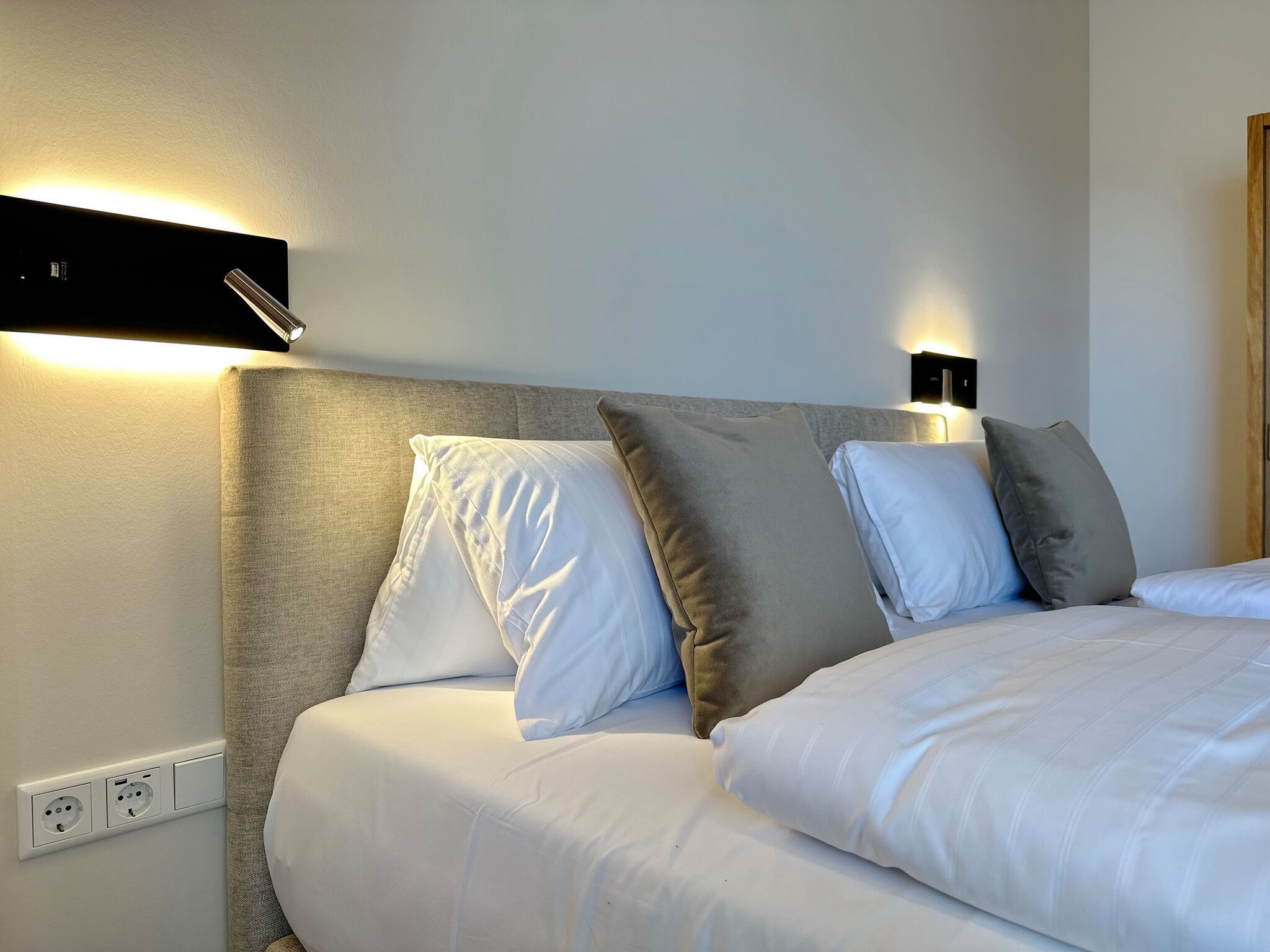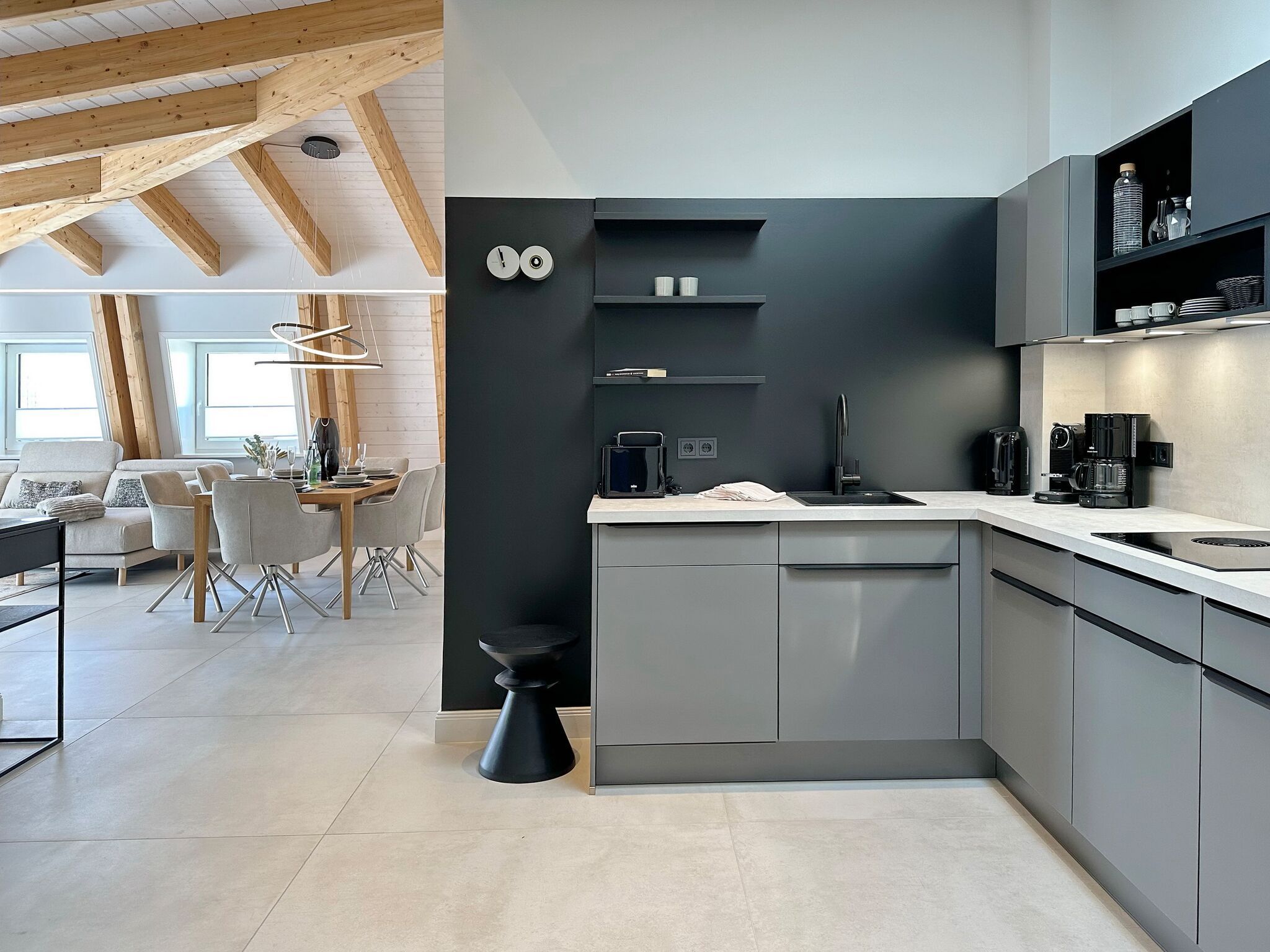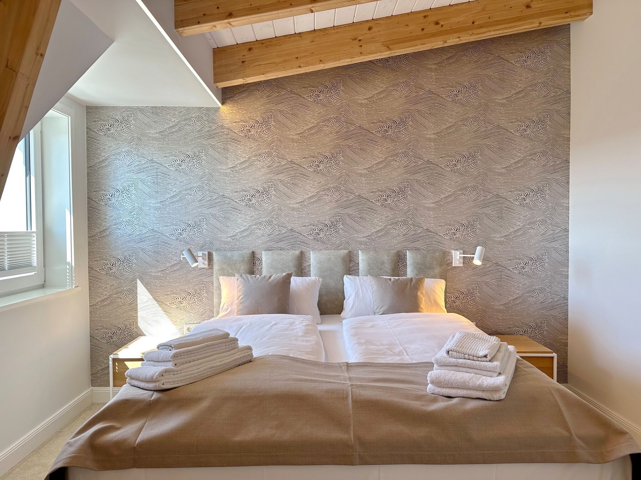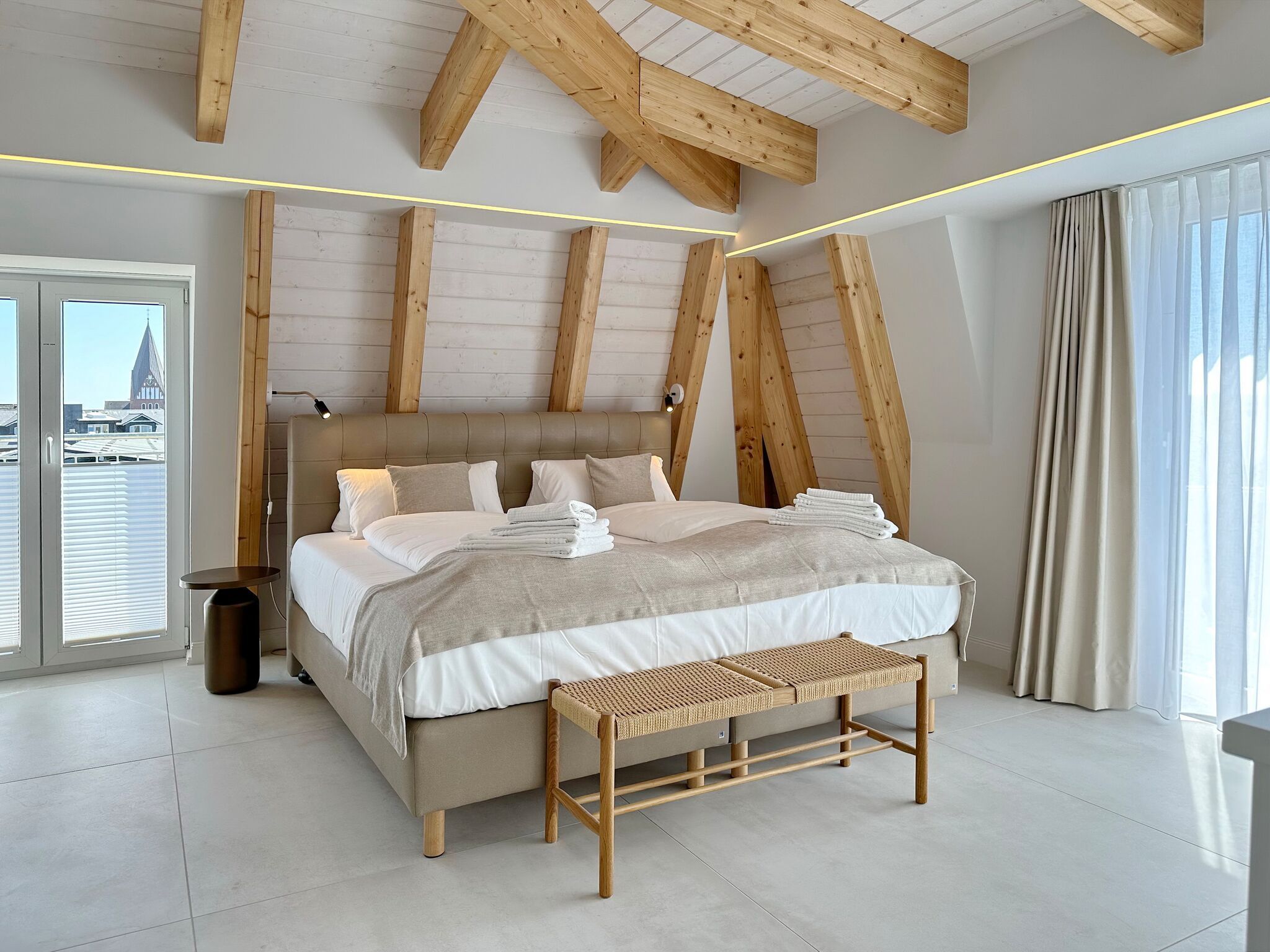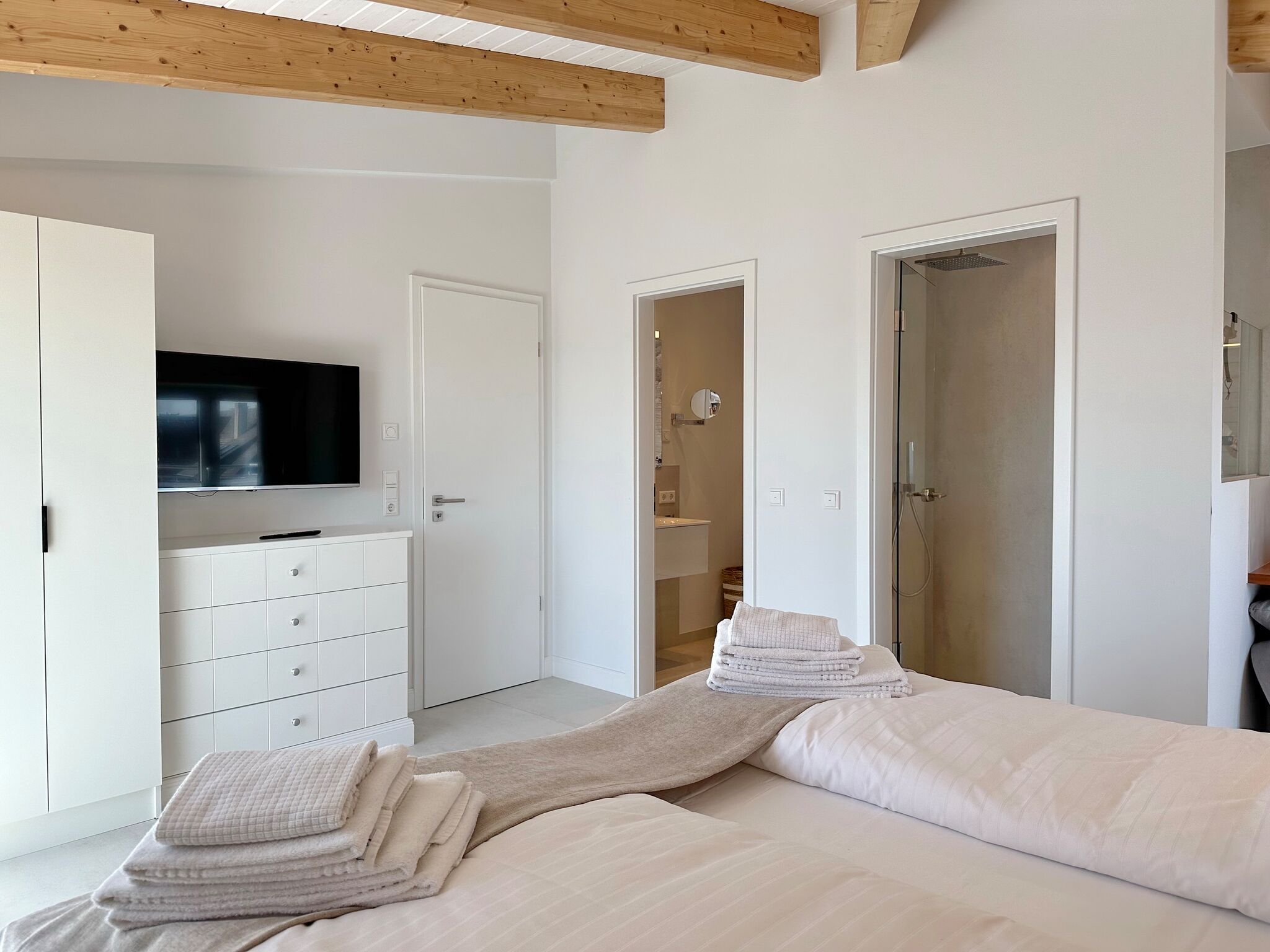 Die hochwertige 4-Zimmer-Wohnung im 3. OG mit ca. 109 qm ist für maximal 6 Personen. Vom geräumigen Flur mit Garderobe gelangen Sie durch die offene Küche in das Wohnzimmer mit Südbalkon. Die hochwertige Küche bietet neben Bora Induktionsherd auch Geschirrspüler, Kühlschrank mit Gefrierfach und Backofen mit integrierter Mikrowelle. Alle Schlafräume bieten mit Boxspringbetten (2x 180x200 und 200x200) der Marke FBF hochwertigen Schlafkomfort und verfügen über Einbauschränke. Das Hauptschlafzimmer verfügt über eine Dusche und separates WC, einen Südbalkon und eine Dachterrasse Richtung Osten. Für die anderen Schlafräume stehen 1 weiteres Duschbad /WC und ein Gäste-WC zur Verfügung (jeweils 1 Kinderbett zubuchbar). Die Wohnung ist mit großformatigen Fliesen ausgelegt und verfügt über Fußbodenheizung. Lediglich die Schlafräume sind mit Teppichware versehen. Internet (ohne Gewähr) und insgesamt 3 Smart-TV sind vorhanden.