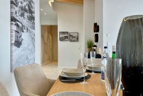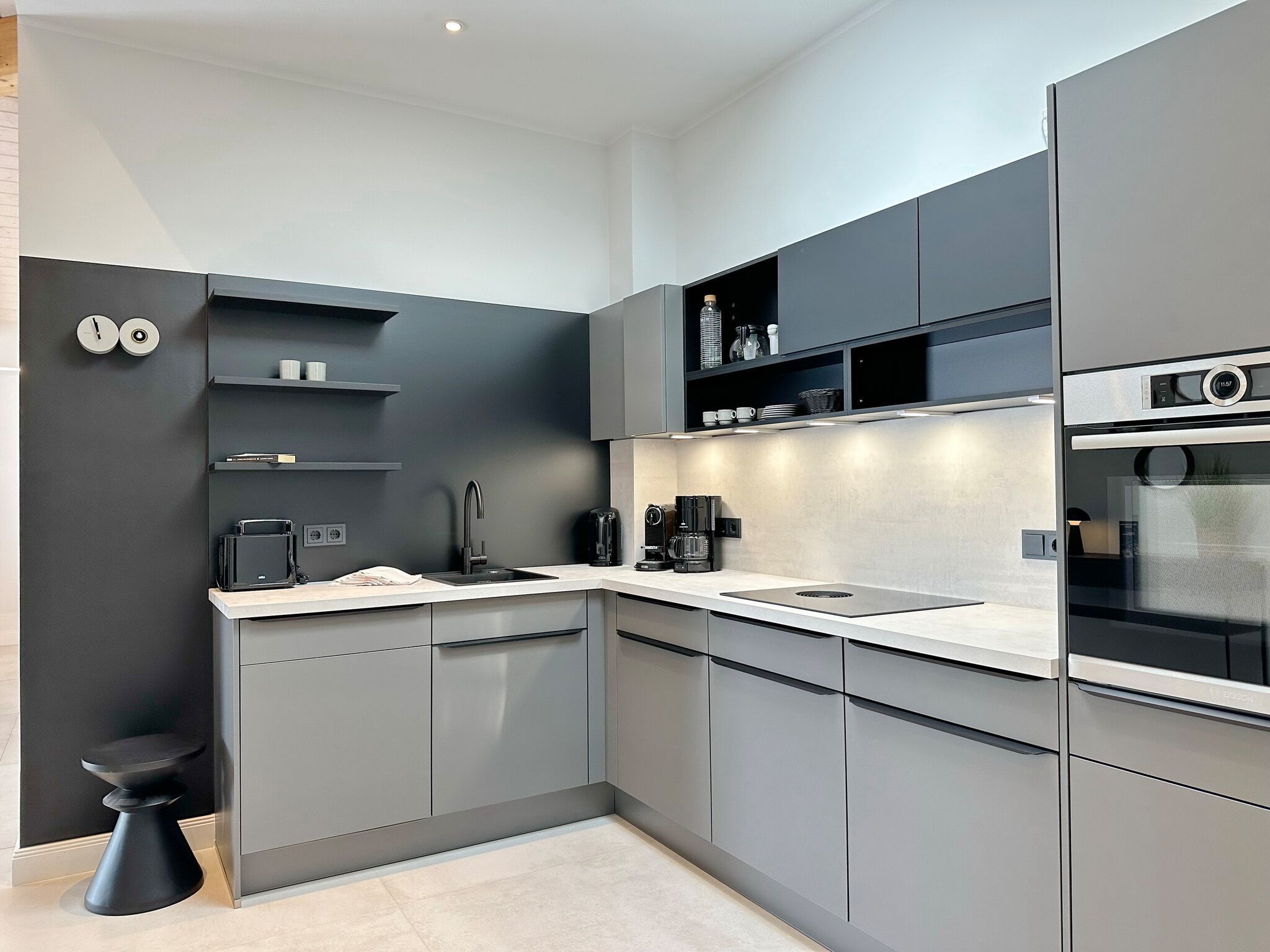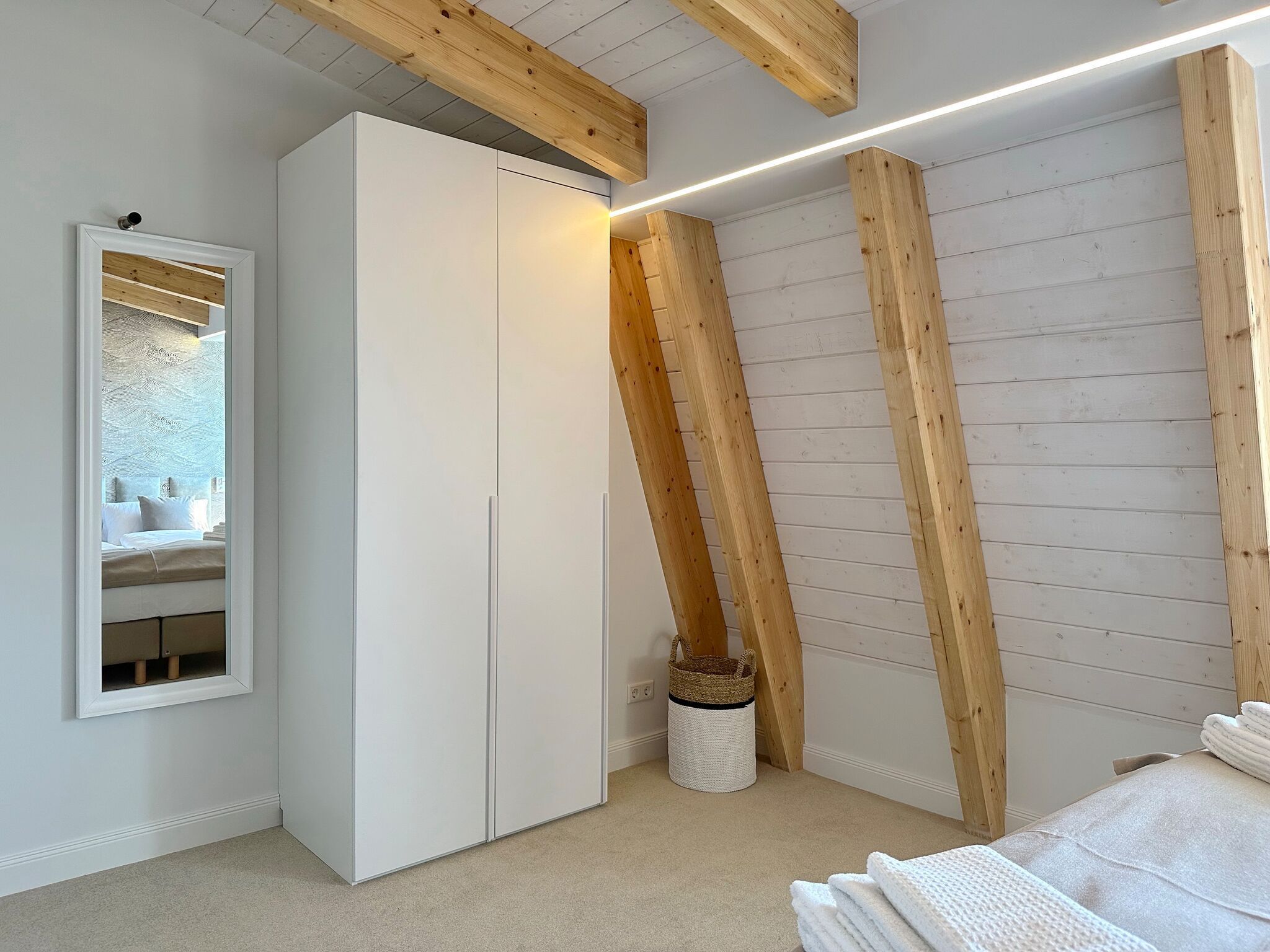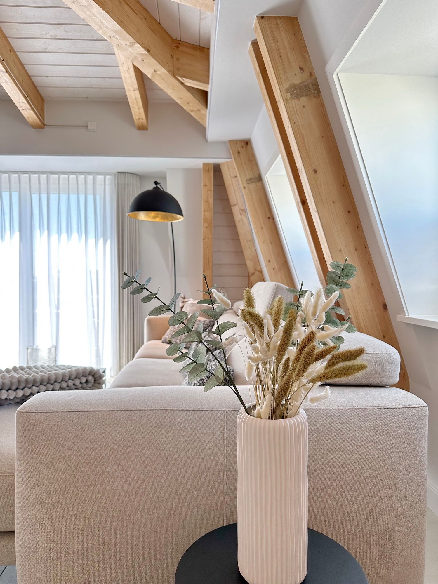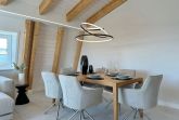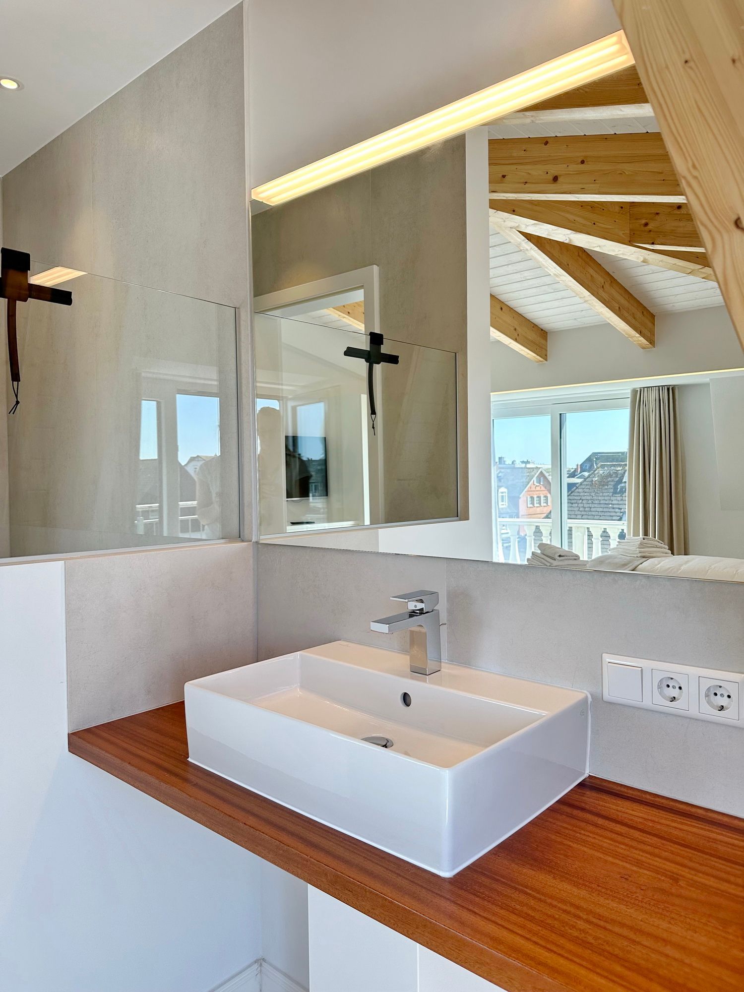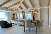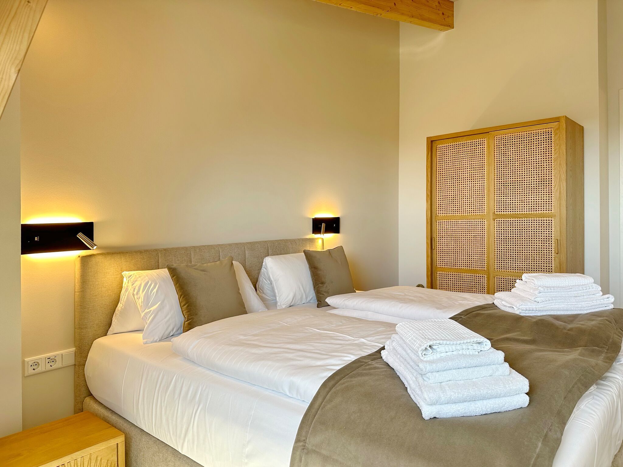 Die hochwertige 4-Zimmer-Wohnung im 3. OG mit ca. 109 qm ist für maximal 6 Personen. Vom geräumigen Flur mit Garderobe gelangen Sie durch die offene Küche in das Wohnzimmer mit Südbalkon. Die hochwertige Küche bietet neben Bora Induktionsherd auch Geschirrspüler, Kühlschrank mit Gefrierfach und Backofen mit integrierter Mikrowelle. Alle Schlafräume bieten mit Boxspringbetten (2x 180x200 und 200x200) der Marke FBF hochwertigen Schlafkomfort und verfügen über Einbauschränke. Das Hauptschlafzimmer verfügt über eine Dusche und separates WC, einen Südbalkon und eine Dachterrasse Richtung Osten. Für die anderen Schlafräume stehen 1 weiteres Duschbad /WC und ein Gäste-WC zur Verfügung (jeweils 1 Kinderbett zubuchbar). Die Wohnung ist mit großformatigen Fliesen ausgelegt und verfügt über Fußbodenheizung. Lediglich die Schlafräume sind mit Teppichware versehen. Internet (ohne Gewähr) und insgesamt 3 Smart-TV sind vorhanden.