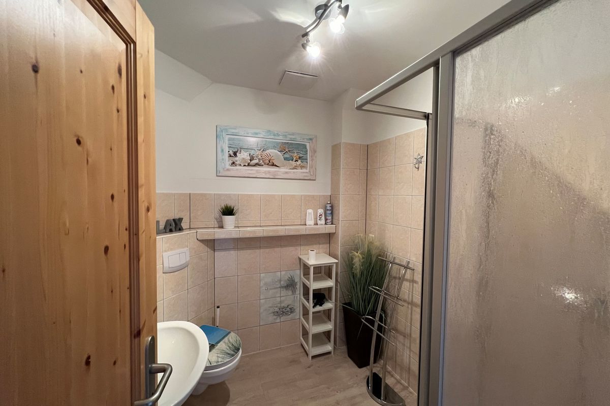 • ein Badezimmer mit WC/Dusche und ein Gästebad im oberen Bereich (nur WC)