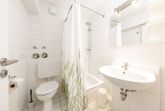Das Badezimmer ist hell gefliest und ist mit einer Dusche, WC und einem Fön eingerichtet. Hier können Sie sich nach einem entspannten Tag am Strand erfrischen.