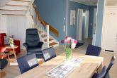 Im Erdgeschoss erwartet Sie ein großzügiger, lichtdurchfluteter Wohn-/Essbereich mit Echtholzmöbeln und einer voll ausgestatteten (Backofen, Induktionskochfeld, Kühlschrank, Gefrierschrank für den größeren Einkauf, Geschirrspüler, Mikrowelle, Kaffeemaschine, Toaster und Wasserkocher) Landhausküche mit direktem Zugang zum großzügigen Garten. Genießen Sie den freien Blick über Wiesen und Felder und entspannen Sie auf der Seelenwiege oder im Strandkorb.