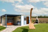 Im Gartenhaus sind Outdoor-Spiele und Bollerwagen plaziert, Fahrräder können hier untergestellt werden.