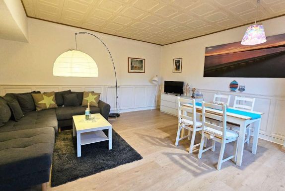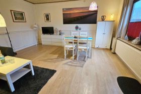 Unsere Wohnung Heupeerd befindet sich in einem ruhig und zentral gelegenem Haus im Ortsteil Dorf. Sie erreichen die Wohnung duch den hinteren Eingang (Parkplatz Seite). Die 53qm Nichtraucher-Ferienwohnung liegt im Erdgeschoss des Hauses und bietet ausreichend Platz für 3 Personen. Direkt beim Eingang finden Sie die grosse Terrasse.
