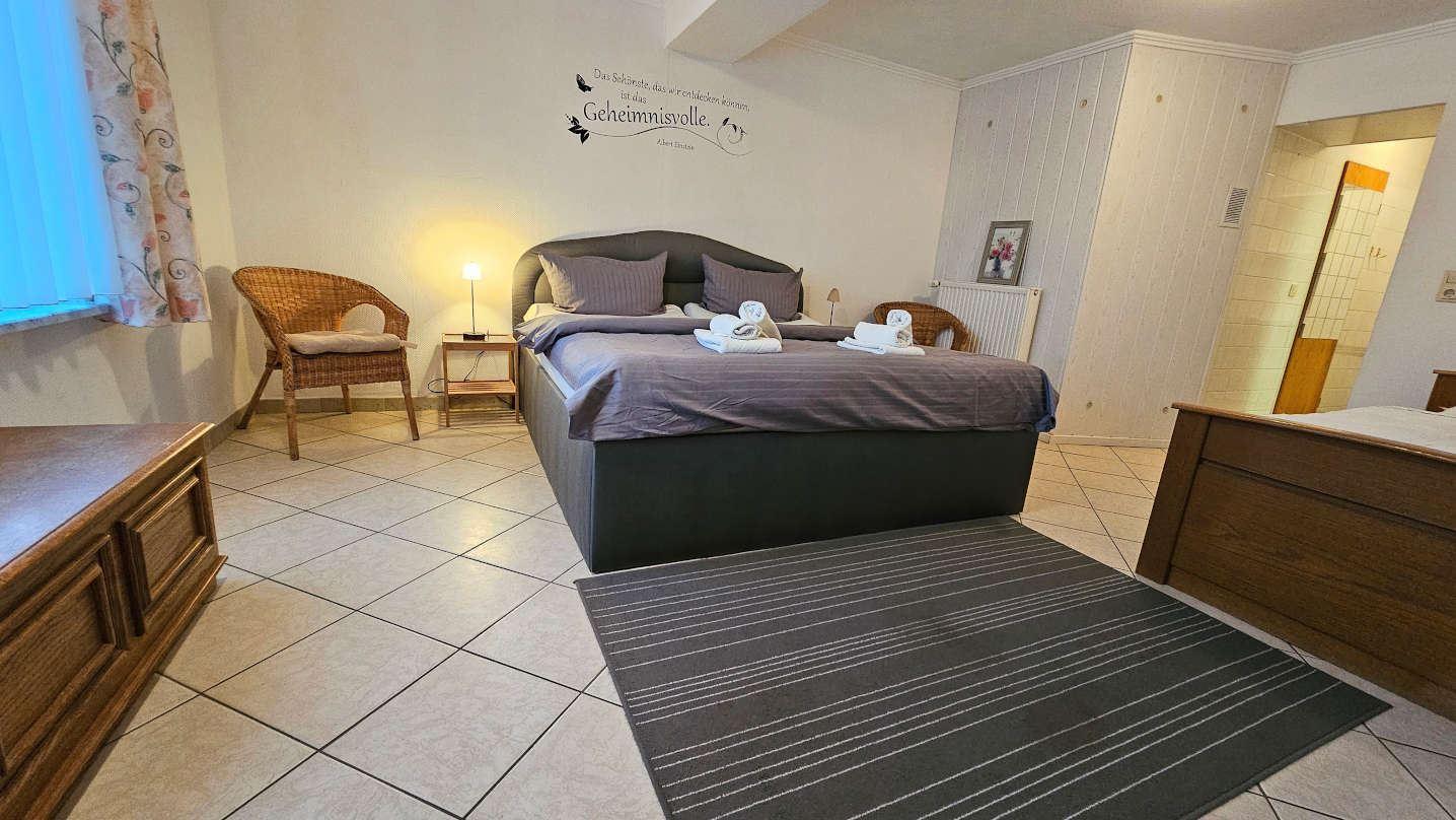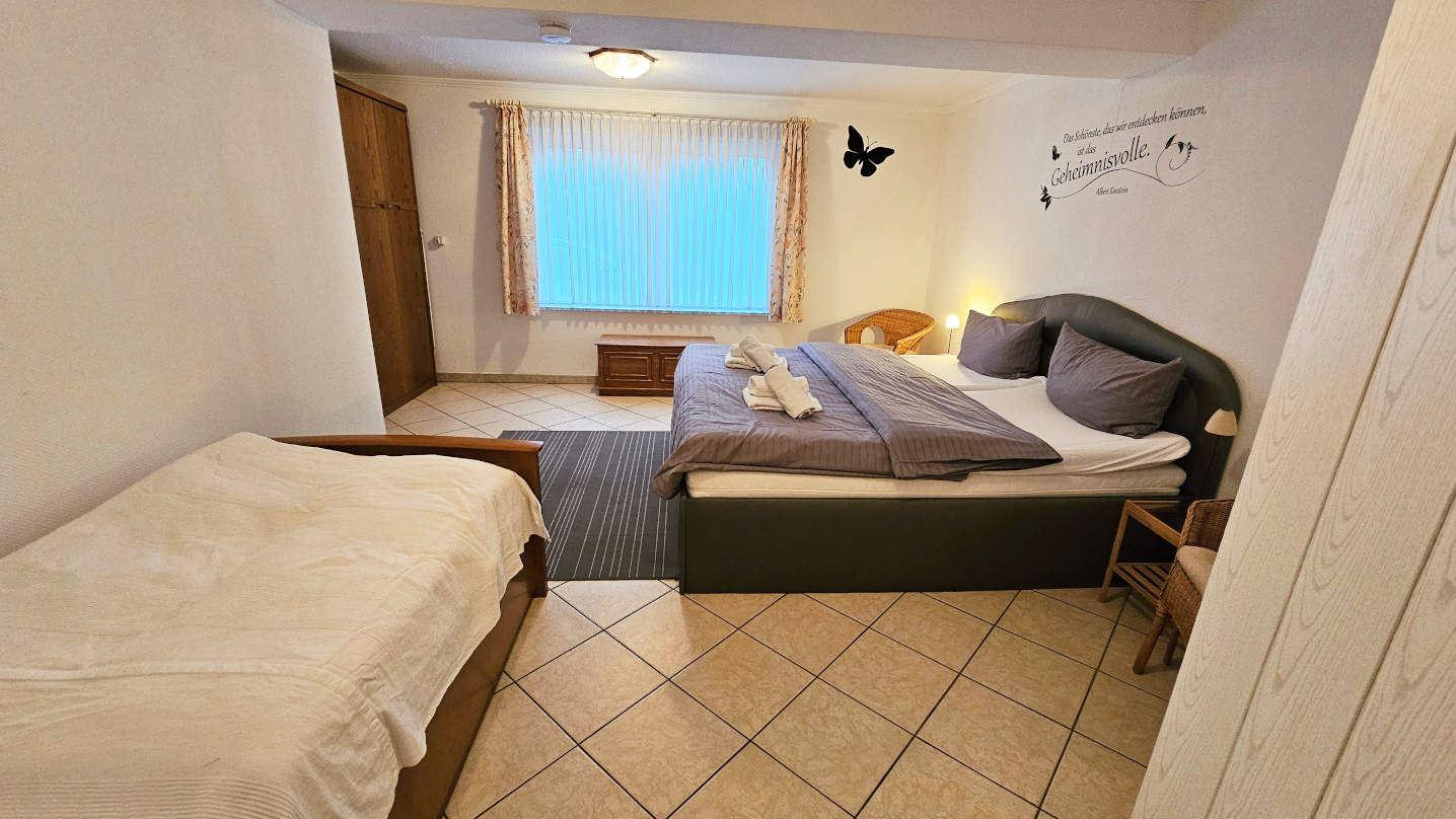 Nach einem ereignisreichen Urlaubstag finden Sie Erholung in einem Schlafzimmer mit Boxspringbett (180x200cm) und einem Einzelbett (80x200cm). Die Betten sind bei Ihrer Anreise frisch bezogen.