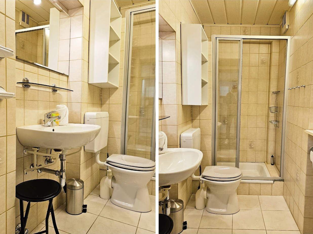 Das Bad verfügt über bodentiefe Dusche, Waschbecken und WC. Handtuchpakete können Sie dazu buchen.