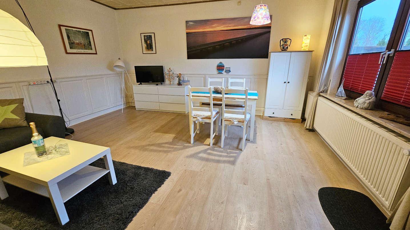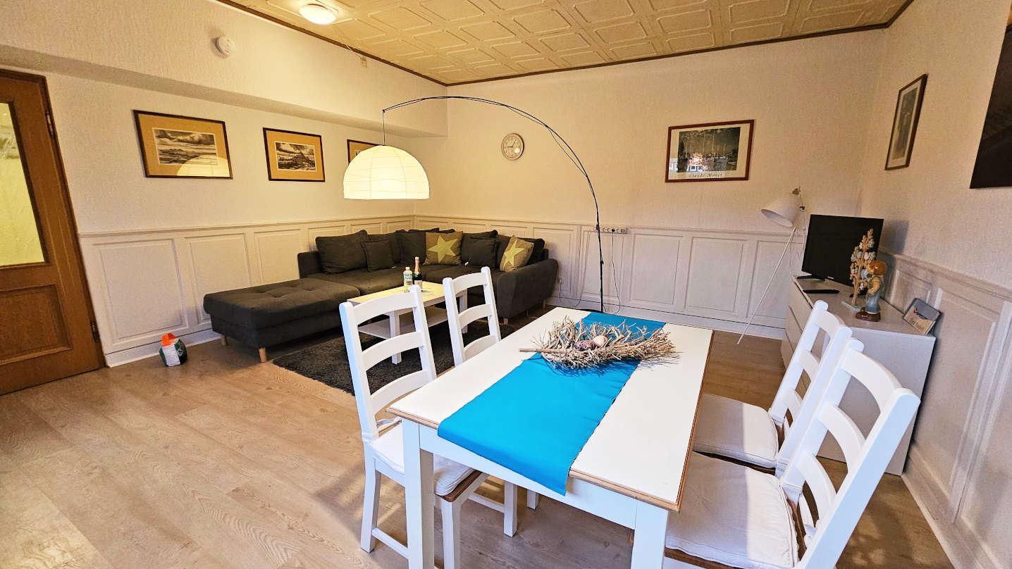 Beim Betreten der Wohnung gelangen Sie in den Wohn-Essbereich. Auf dem gemütlichen Sofa lassen sich entspannte Fernsehstunden verbringen. Am Esstich mit Platz für 4 Personen können Sie ein gemeinsames Früfstück genießen.