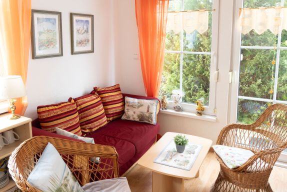 Henneberg, 2-Zimmer-Wohnung 32 m2, im Erdgeschoss. Einfach eingerichtet: Wohn-/Esszimmer mit 1 Diwanbett und Kabel-TV (Flachbildschirm), Radio. 1 Zimmer mit 1 Doppelbett (140 cm, Länge 200 cm). Kochnische (Geschirrspüler, 4 Glaskeramikplatten, Toaster, Wasserkocher, elektrische Kaffeemaschine). Dusche/WC. Terrasse. Terrassenmöbel. Zur Verfügung: Kinderhochstuhl, Babybett. Bitte beachten: Nichtraucher-Unterkunft. Rauchmelder.
