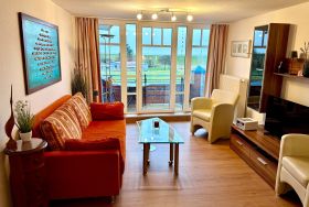 Im Haus gibt es die Möglichkeit, gegen Gebühr den Trockner sowie die Waschmaschine zu nutzen. Von der Wohnung aus hat man einen schönen Meerblick und kann die frische Seeluft auf dem Balkon genießen. Besonders praktisch für Radfahrer ist der Fahrradabstellraum, in dem die Räder sicher untergestellt werden können. Die moderne offene Wohnküche lädt zum gemeinsamen Kochen und Verweilen ein.