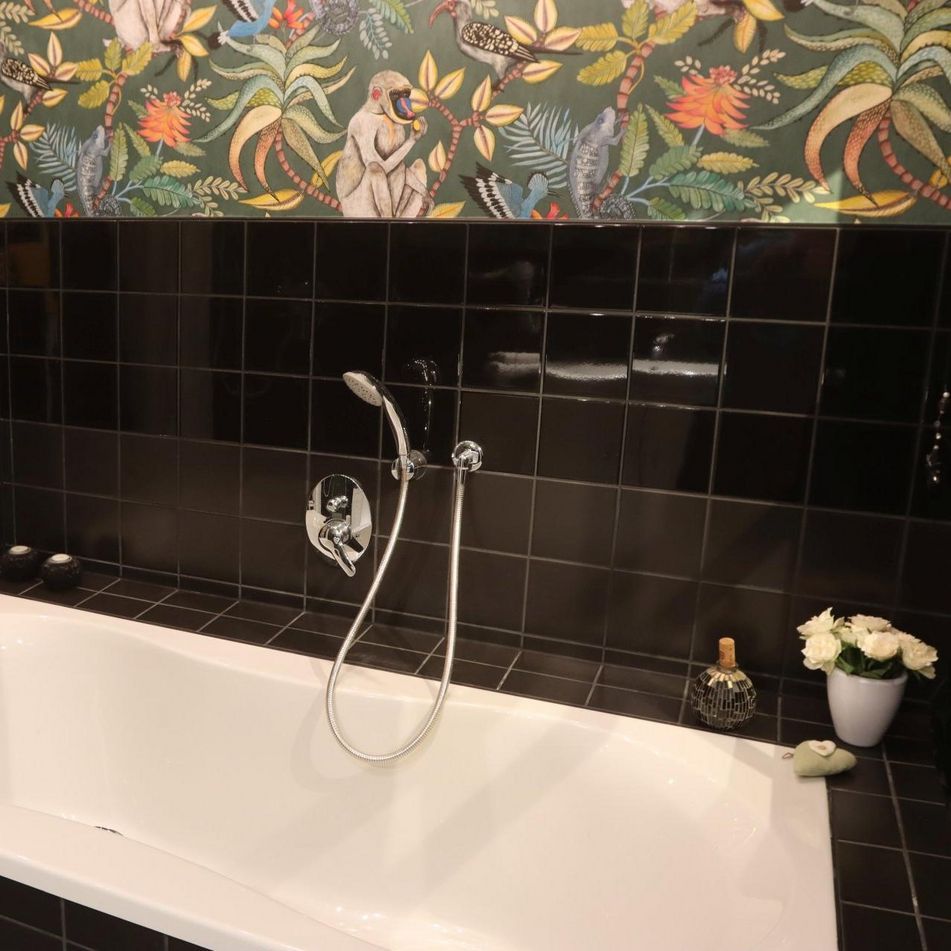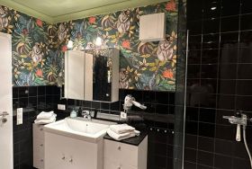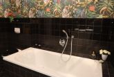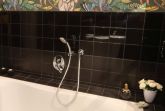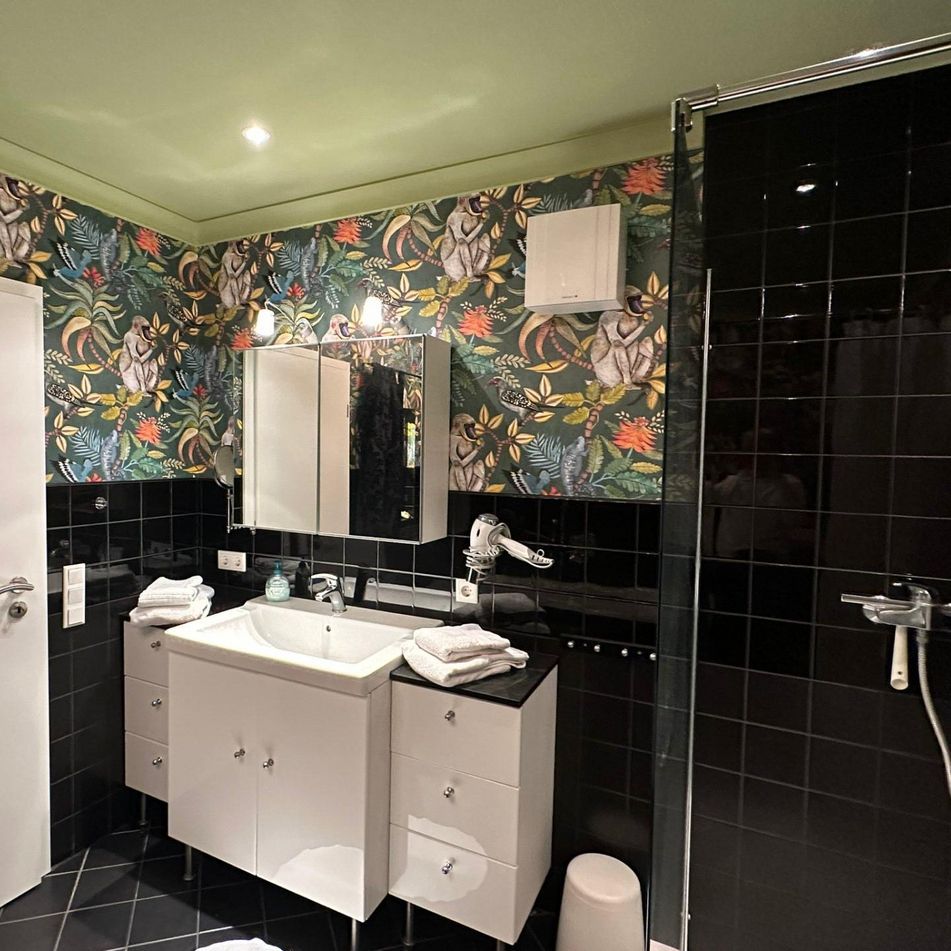 Durch ein kleines Fenster im Flur spitzen Sie in ein schwarz gefliestes Badezimmer mit weißen Möbeln. Bei Kerzenschein unter dem künstlichen Sternenhimmel genießen Sie zu zweit in einer großzügigen Wanne Ihr Traumbad. Die große verglaste Dusche ist eine ebenbürtige alternative.
