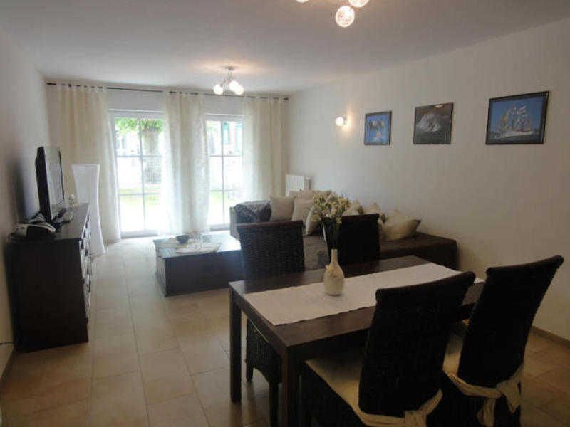 Ihre Ferienwohnung verfügt über ein Wohn- und ein Schlafzimmer. Im Wohnbereich befindet sich eine große Lümmel-Schlafcouch sowie ein Fernseher und ein Radio.