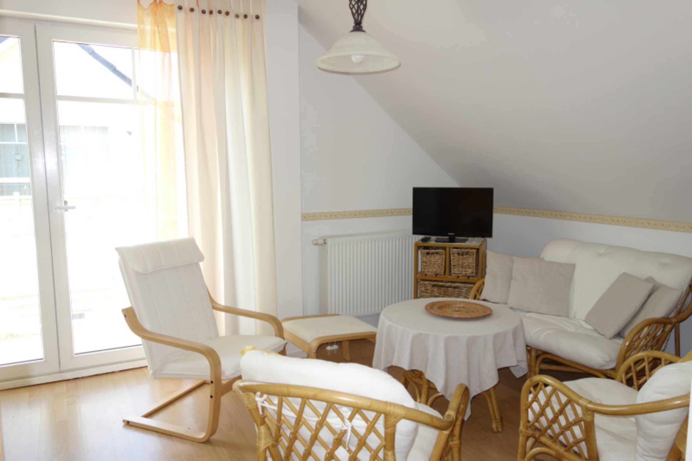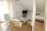 Im Wohn-/Schlafbereich finden Sie ein breites Doppelbett (2x 90x200m) sowie eine Sitzecke mit einem Fernseher und einem Radio.